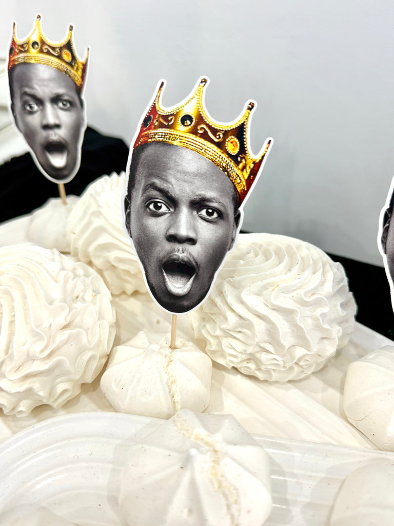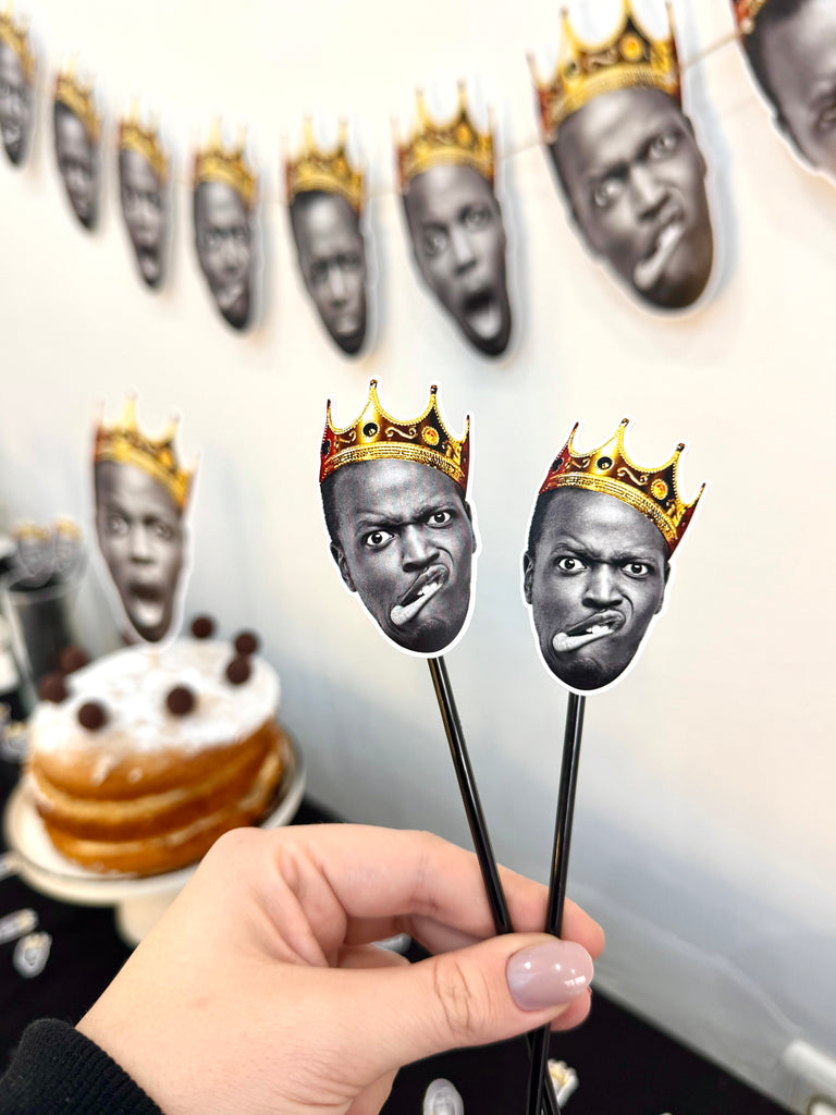 Altın taç detaylı banner, cupcake topper, drink stirrer ve konfeti gibi parçalarla masa düzenine “kral” enerjisi kat.