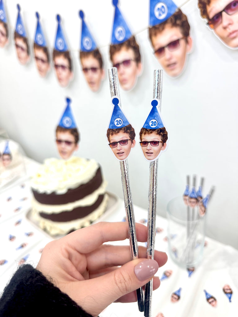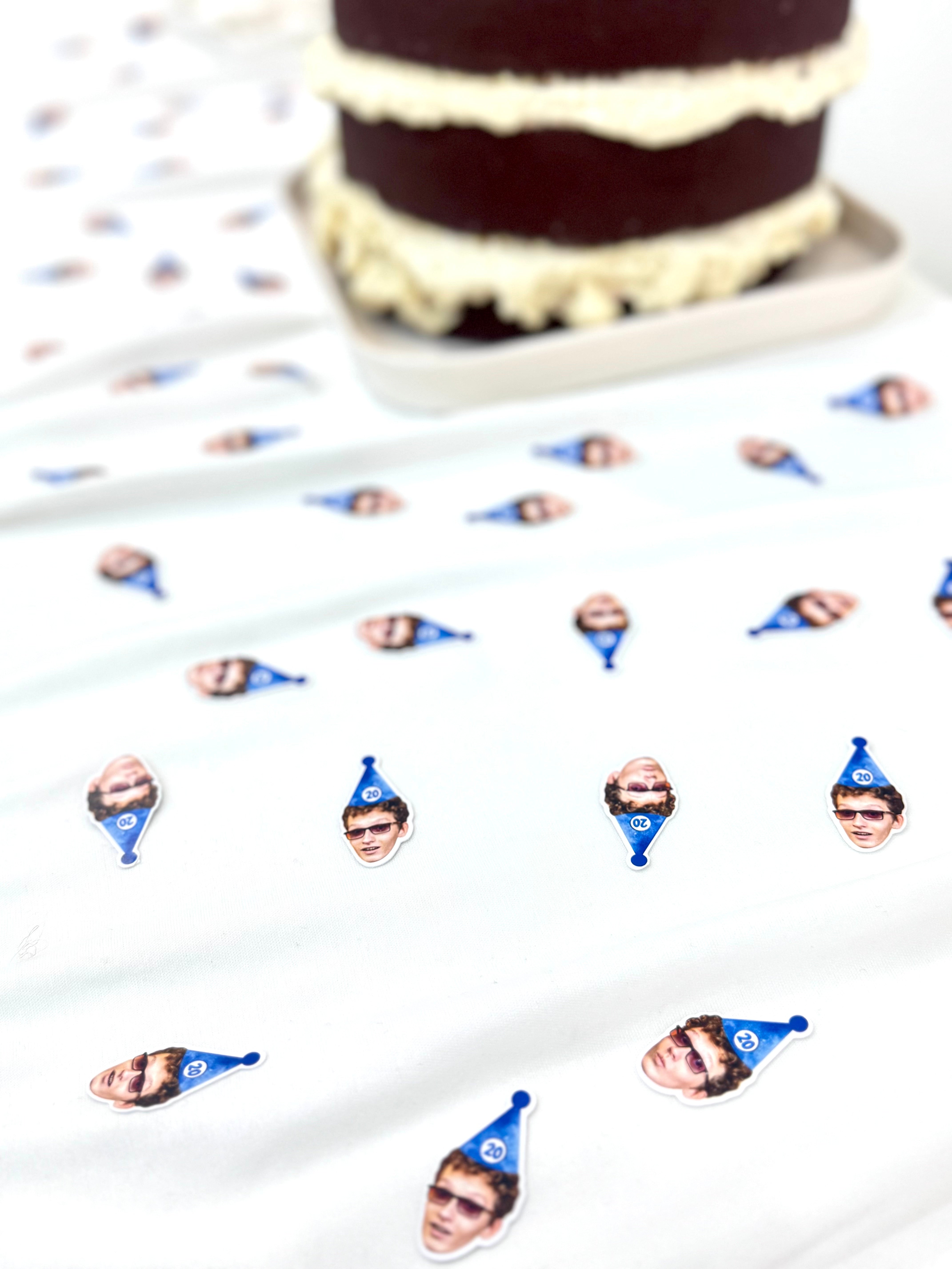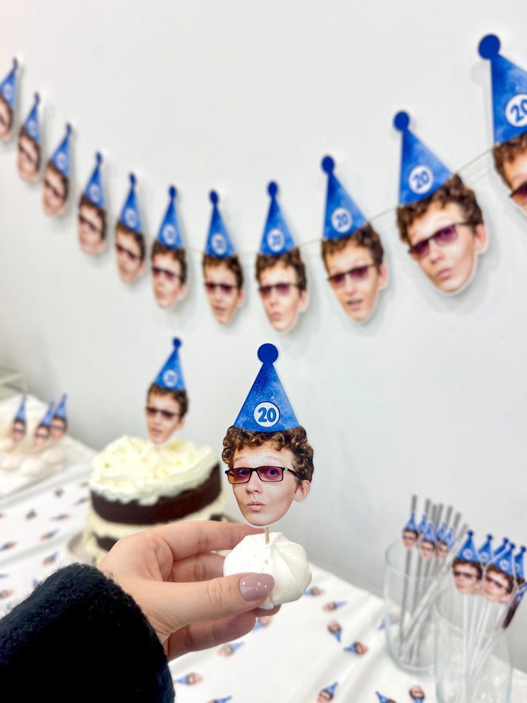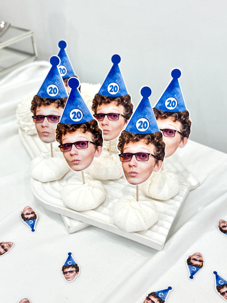Mavi tonlardaki parti şapkasıyla hazırlanan bu özel topper’lar 20. yaş doğum gününüze eğlence ve enerji katar. Yüzünüzle kişiselleştirilir, her biri yüksek çözünürlüklü baskı ile üretilir.