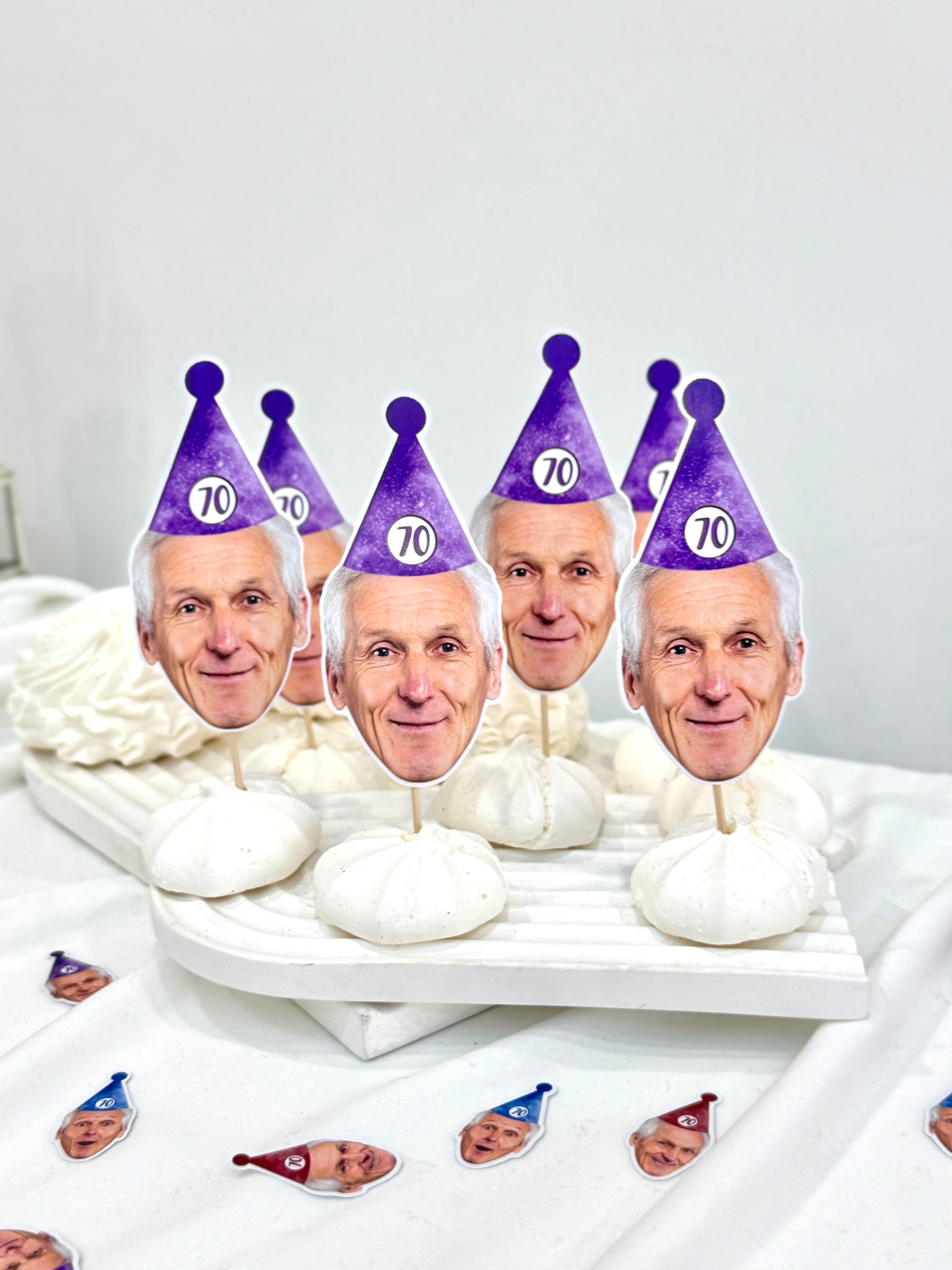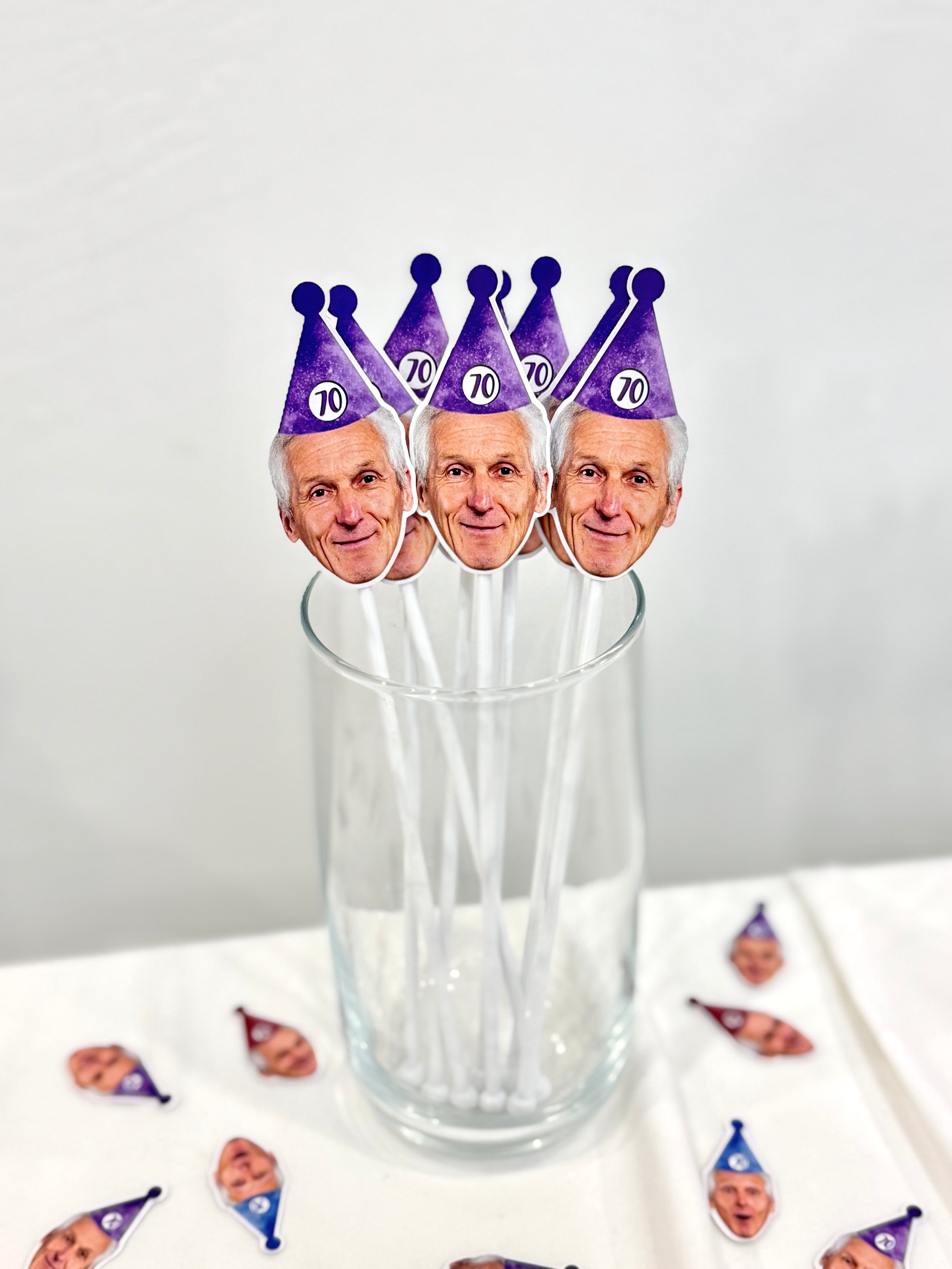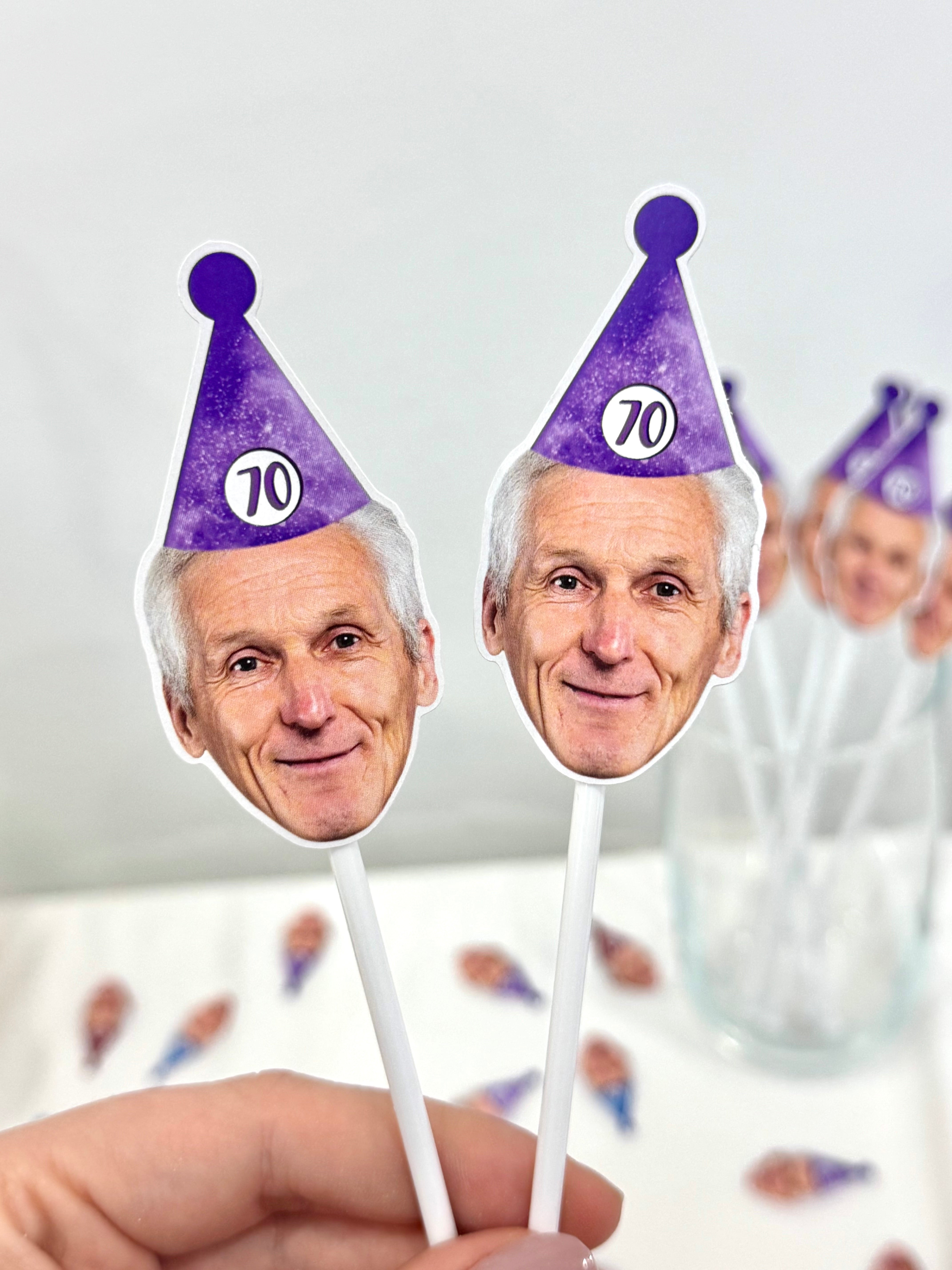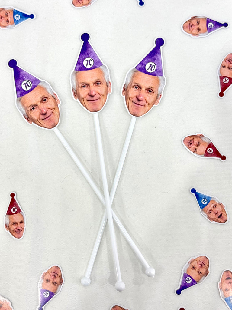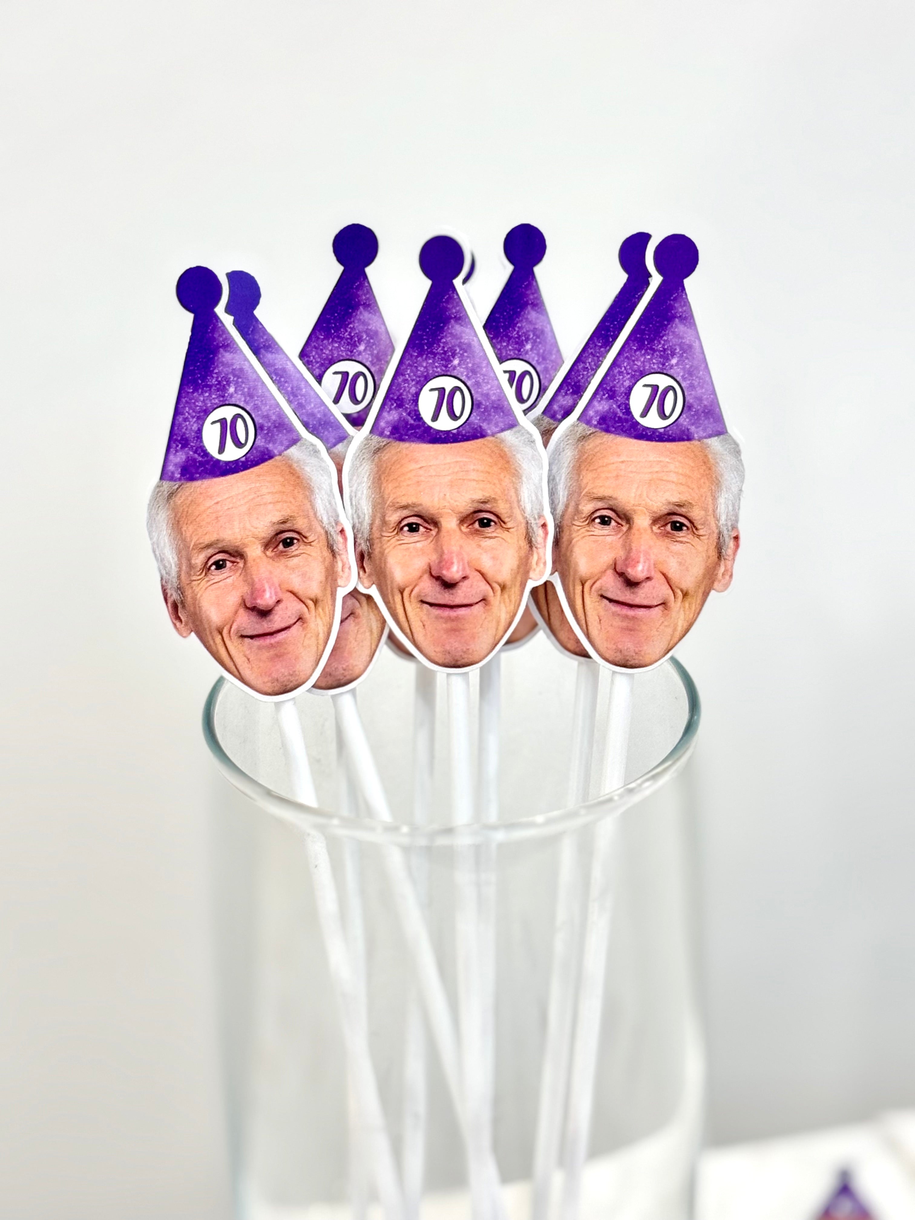 Parti şapkalı yüz baskılı kokteyl karıştırıcılarla 70. yaş kutlamalarını renklendir! Her biri yüksek kalite baskı ve sağlam yapısıyla üretilmiştir.