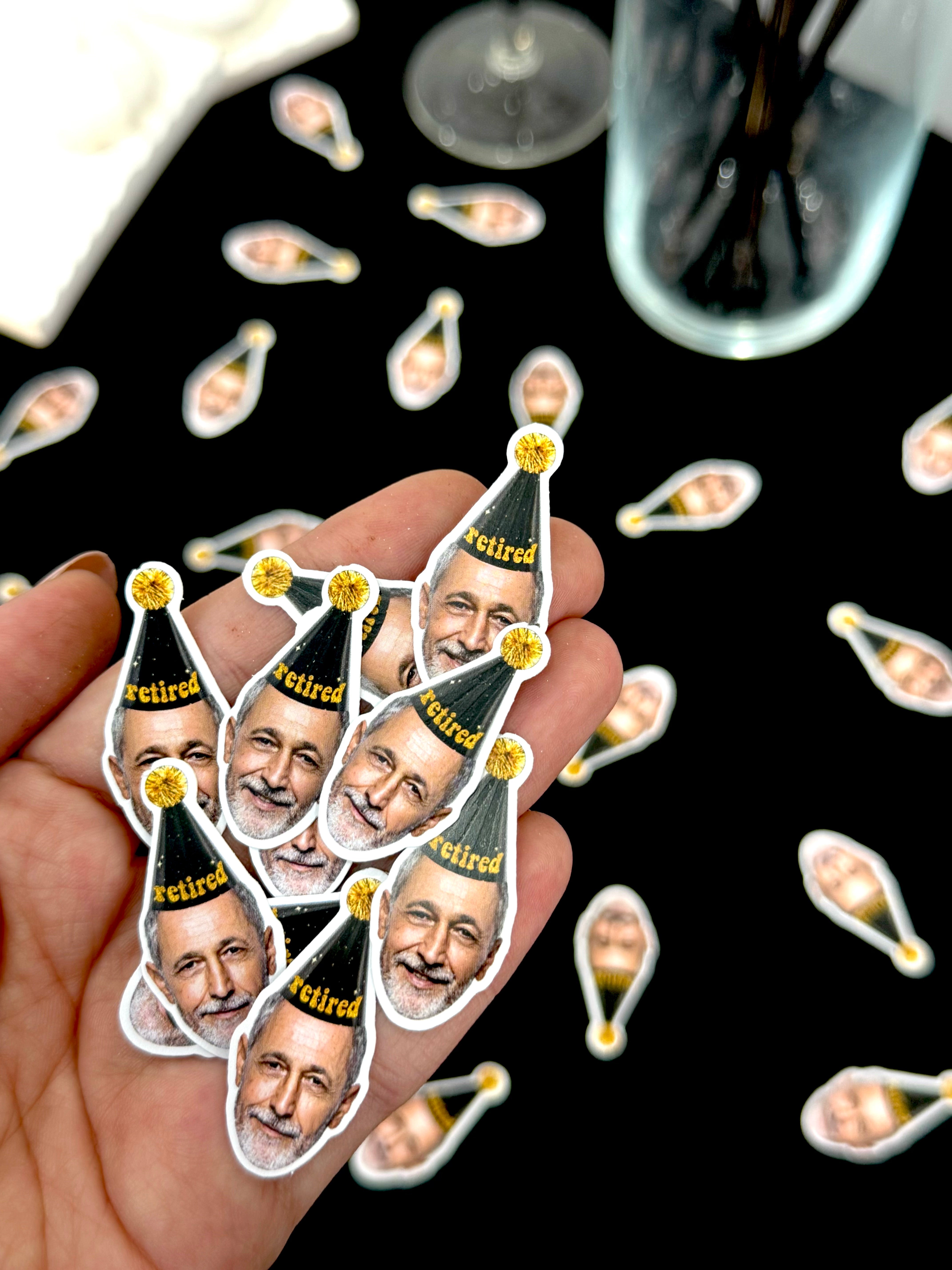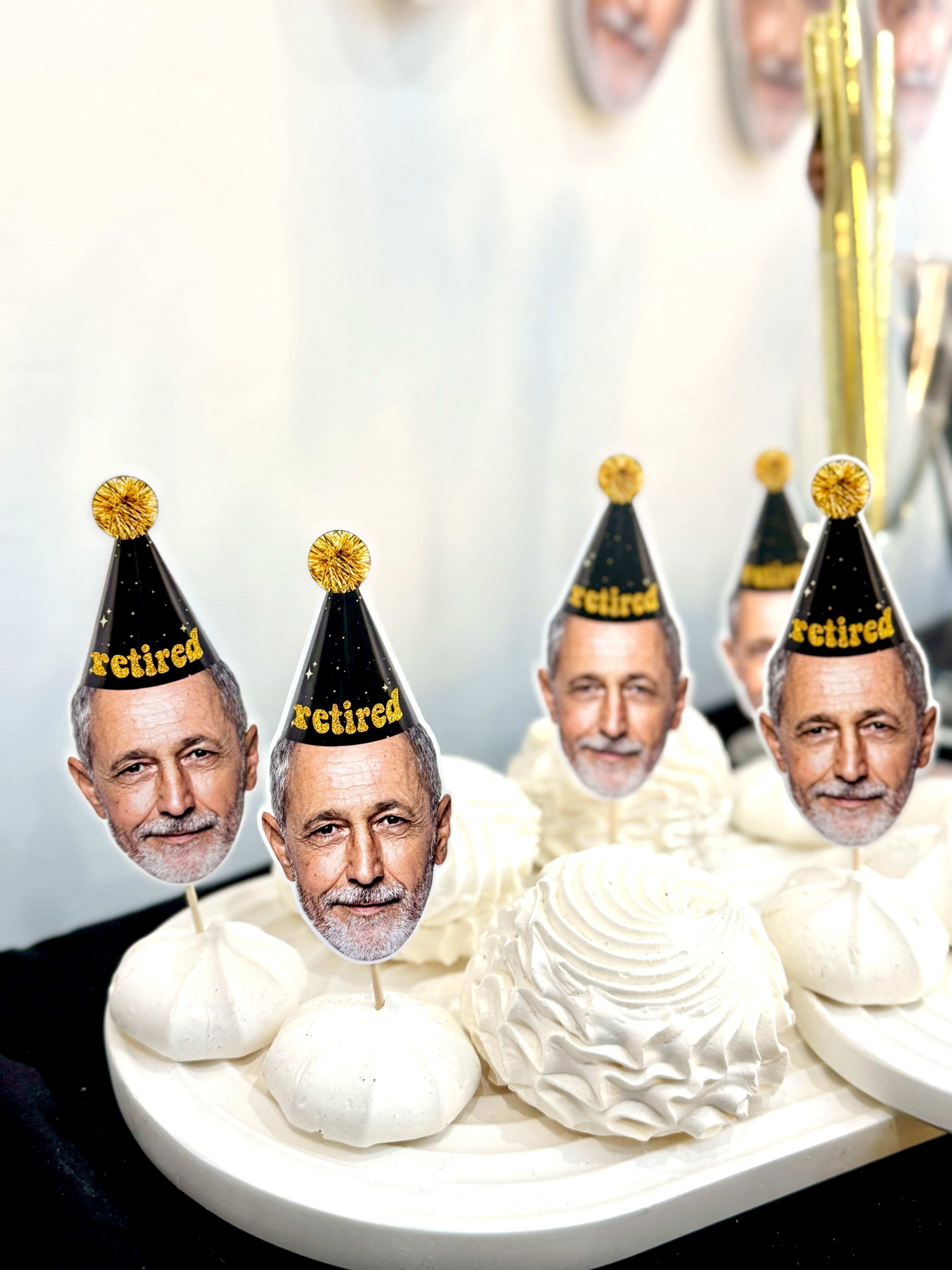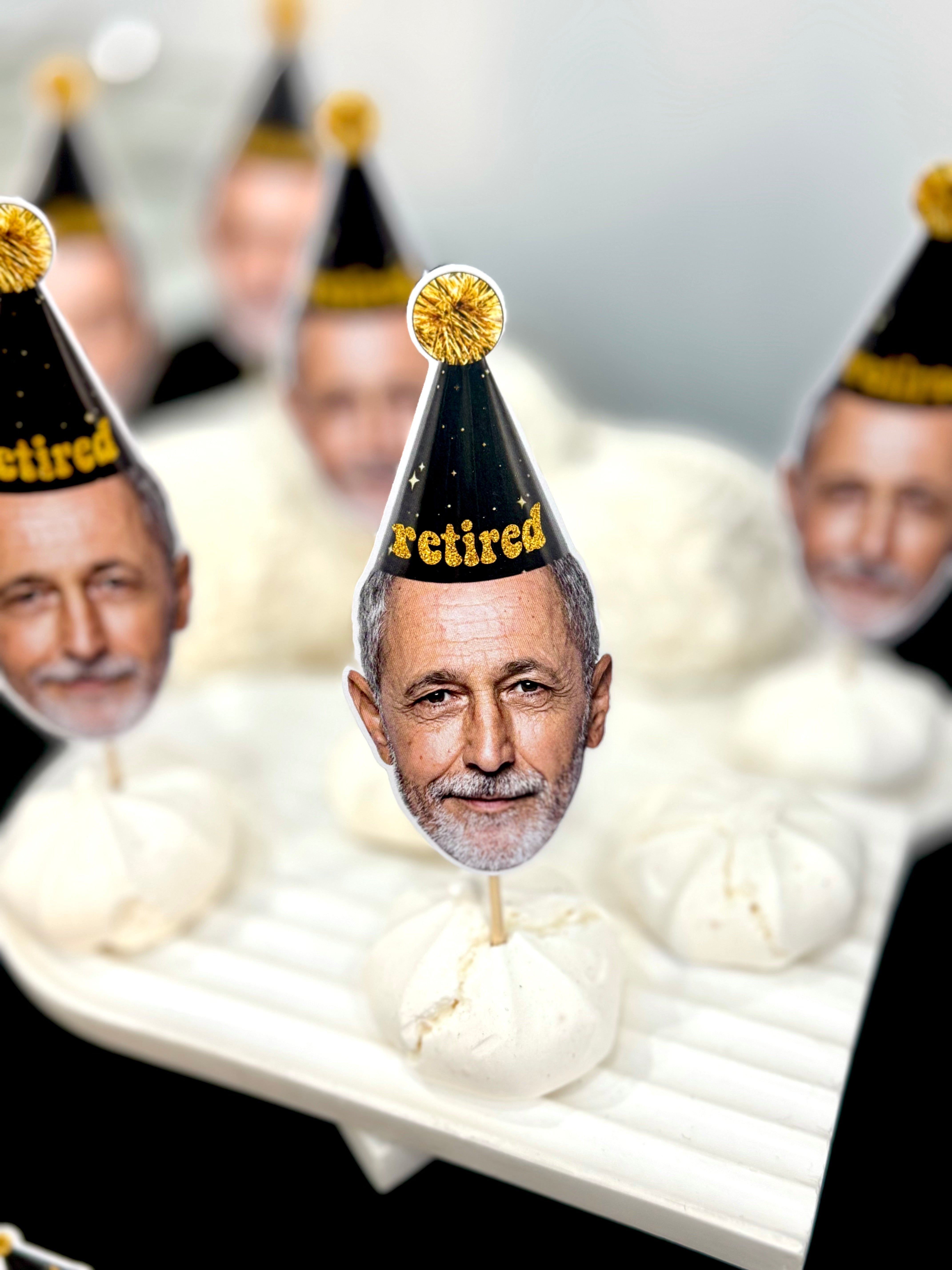 Altın yaldızlı “retired” şapkalı kişiye özel pipet süsleri, kutlama içeceklerine esprili ve şık bir görünüm kazandırır.