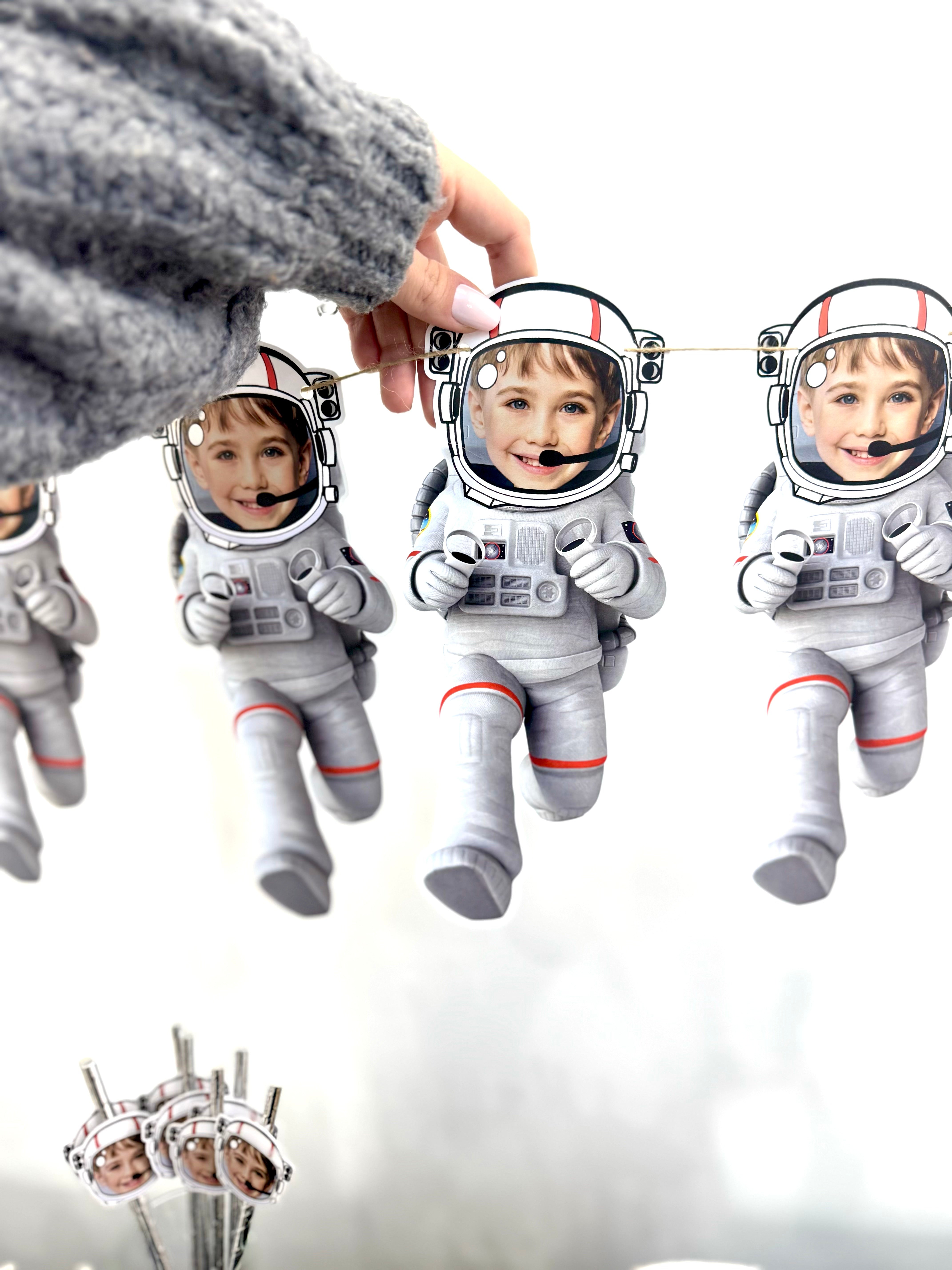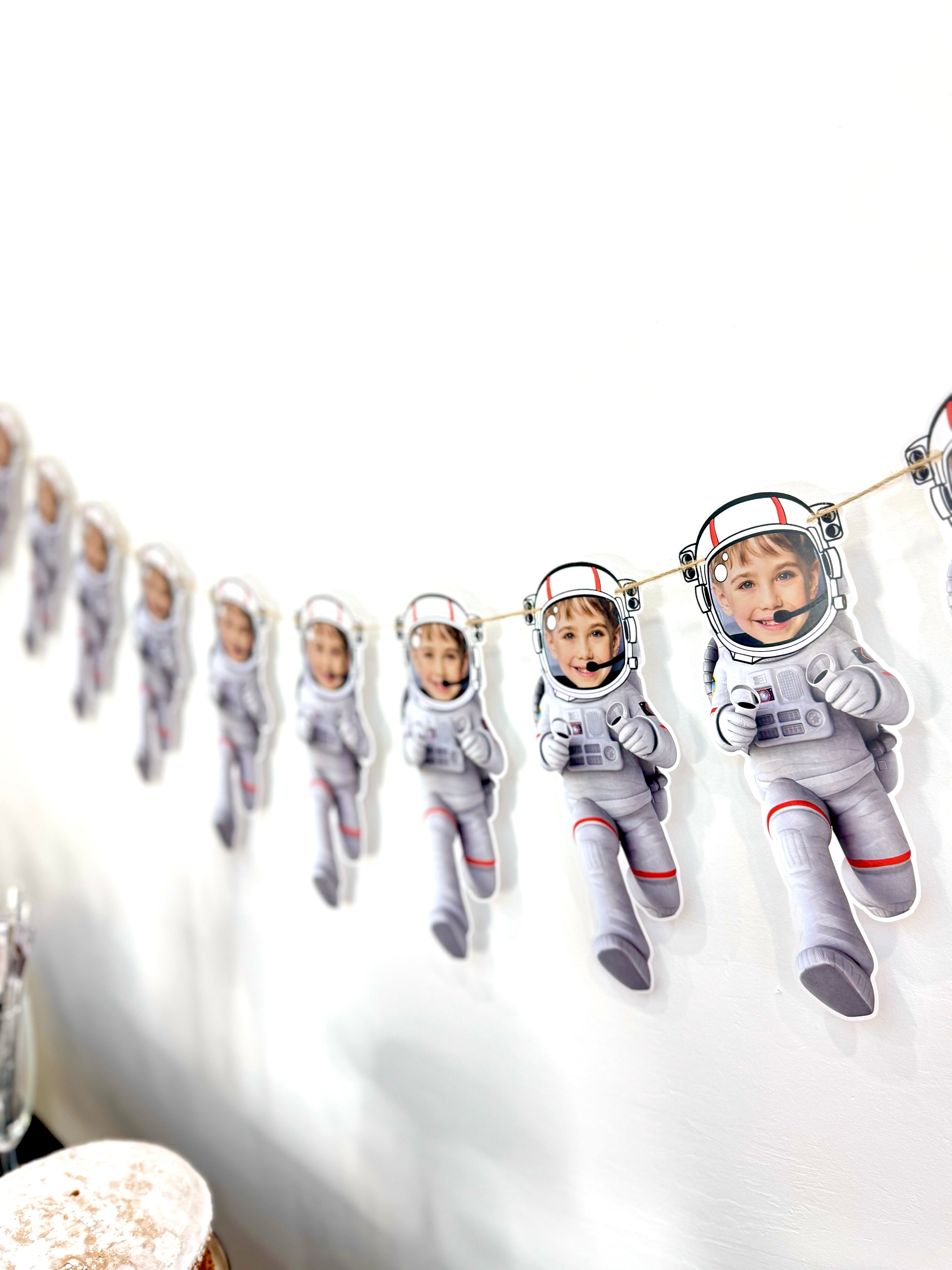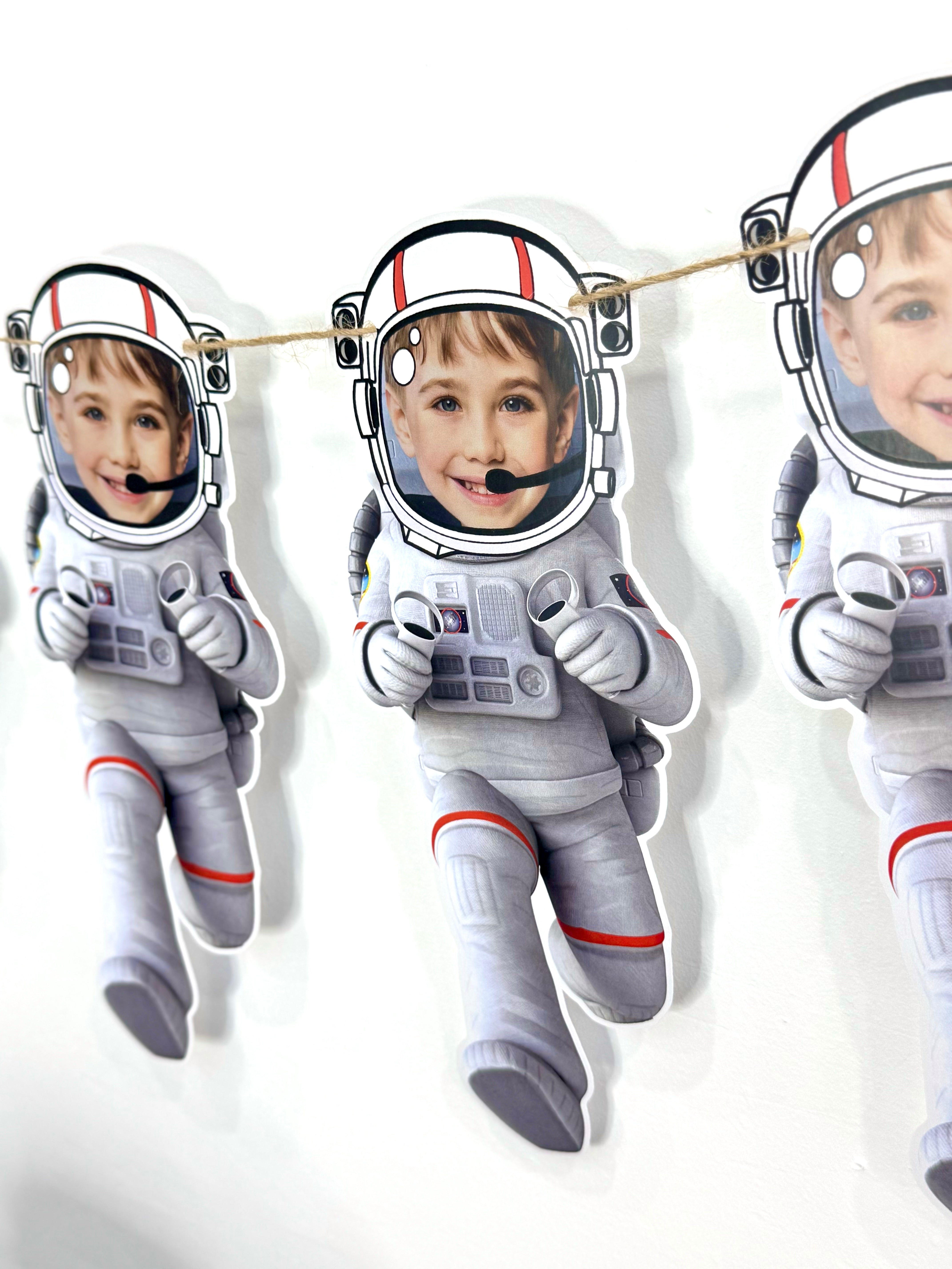 Uzay temalı bu kişiye özel banner, astronot figürüyle çocuğunuzun fotoğrafını birleştirir. Parti alanına neşe ve hayal gücü katmak için mükemmel bir seçimdir.