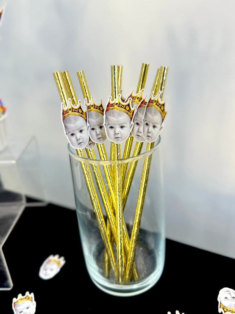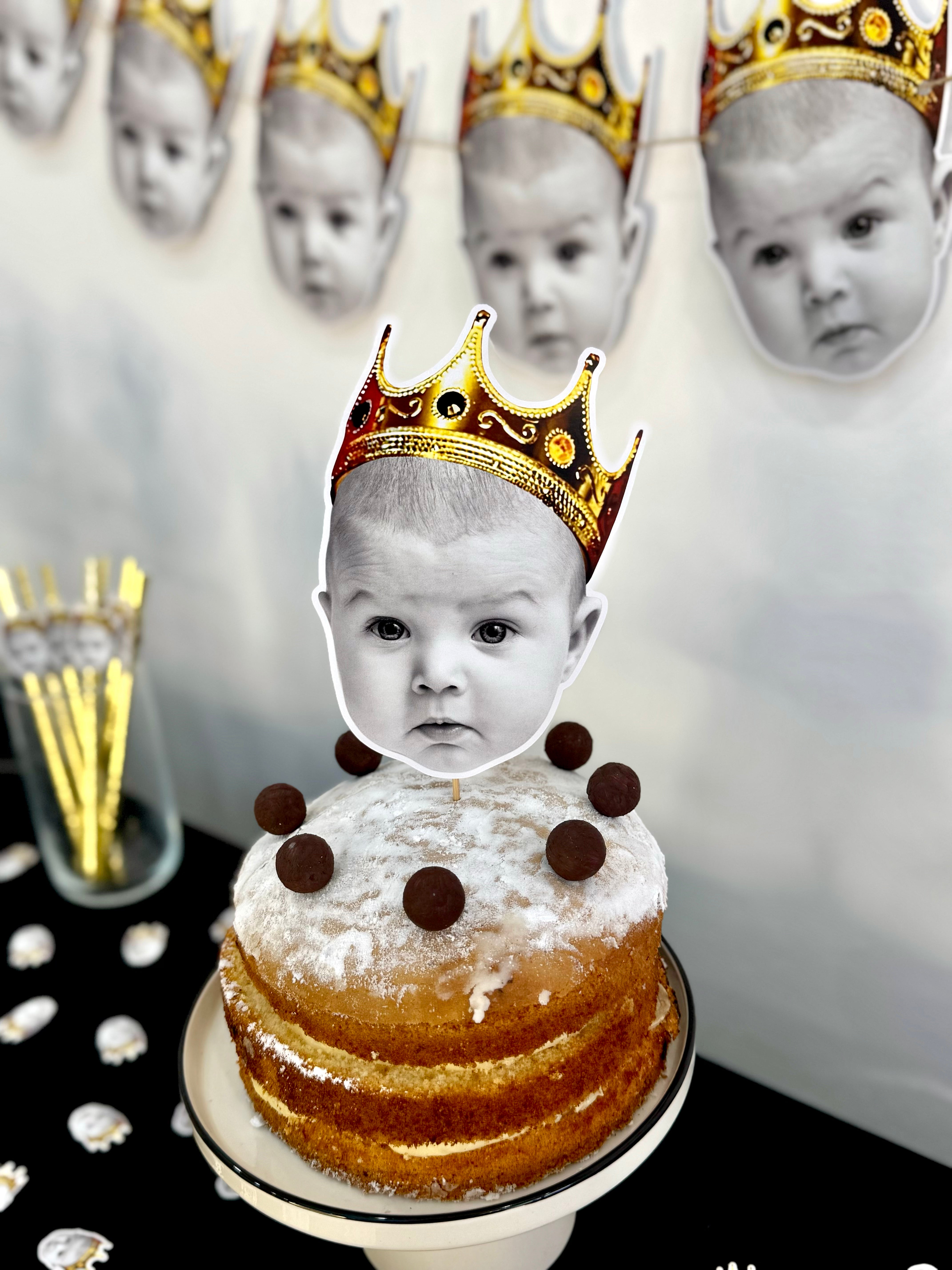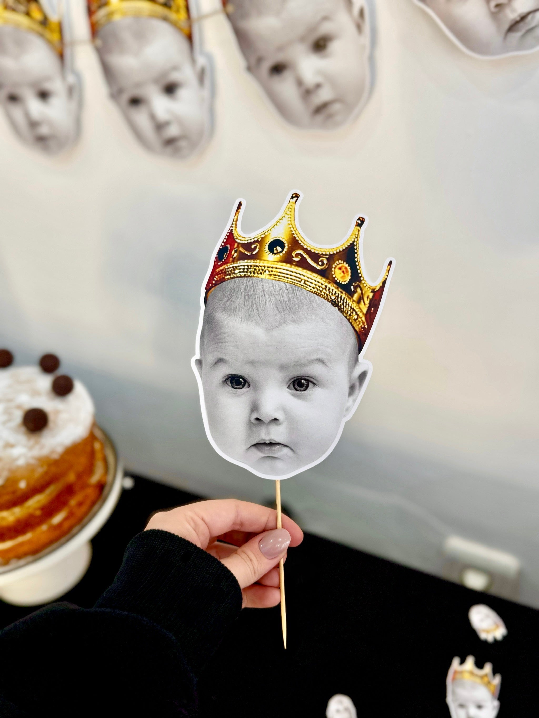 Altın taçlı bebek figürüyle tasarlanan kişiye özel banner, doğum günü alanını şık ve esprili hale getirir. Küçük kralın en unutulmaz kutlaması için mükemmel bir detay.
