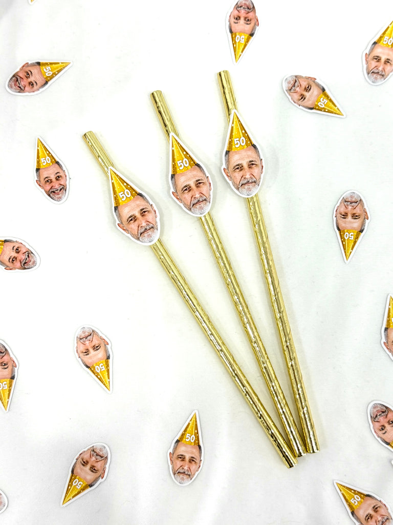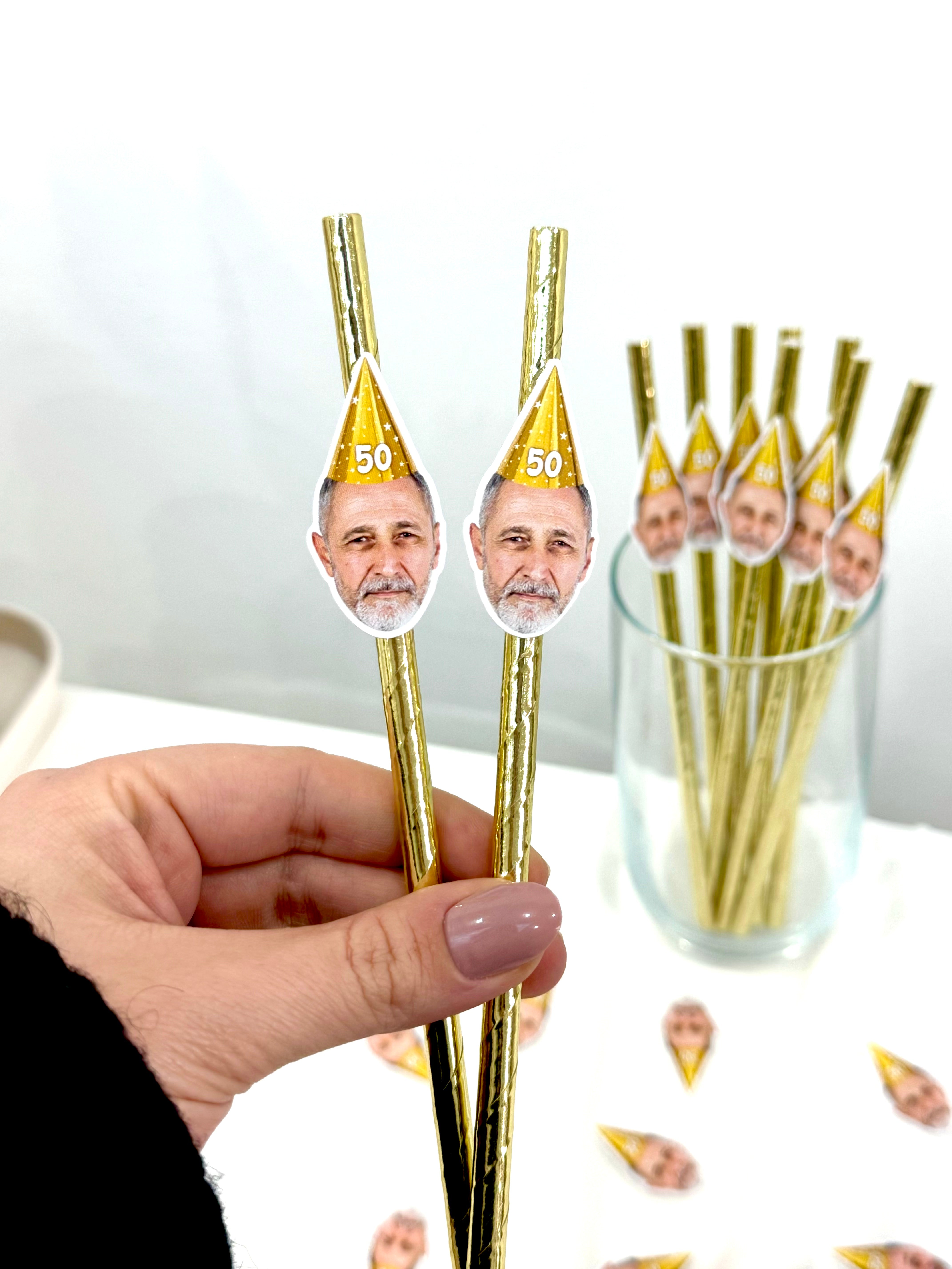 Altın rengi detaylarıyla dikkat çeken 50. yaş fotoğraflı pipetlerle doğum günü masanızı şık ve eğlenceli hale getirin.