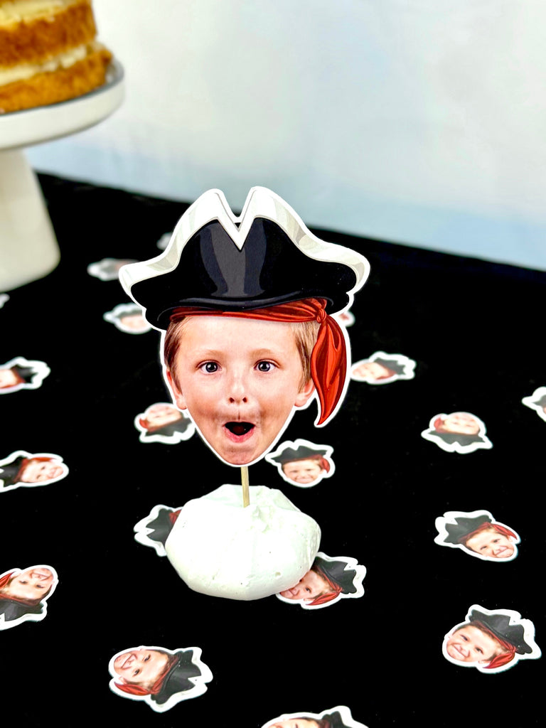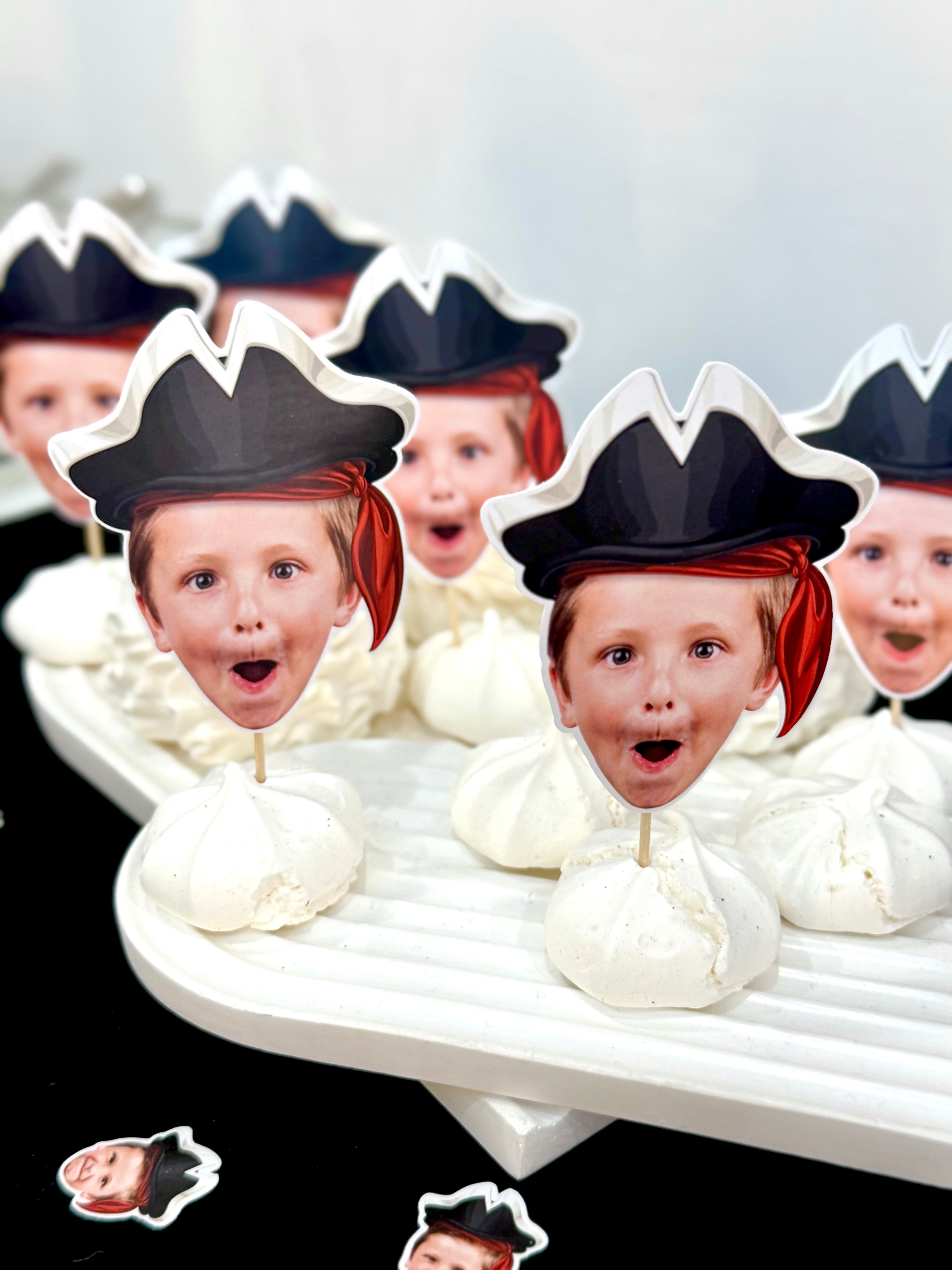 Küçük korsanınızın fotoğrafıyla hazırlanan özel cupcake süsleri, zarif kesimi ve canlı renkleriyle kutlamaların en eğlenceli detayına dönüşür. El yapımı baskısıyla her tatlıya karakter katar.