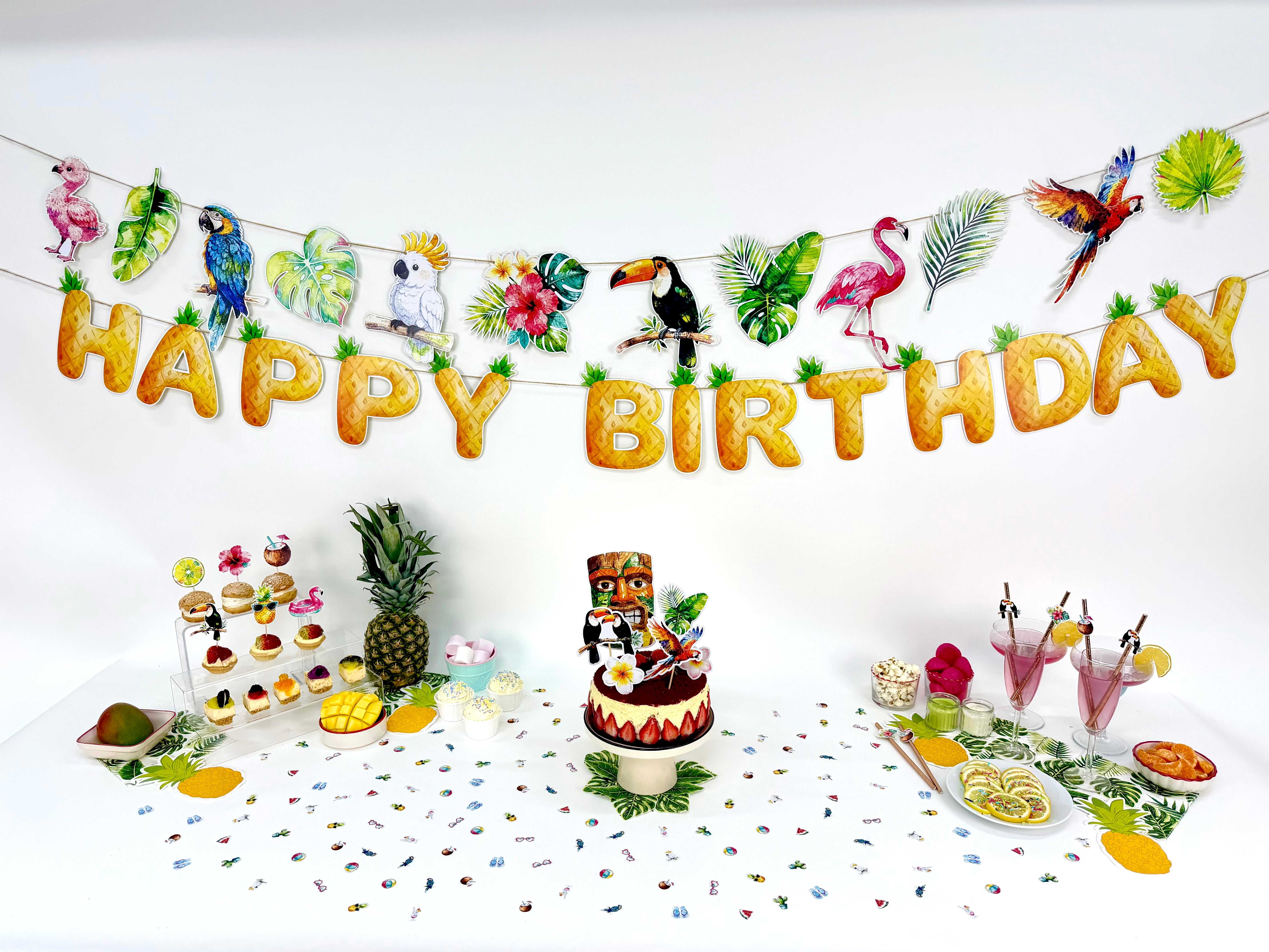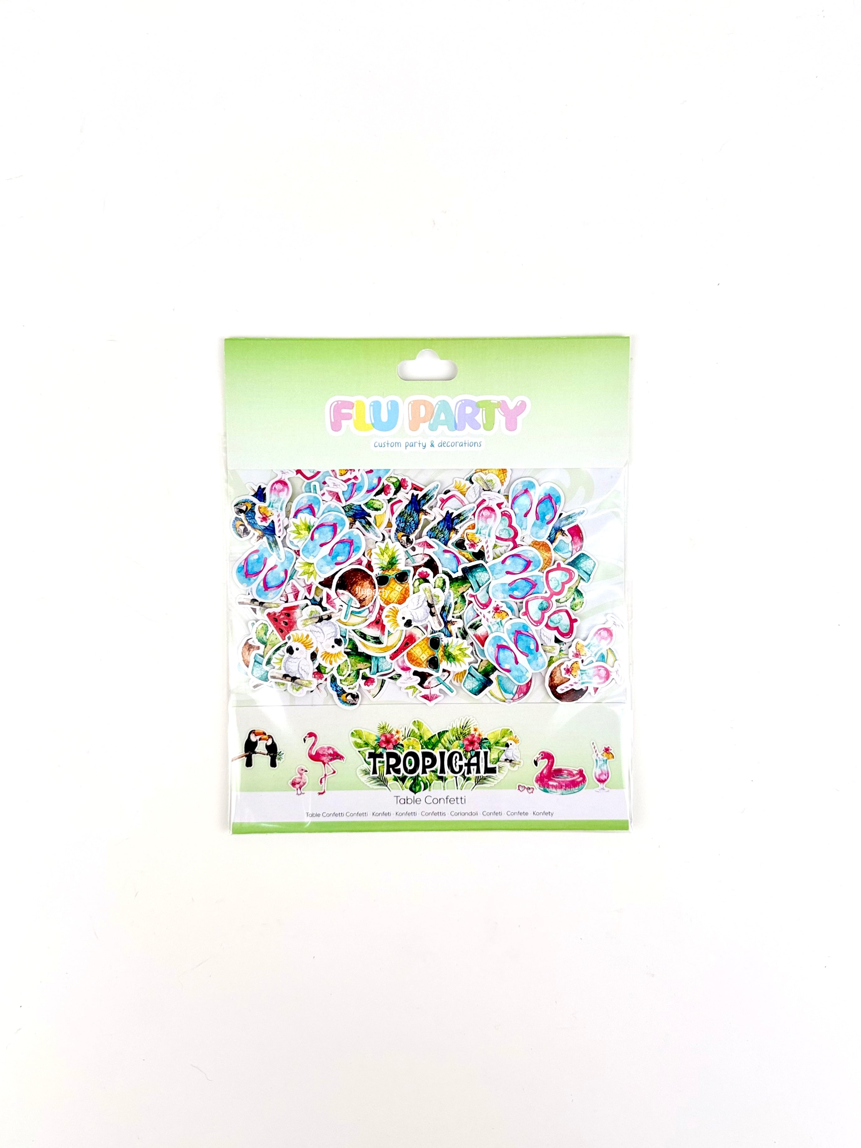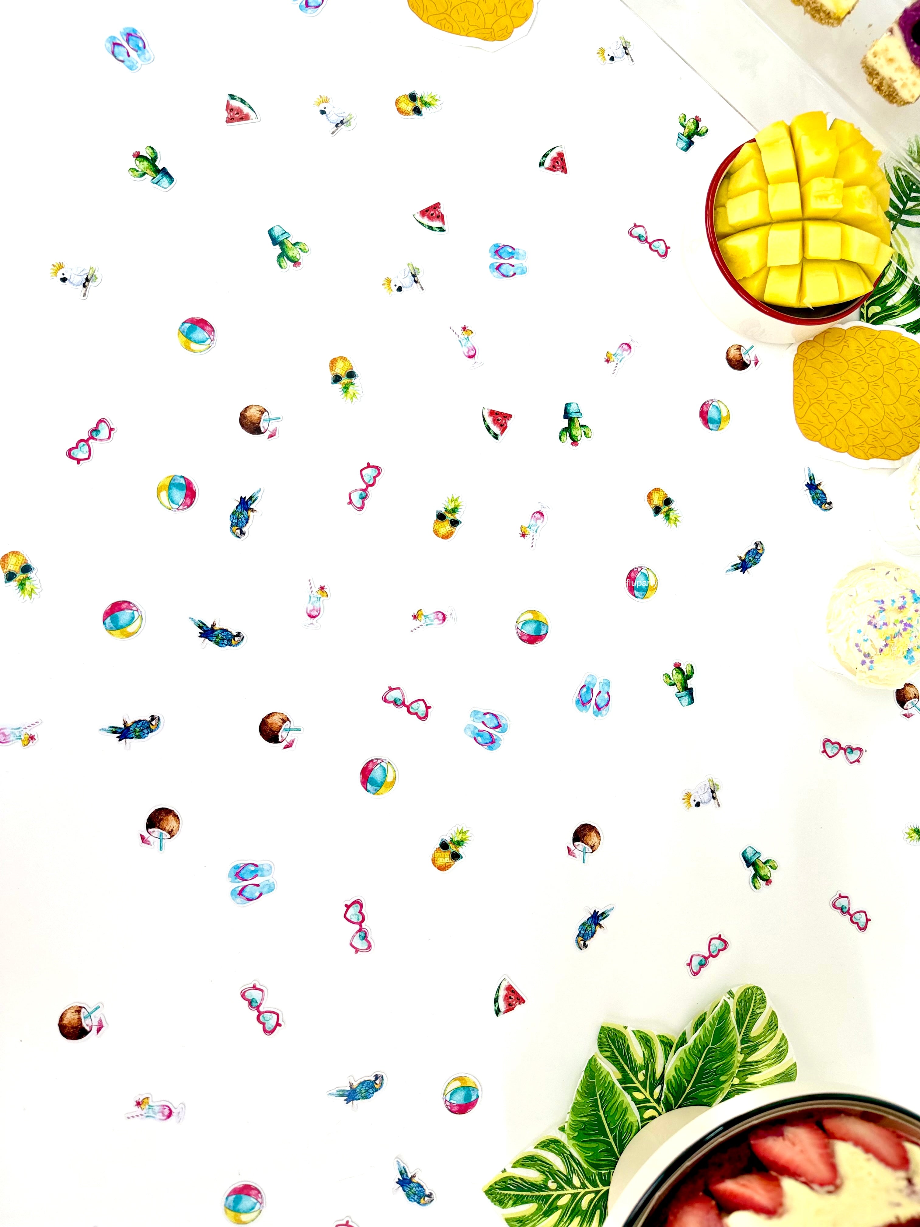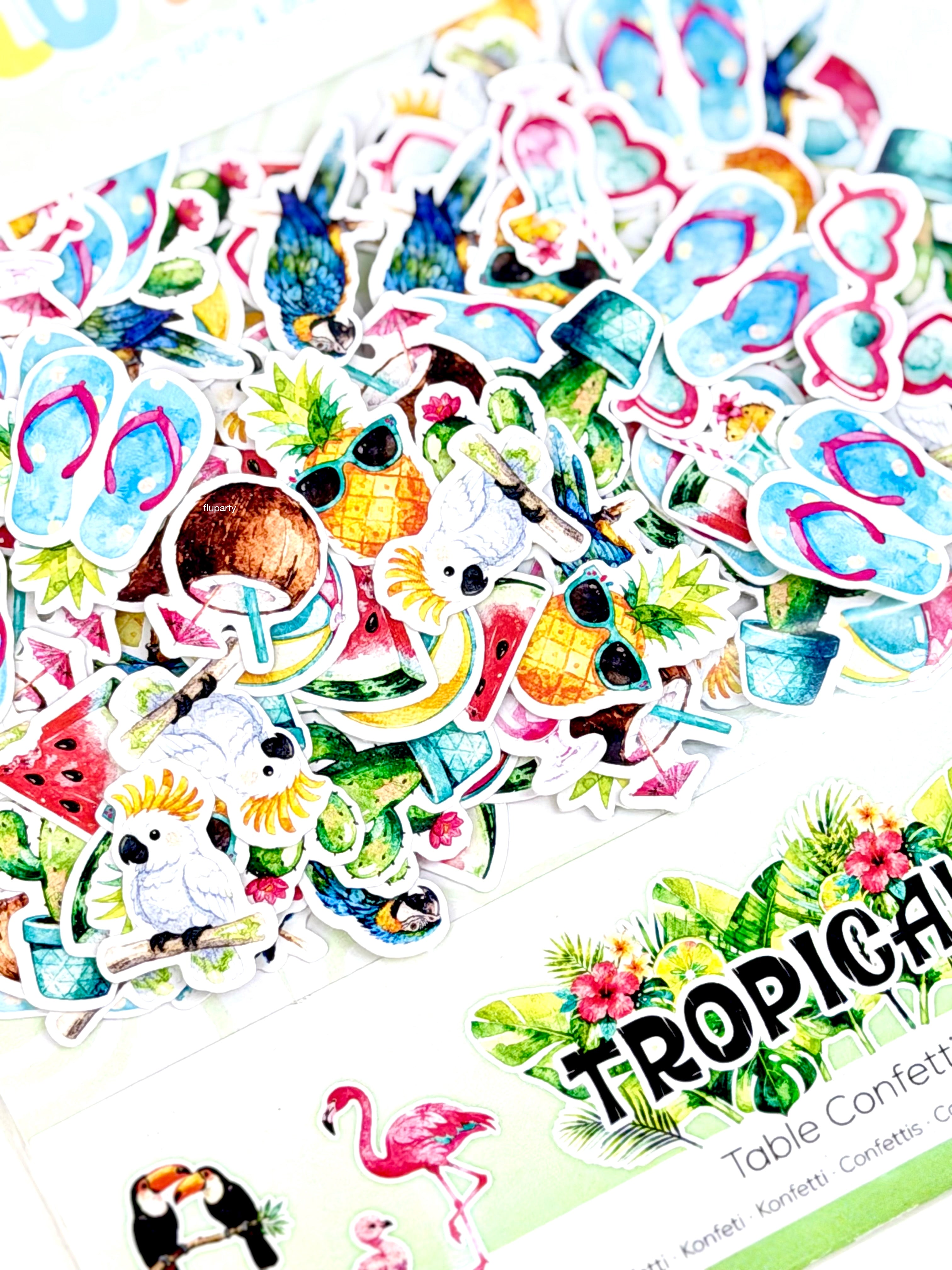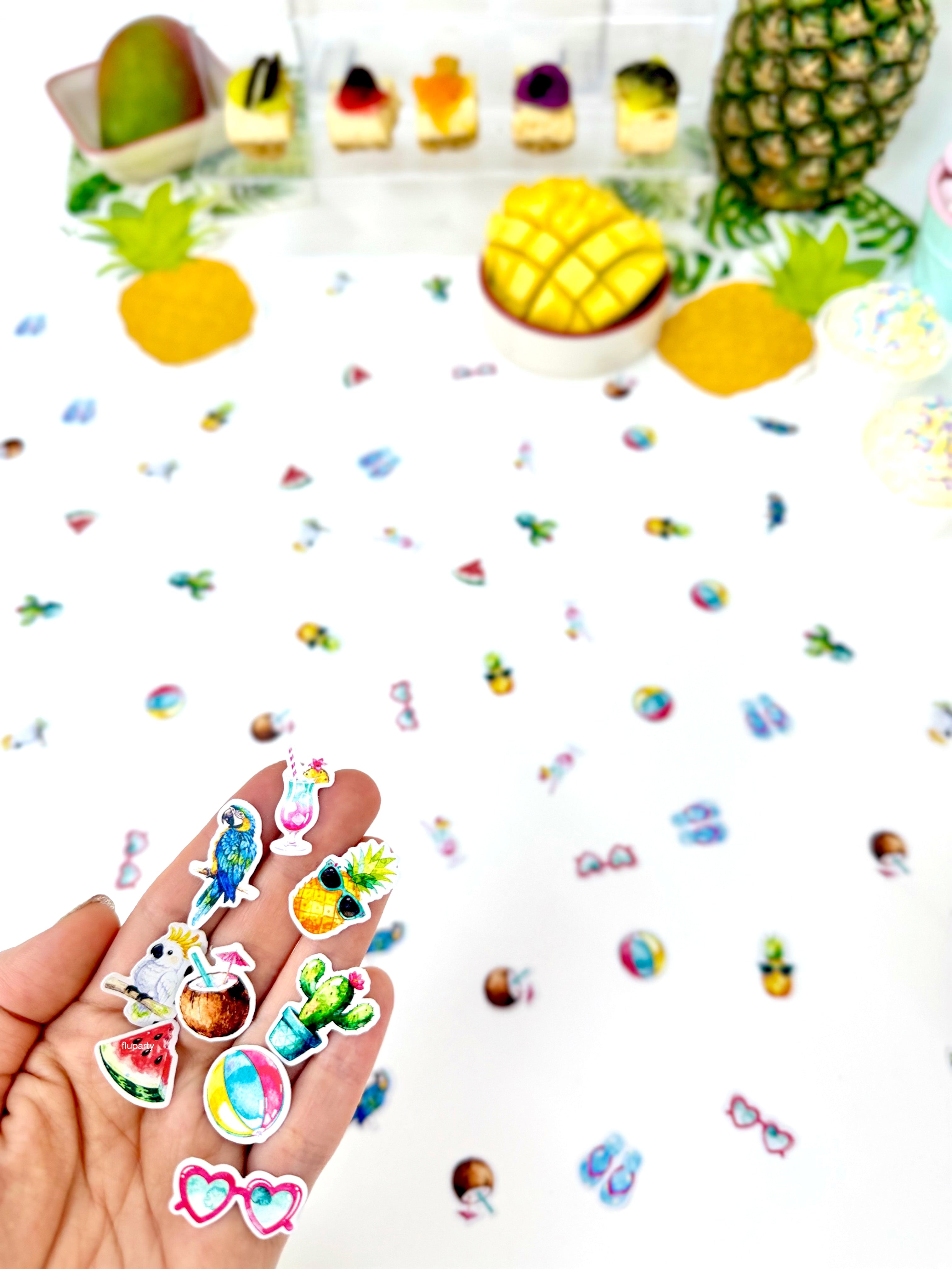 Minik tropikal figürlerden oluşan masa konfetileri, parti alanına renkli ve yaz havası dolu bir görünüm kazandırır. Tropikal temasını masanın her köşesine taşır.
