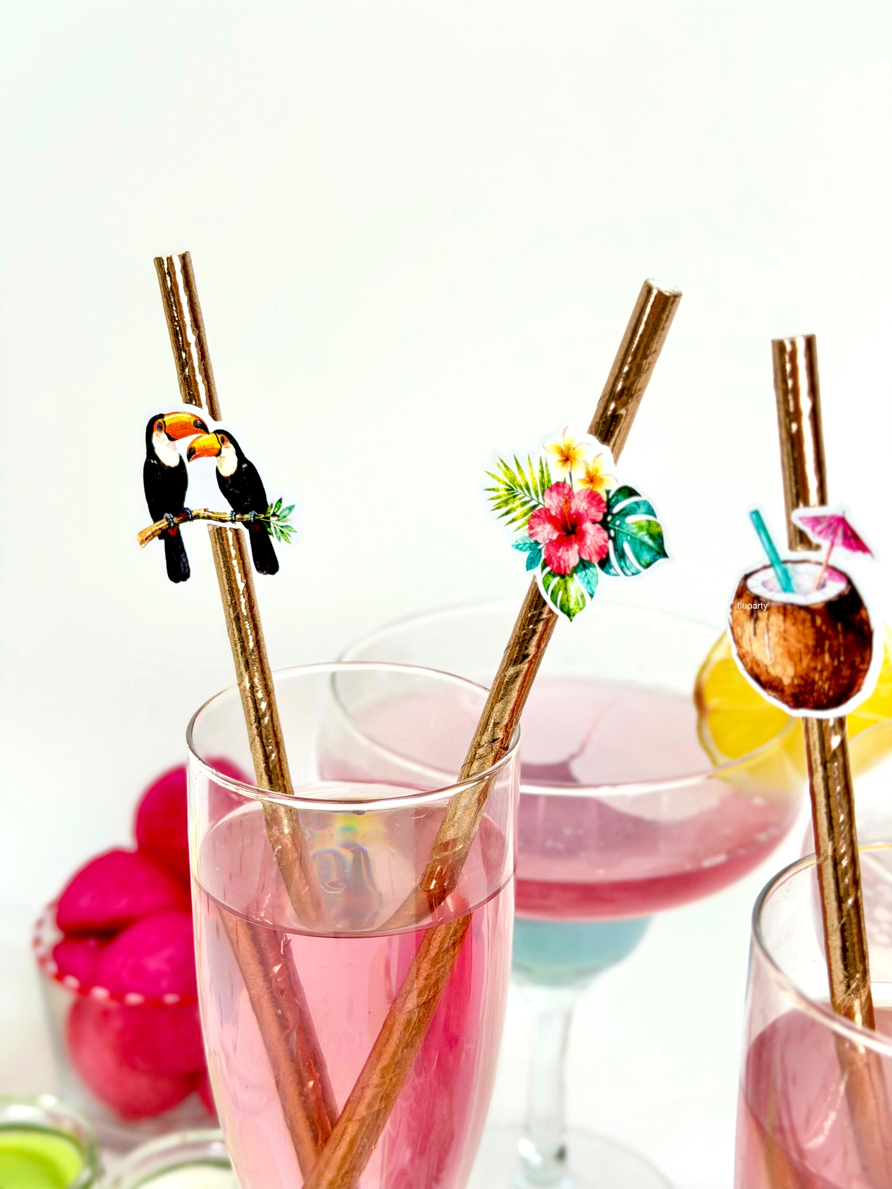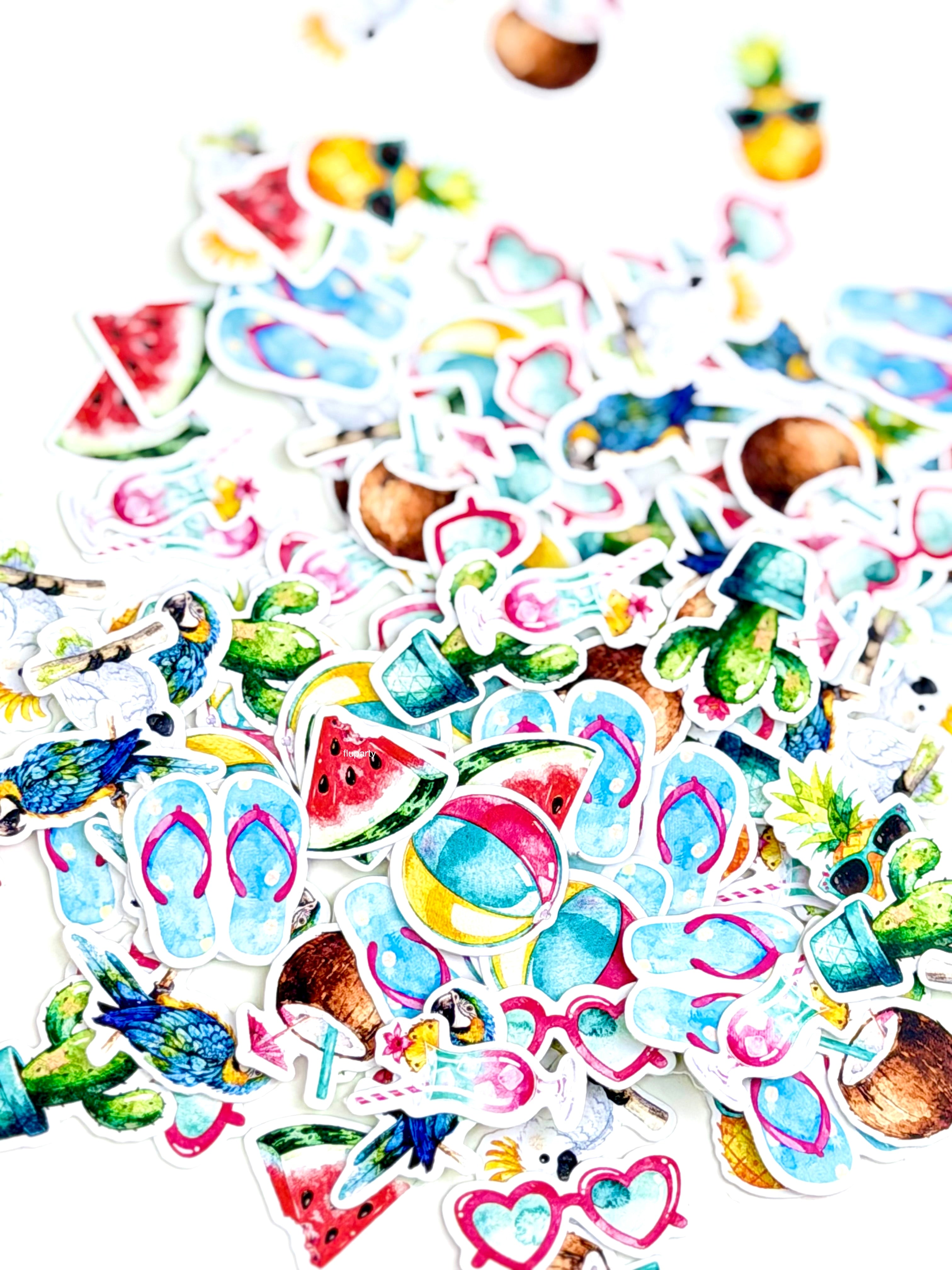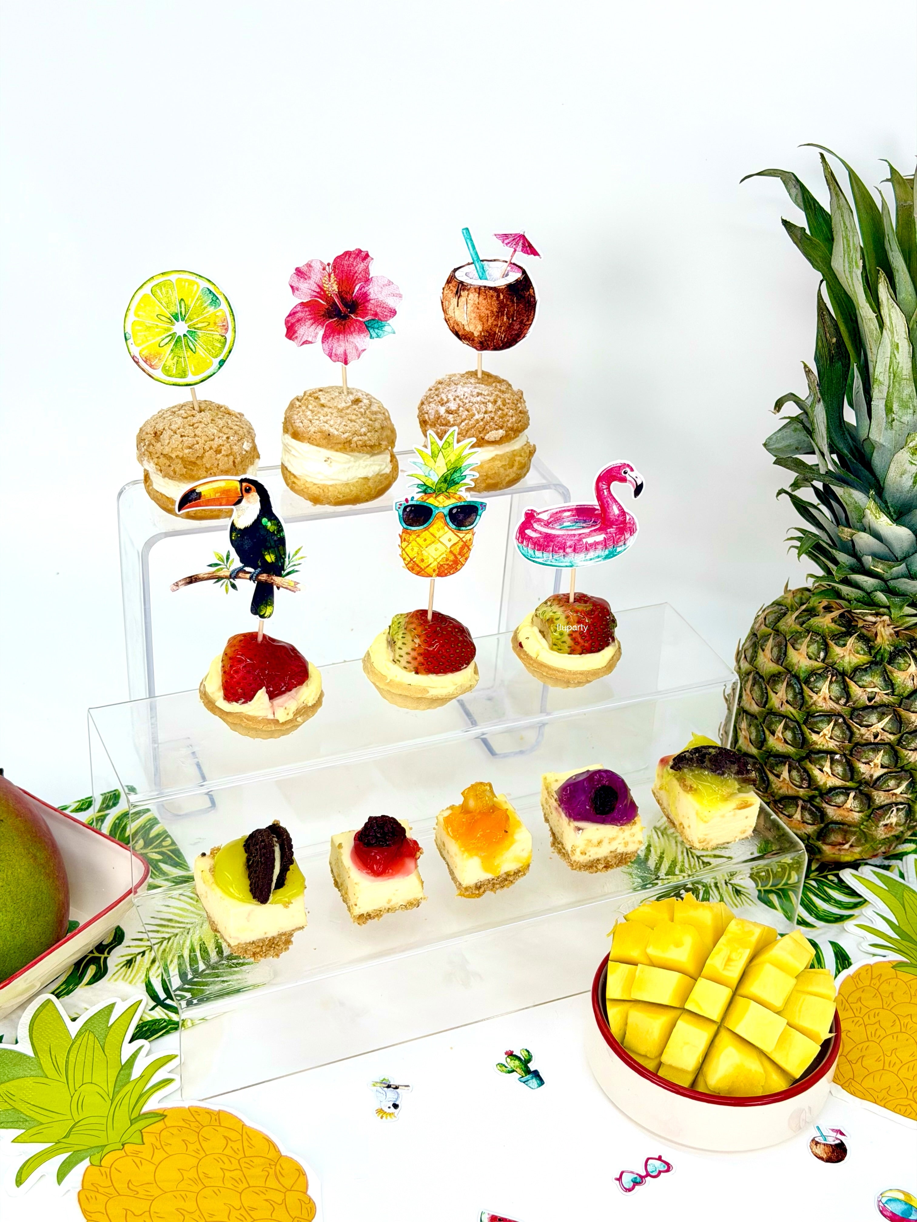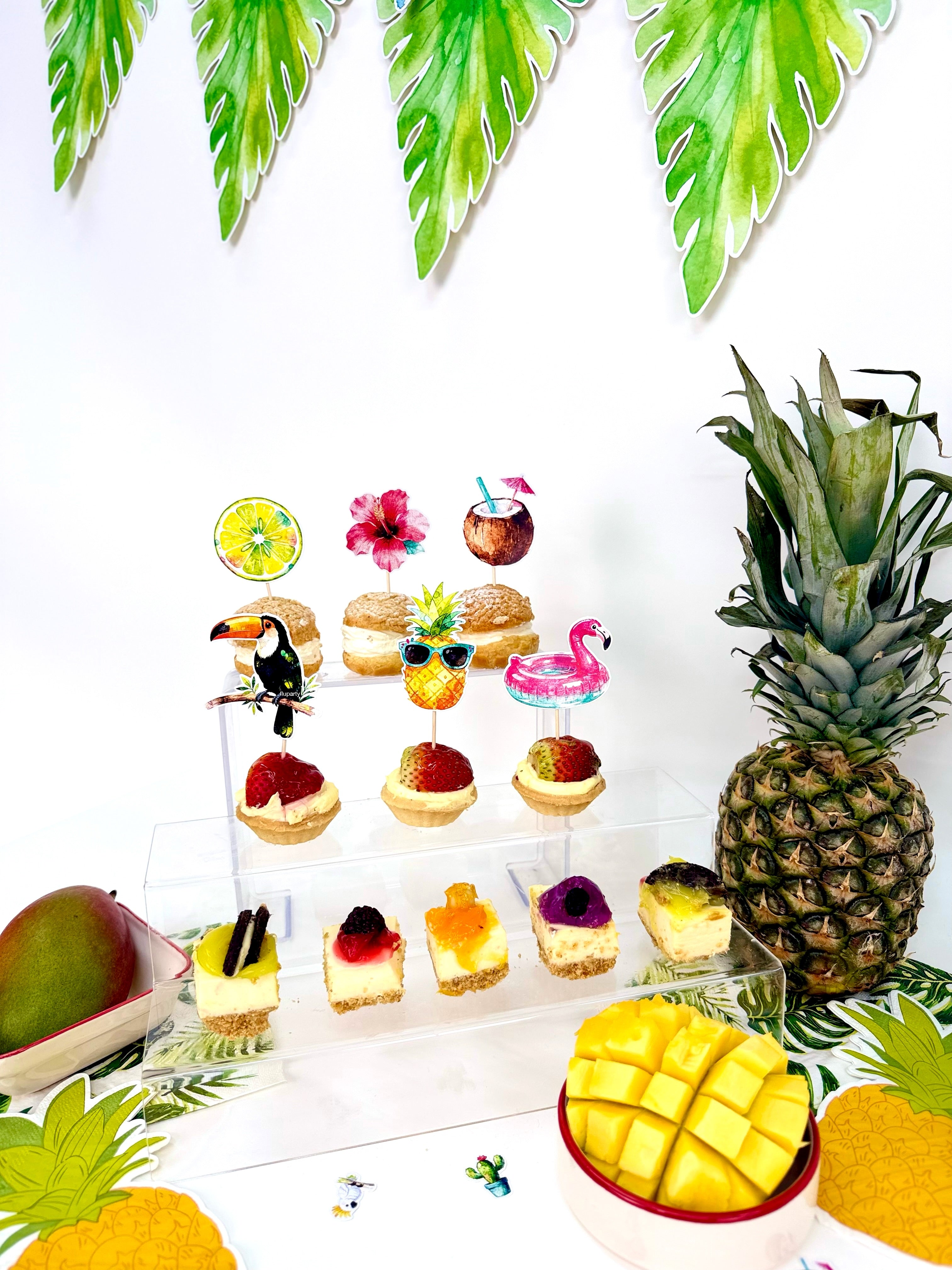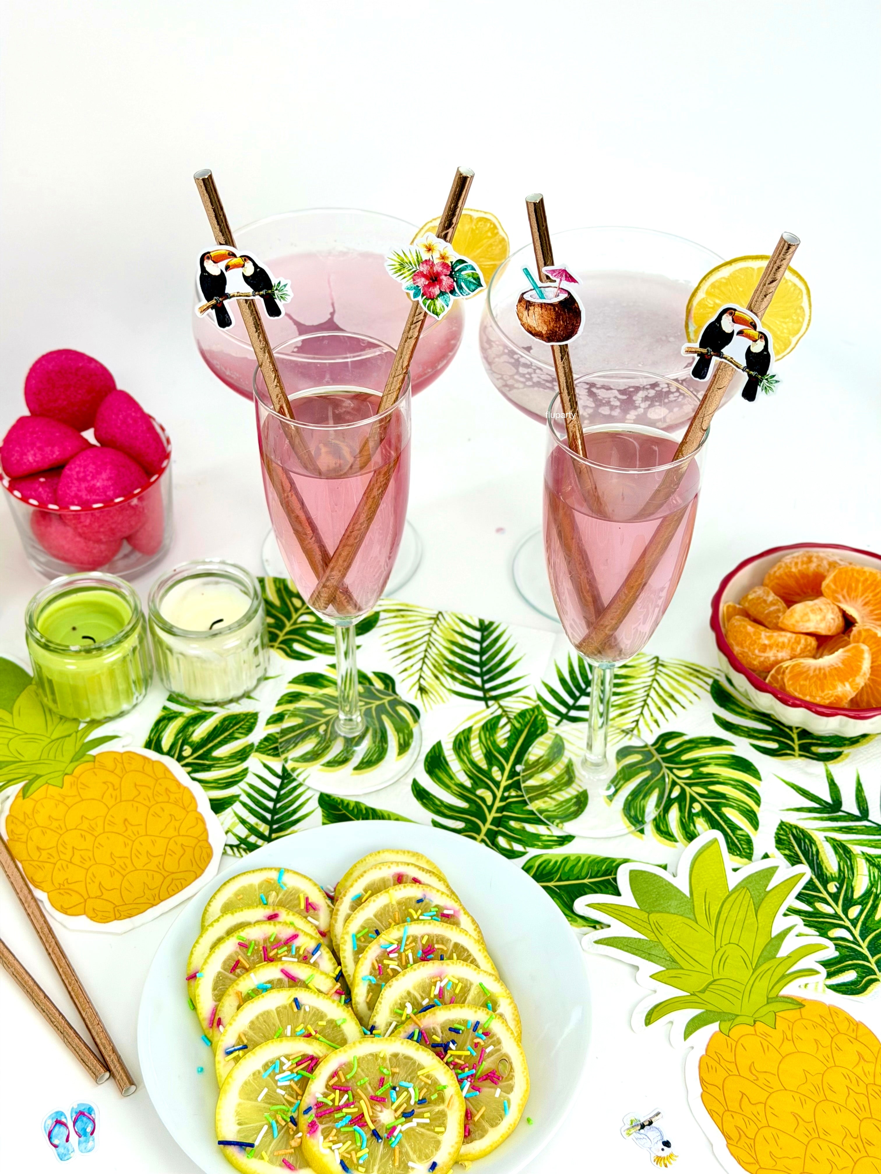 Minik tropikal figürlerden oluşan masa konfetileri, parti alanına renkli ve yaz havası dolu bir görünüm kazandırır. Tropikal temasını masanın her köşesine taşır.