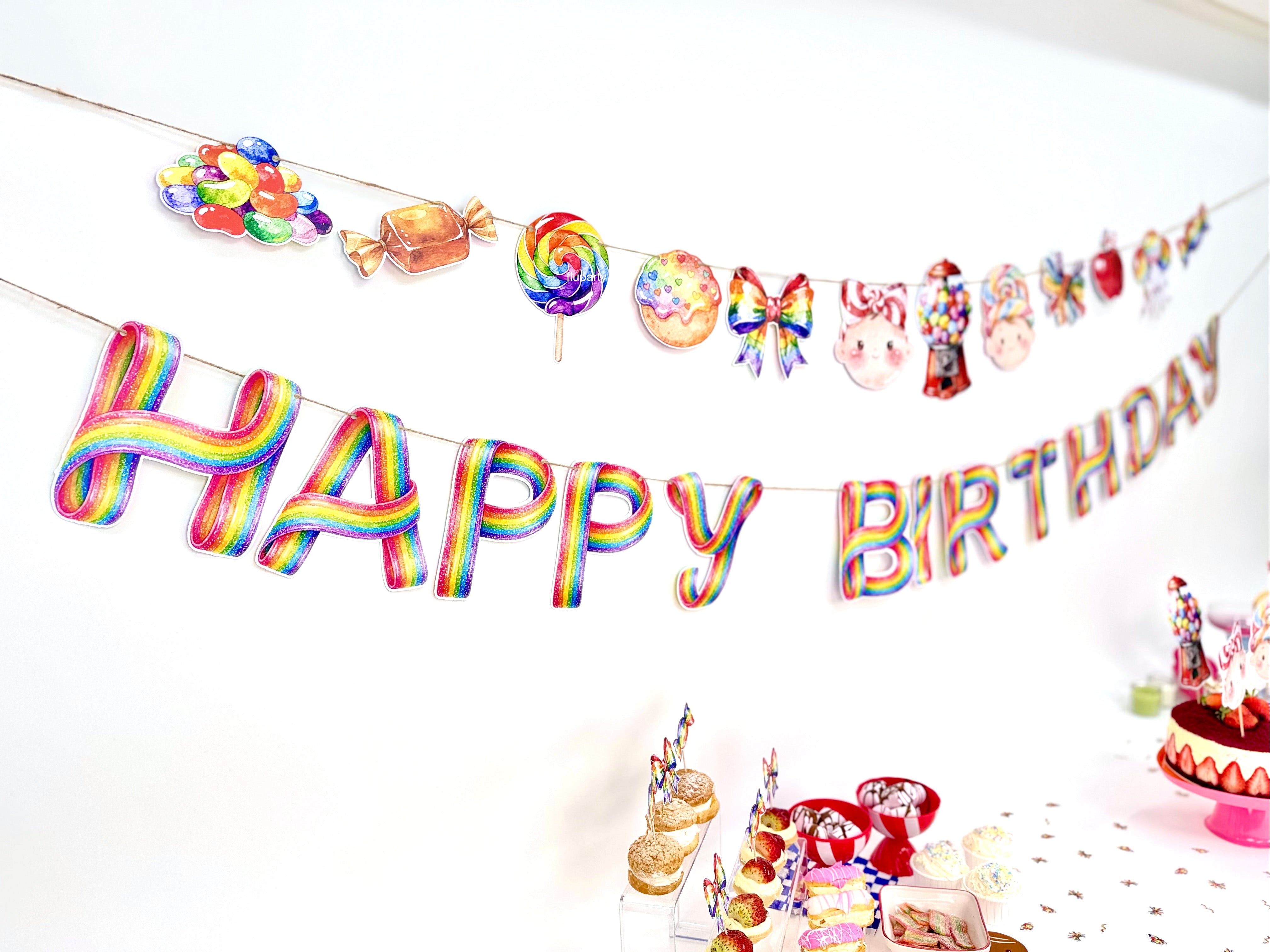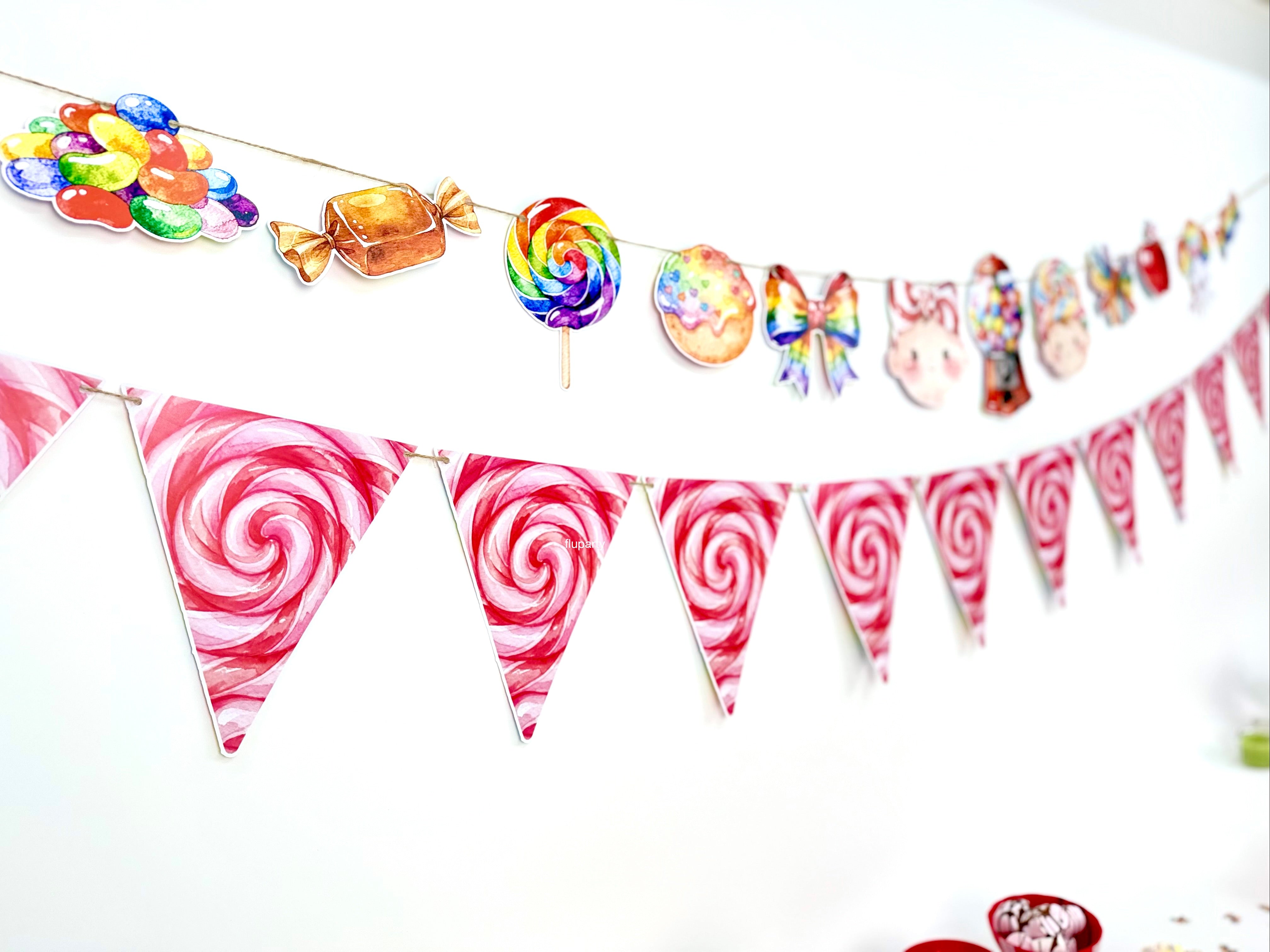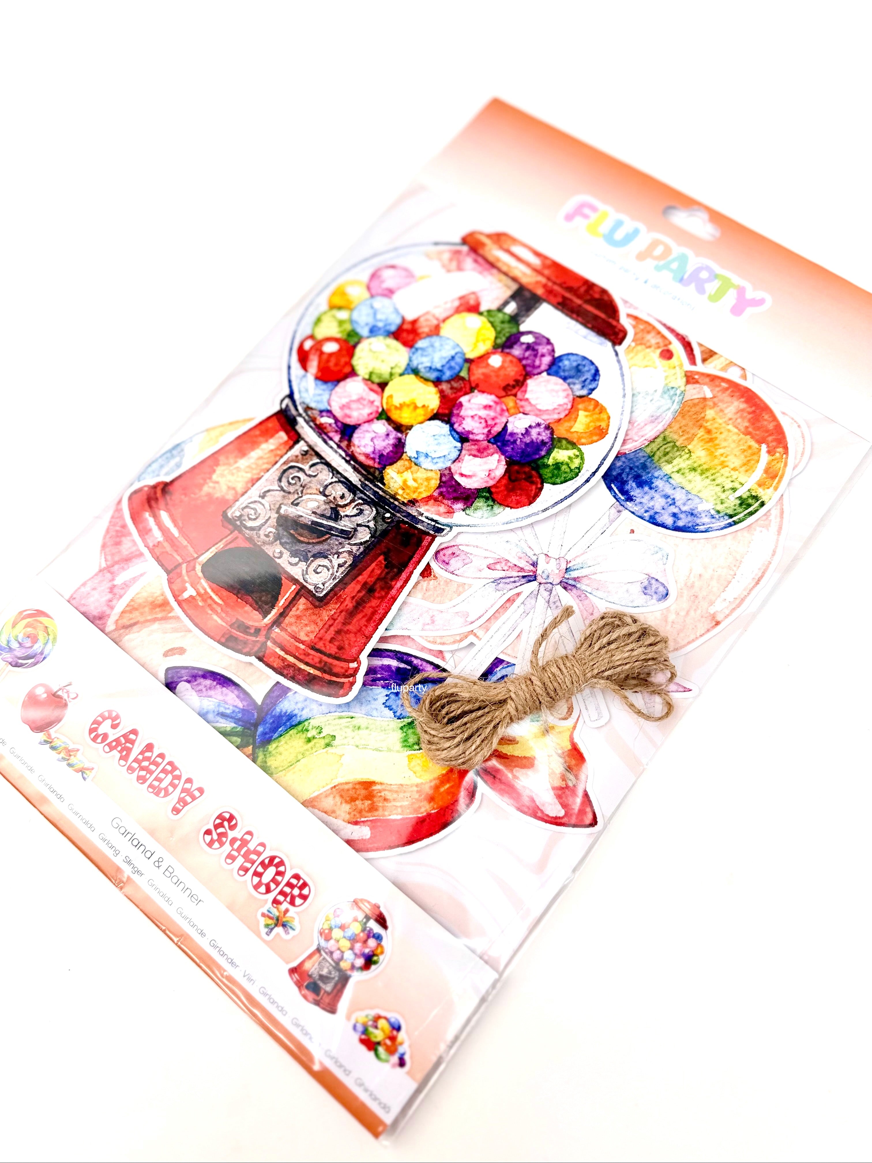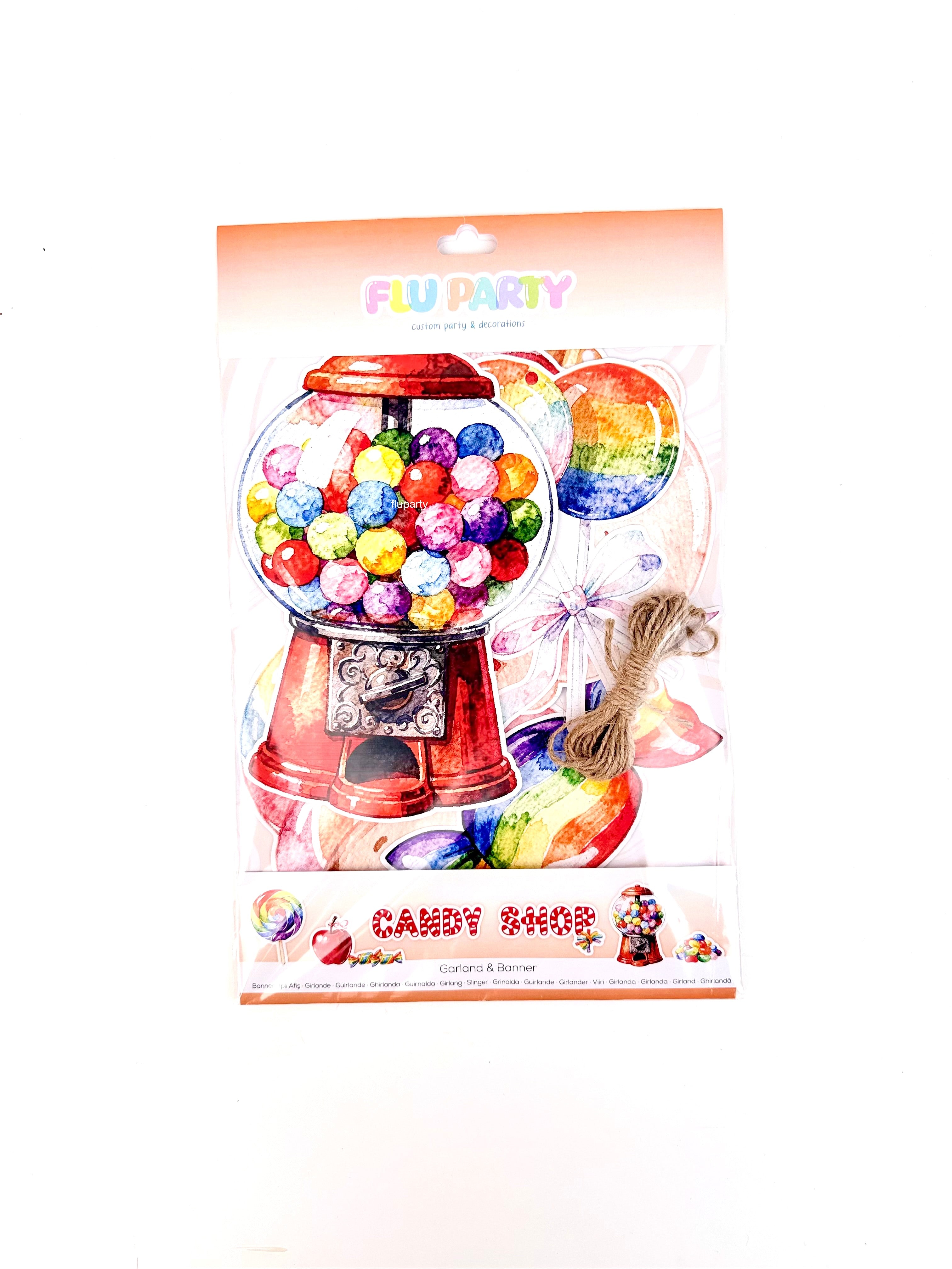 Candy Shop temalı bu renkli doğum günü banner, şeker figürleri ve eğlenceli tasarımıyla parti alanına neşeli ve canlı bir görünüm kazandırır. Canlı renkleri sayesinde doğum günü masası, duvar arkası veya fotoğraf köşesinde dikkat çekici bir dekor oluşturur. İpli yapısı sayesinde kolayca asılabilir ve parti dekorasyonunu tek hamlede tamamlar. Çocuk doğum günleri için ideal olan bu banner, Candy Shop konseptli süslemelerle uyumlu şekilde tasarlanmıştır.