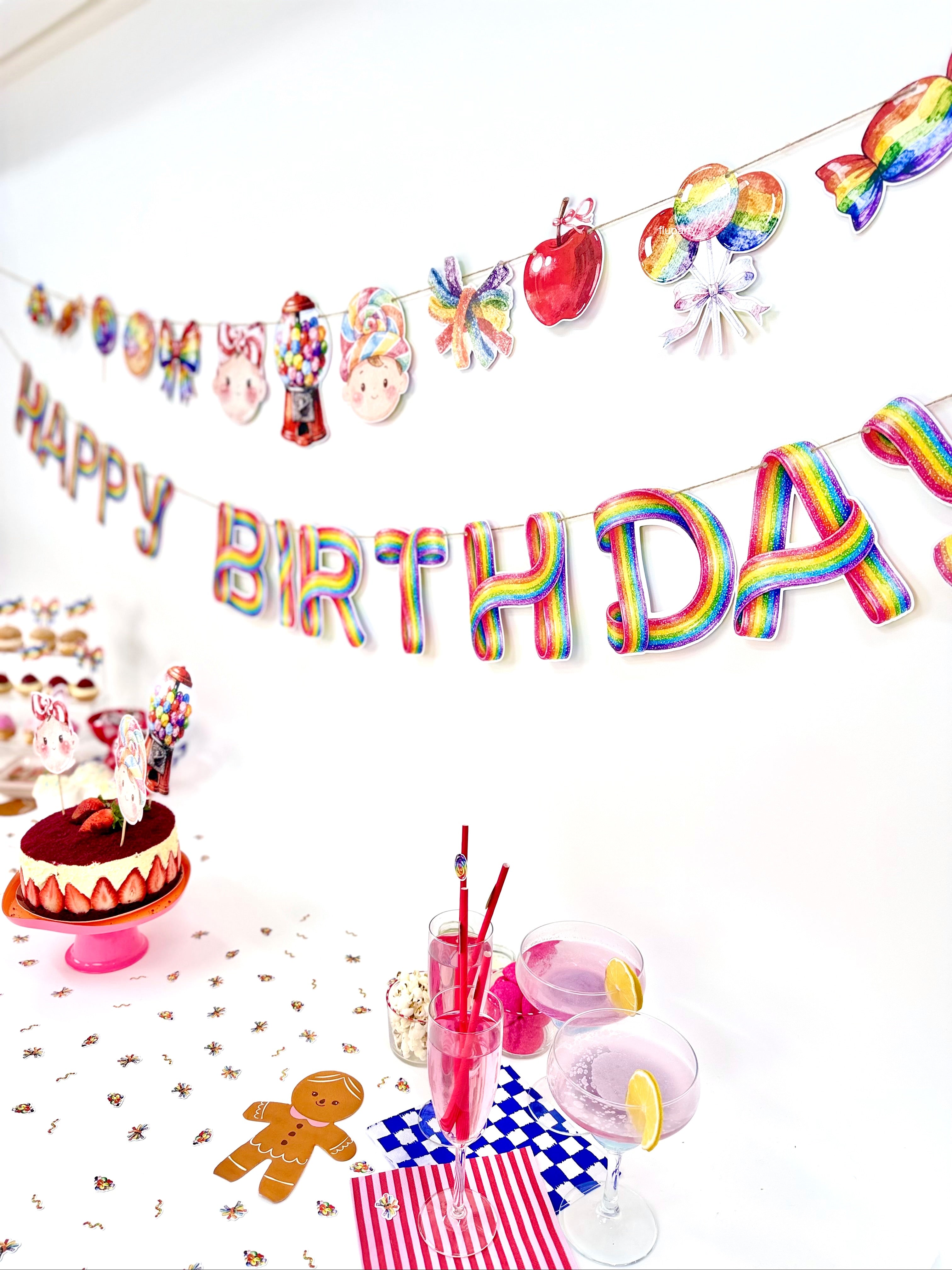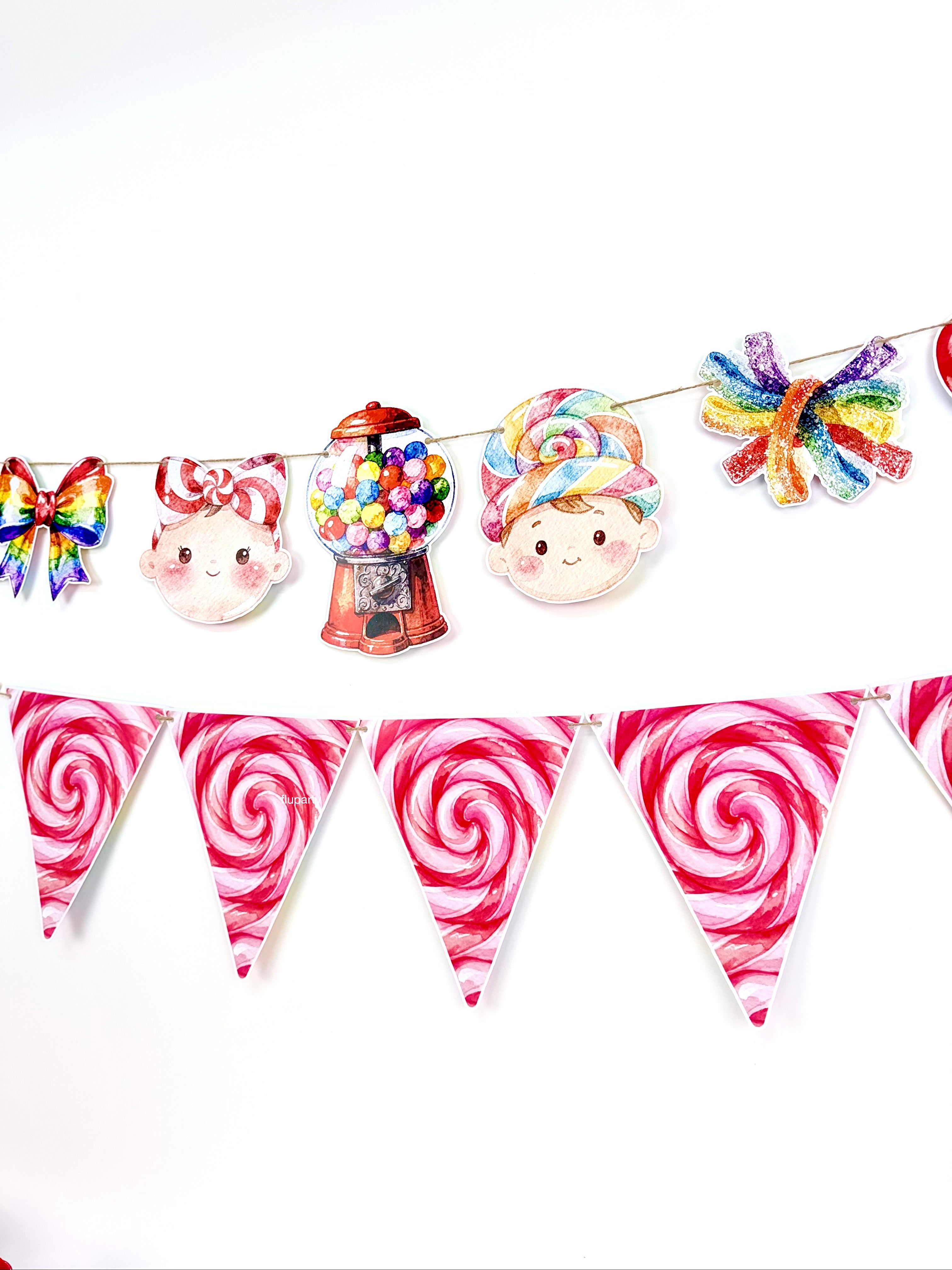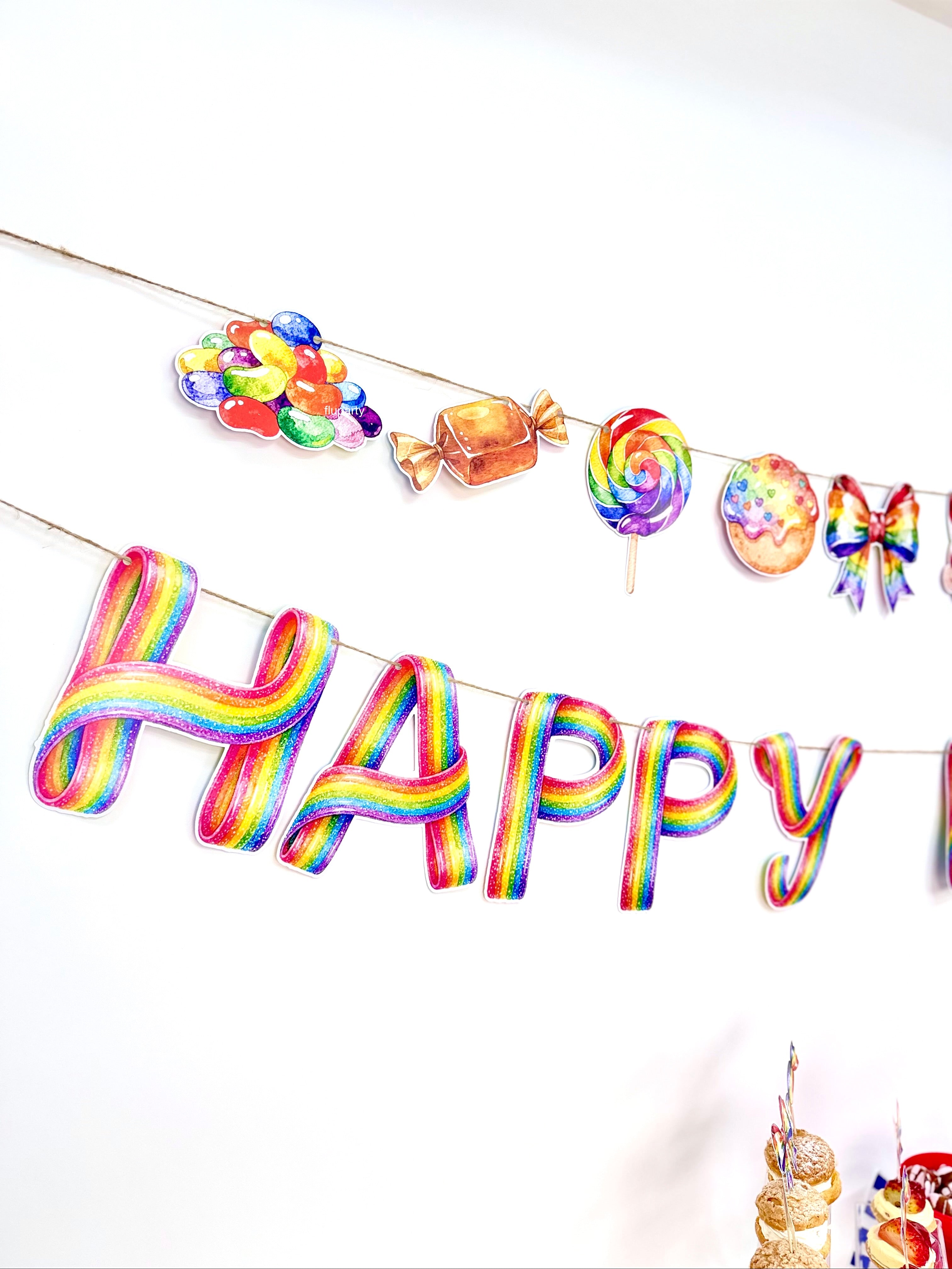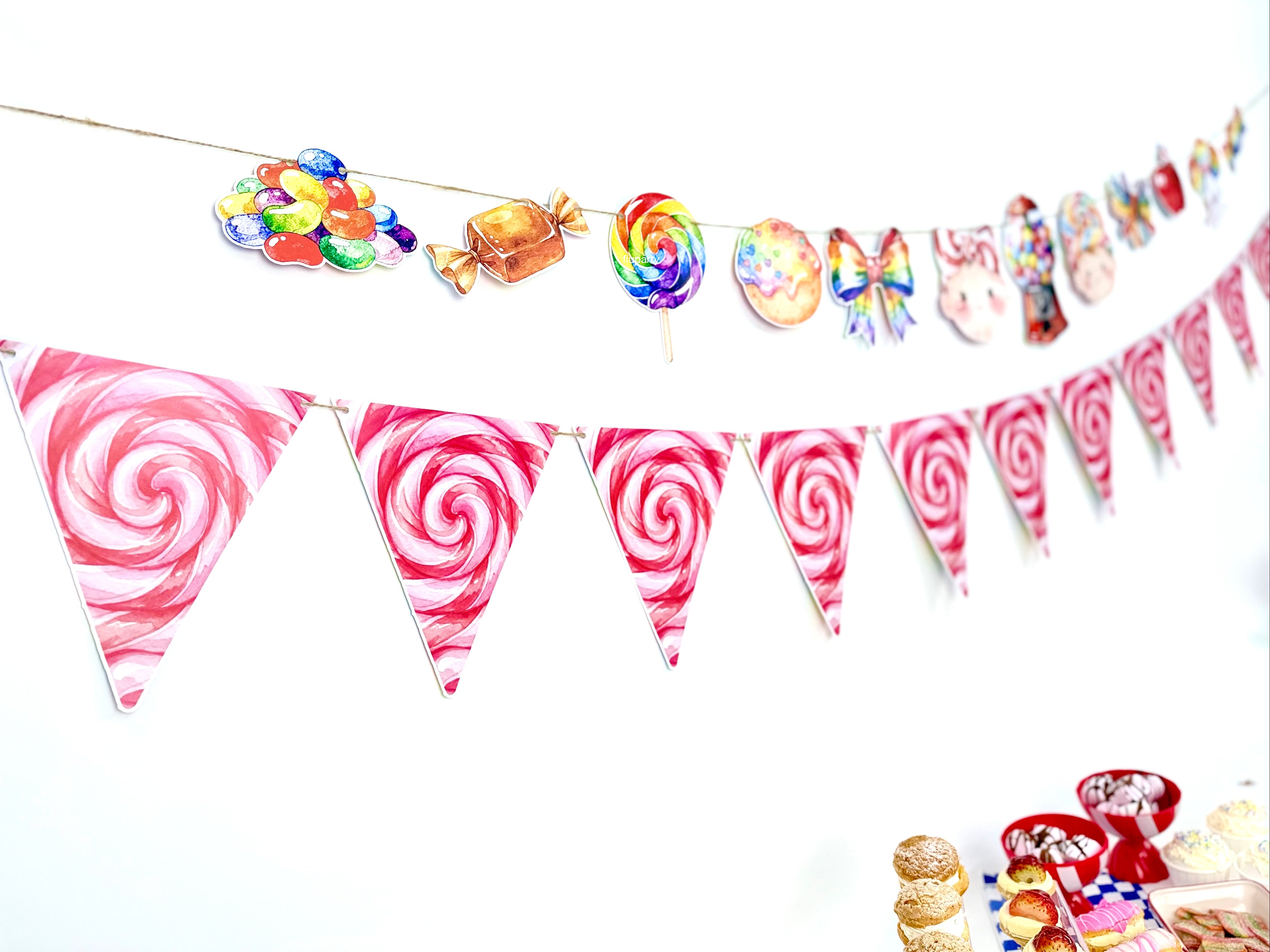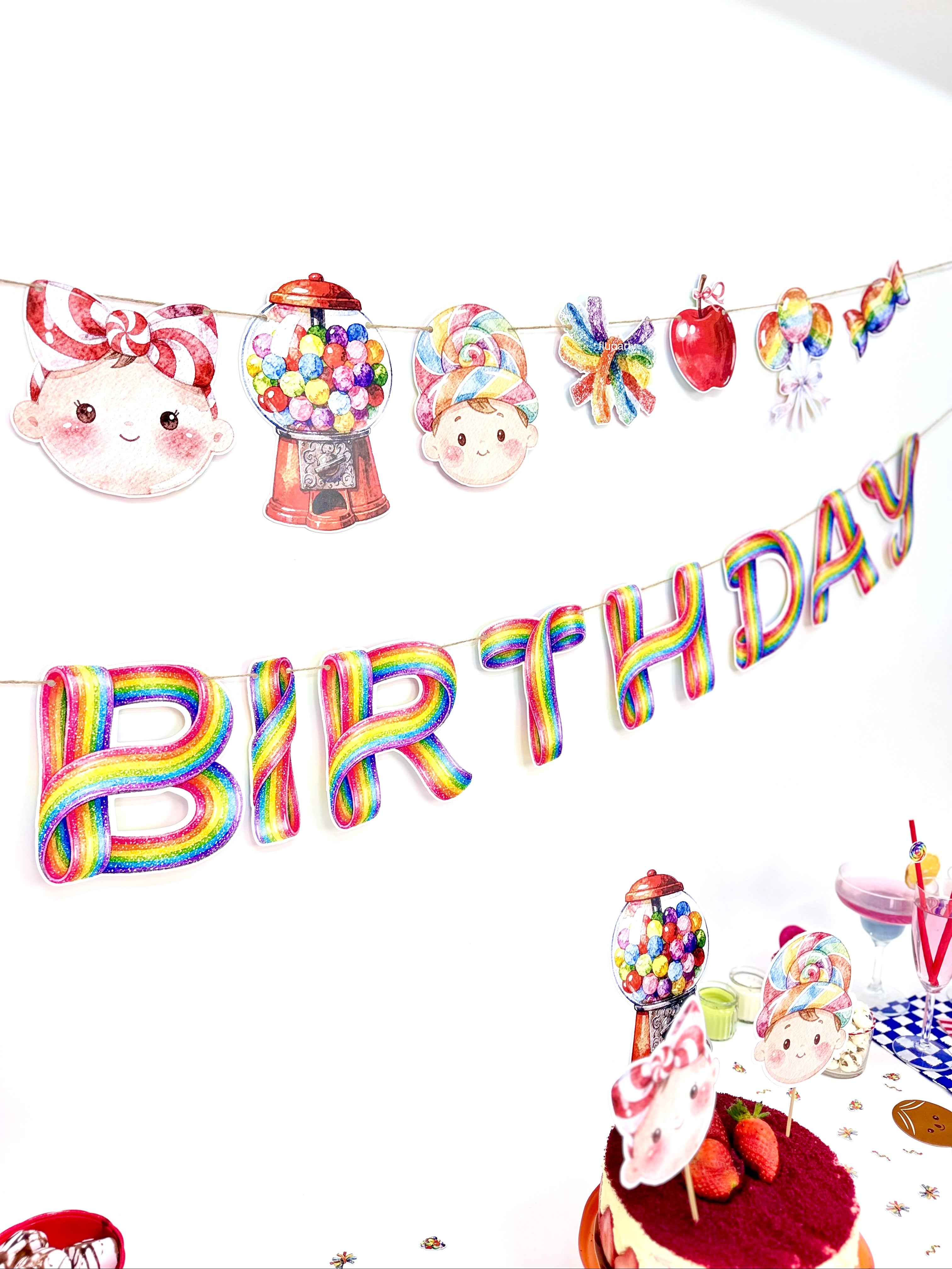 Candy Shop temalı bu renkli doğum günü banner, şeker figürleri ve eğlenceli tasarımıyla parti alanına neşeli ve canlı bir görünüm kazandırır. Canlı renkleri sayesinde doğum günü masası, duvar arkası veya fotoğraf köşesinde dikkat çekici bir dekor oluşturur. İpli yapısı sayesinde kolayca asılabilir ve parti dekorasyonunu tek hamlede tamamlar. Çocuk doğum günleri için ideal olan bu banner, Candy Shop konseptli süslemelerle uyumlu şekilde tasarlanmıştır.