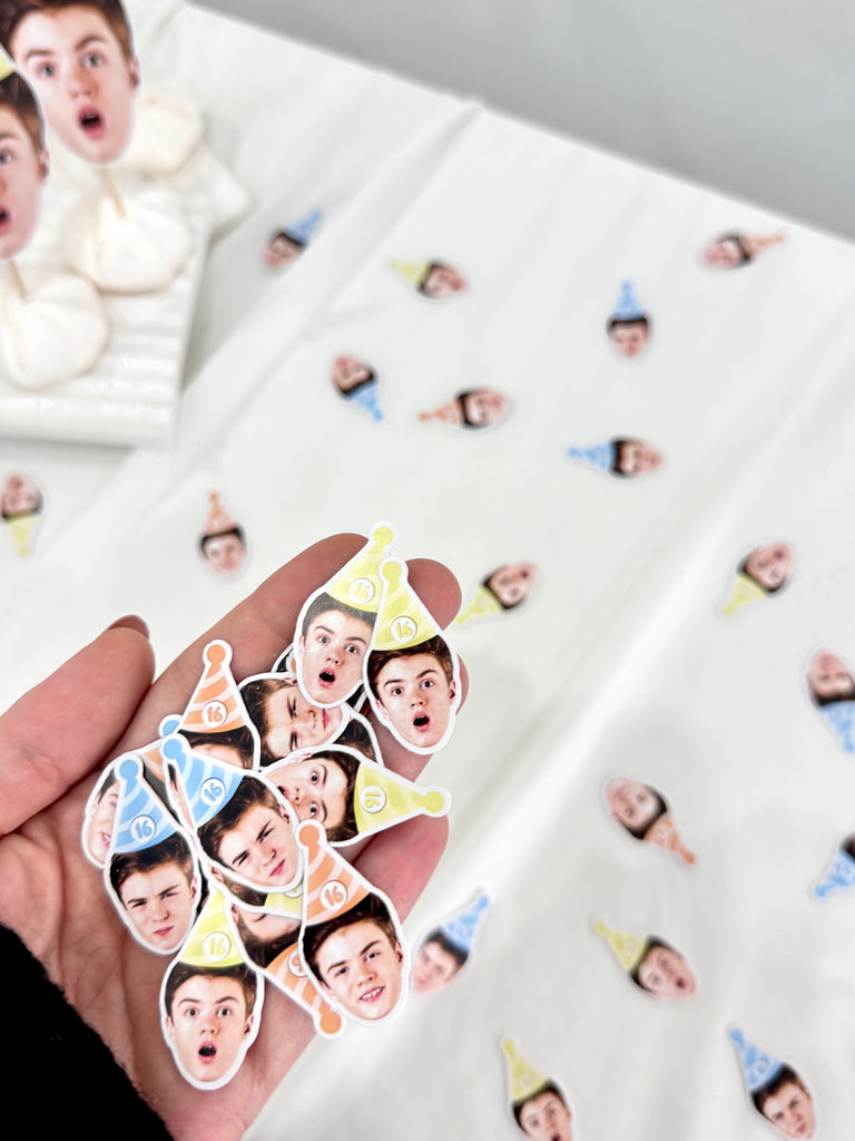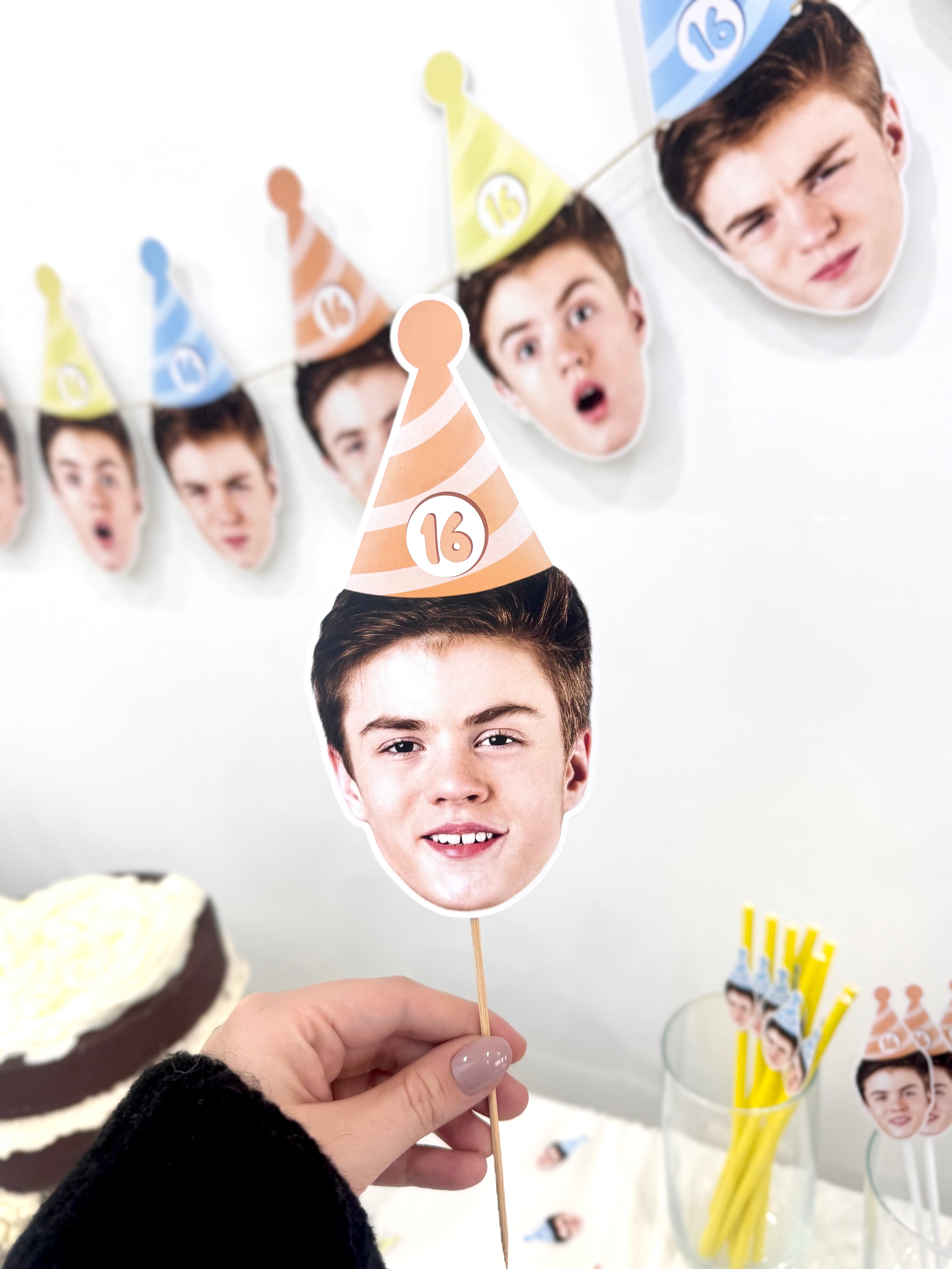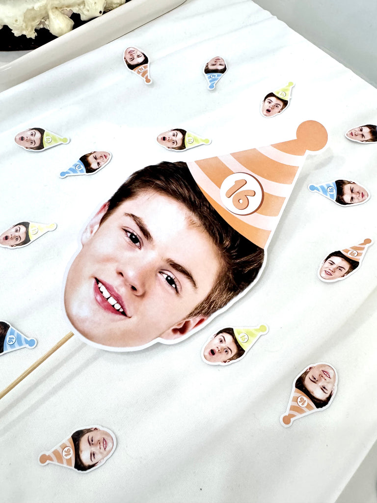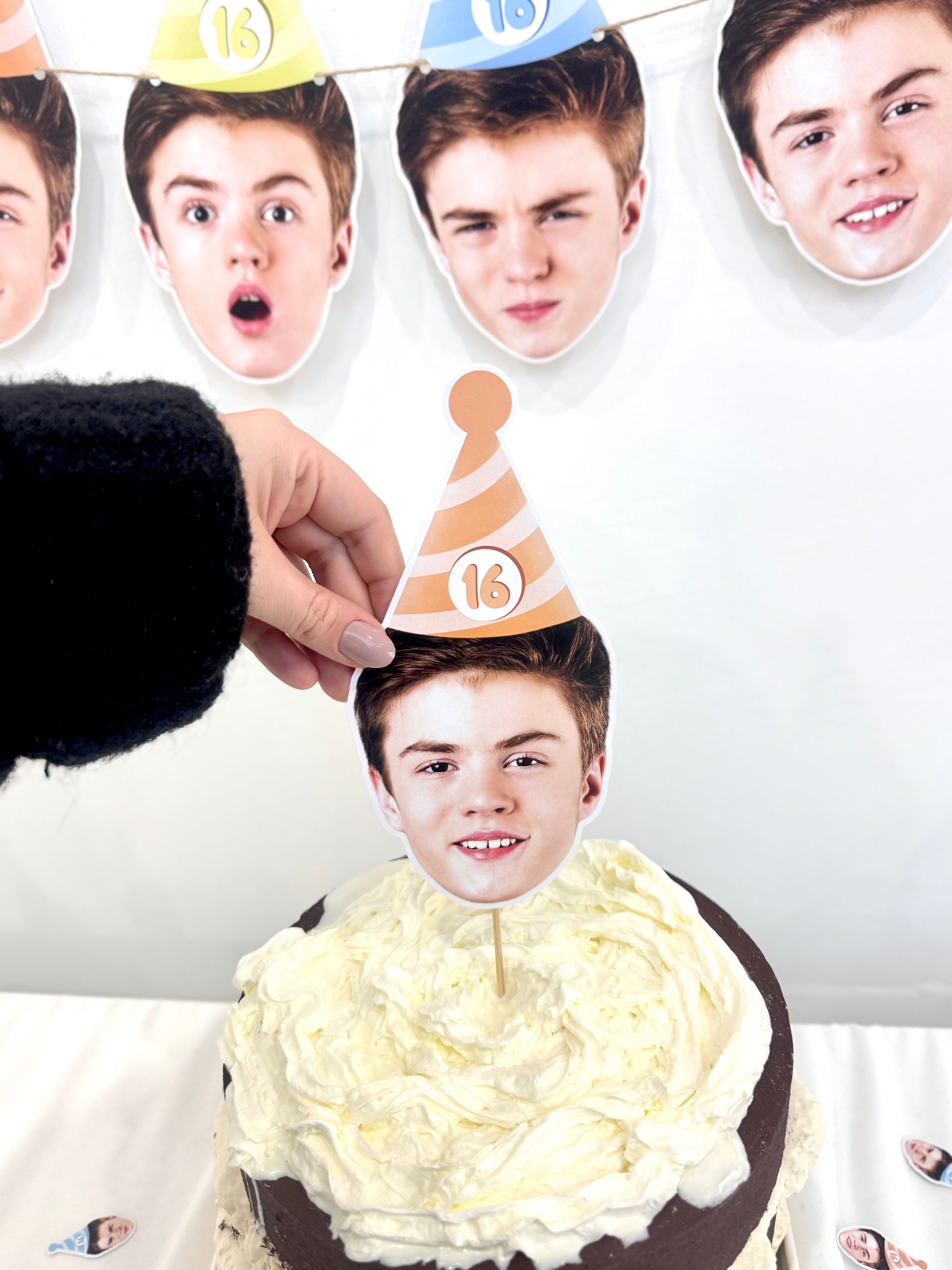 Kişisel fotoğrafla hazırlanan 16 yaş cake topper, partine eğlenceli bir enerji katar. Turuncu-beyaz şapka tasarımıyla canlı ve genç bir görünüm sağlar.