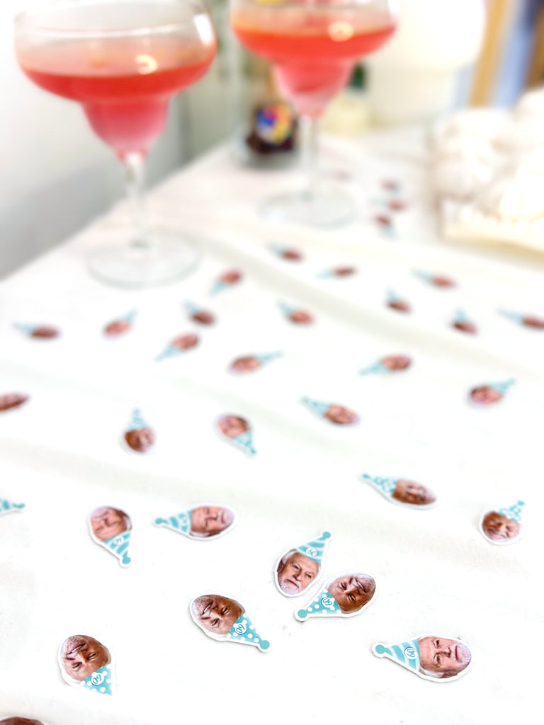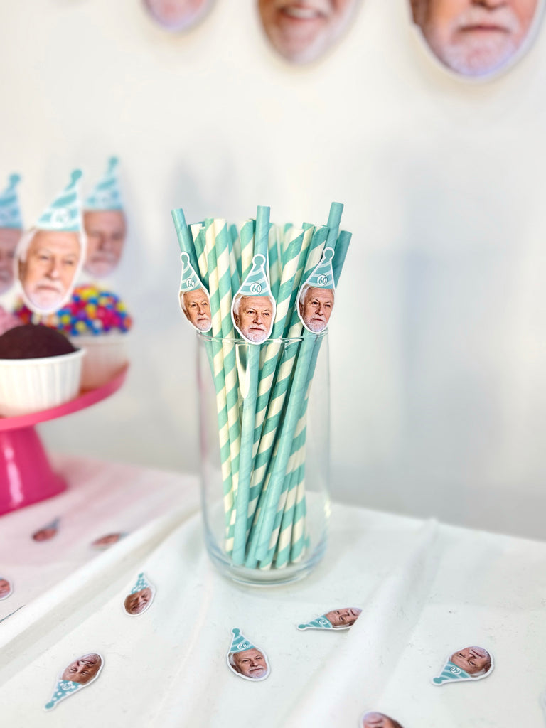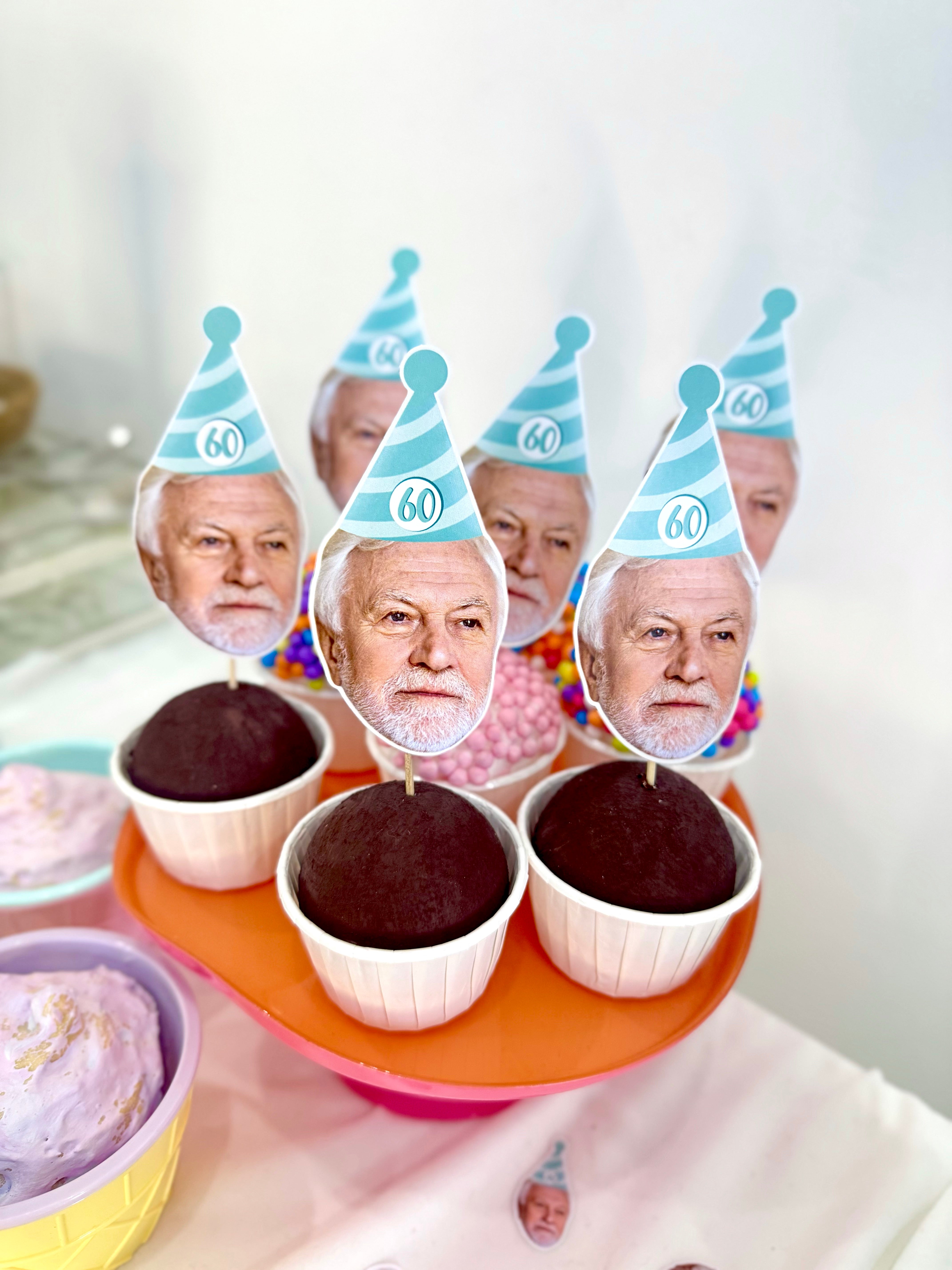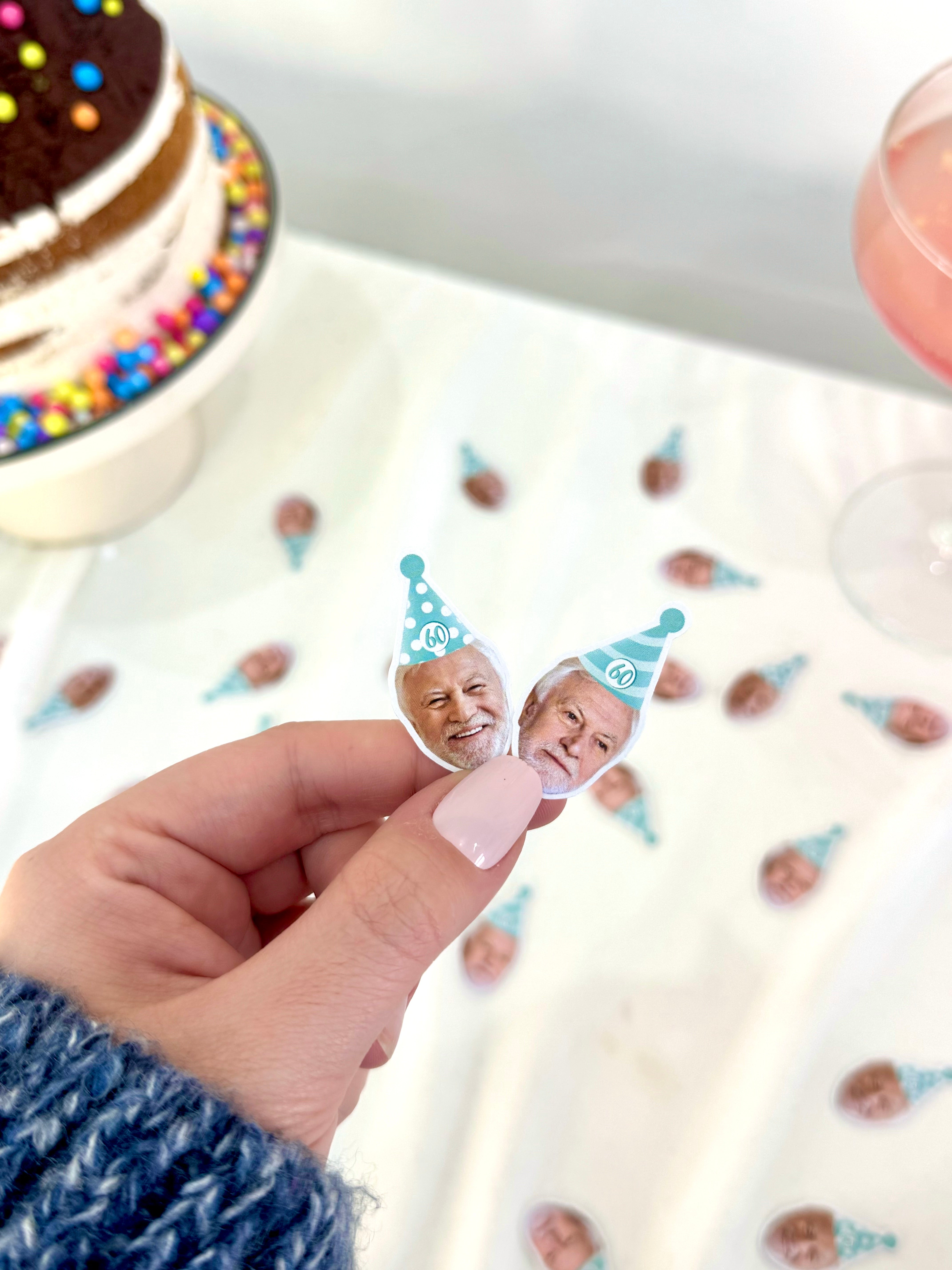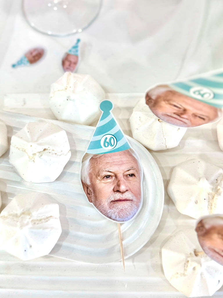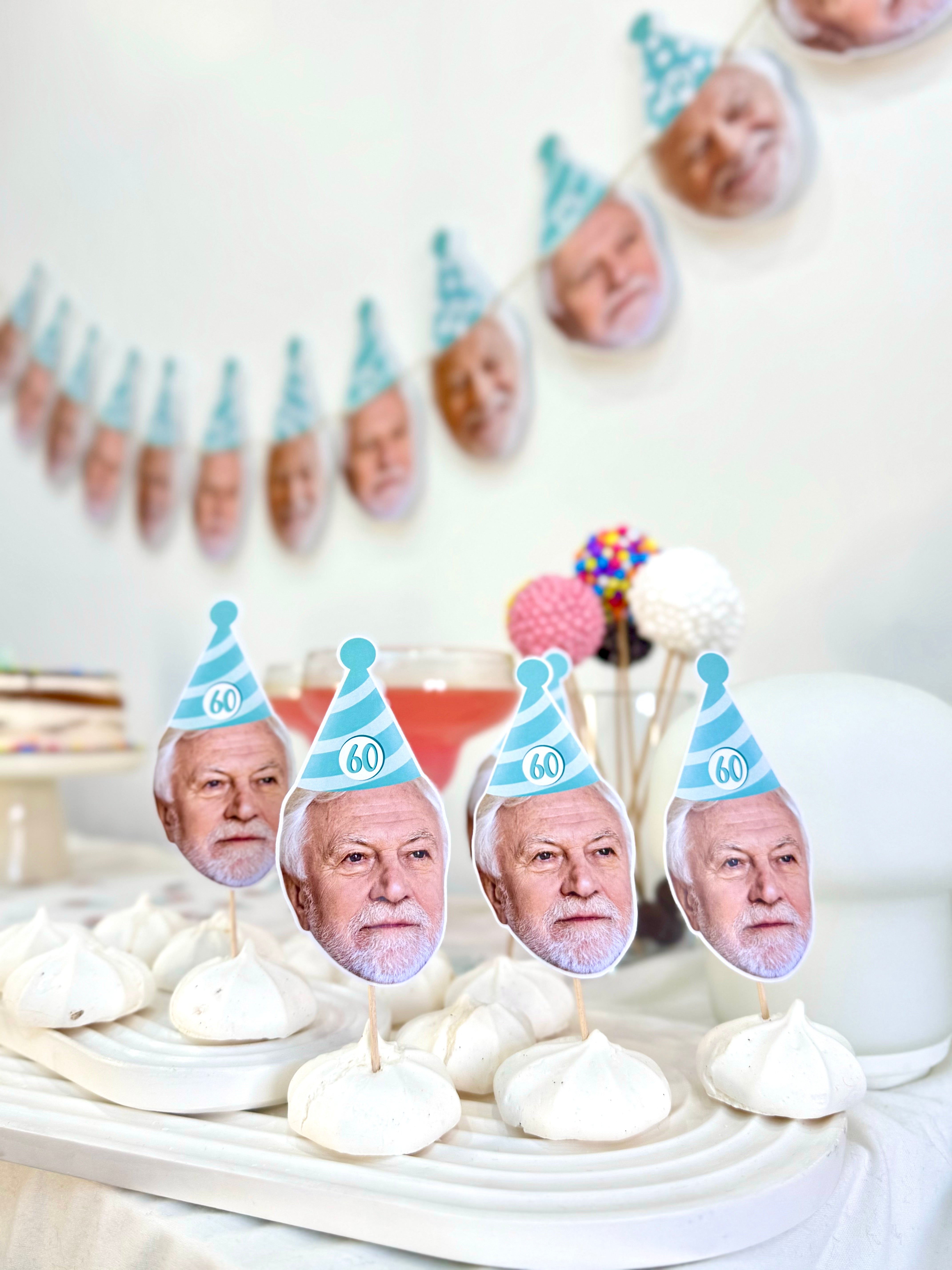 Mavi-beyaz çizgili parti şapkasıyla hazırlanmış bu topper’lar, 60. yaş doğum gününüze zarif ama eğlenceli bir dokunuş katar. Her biri özel fotoğrafla hazırlanır.