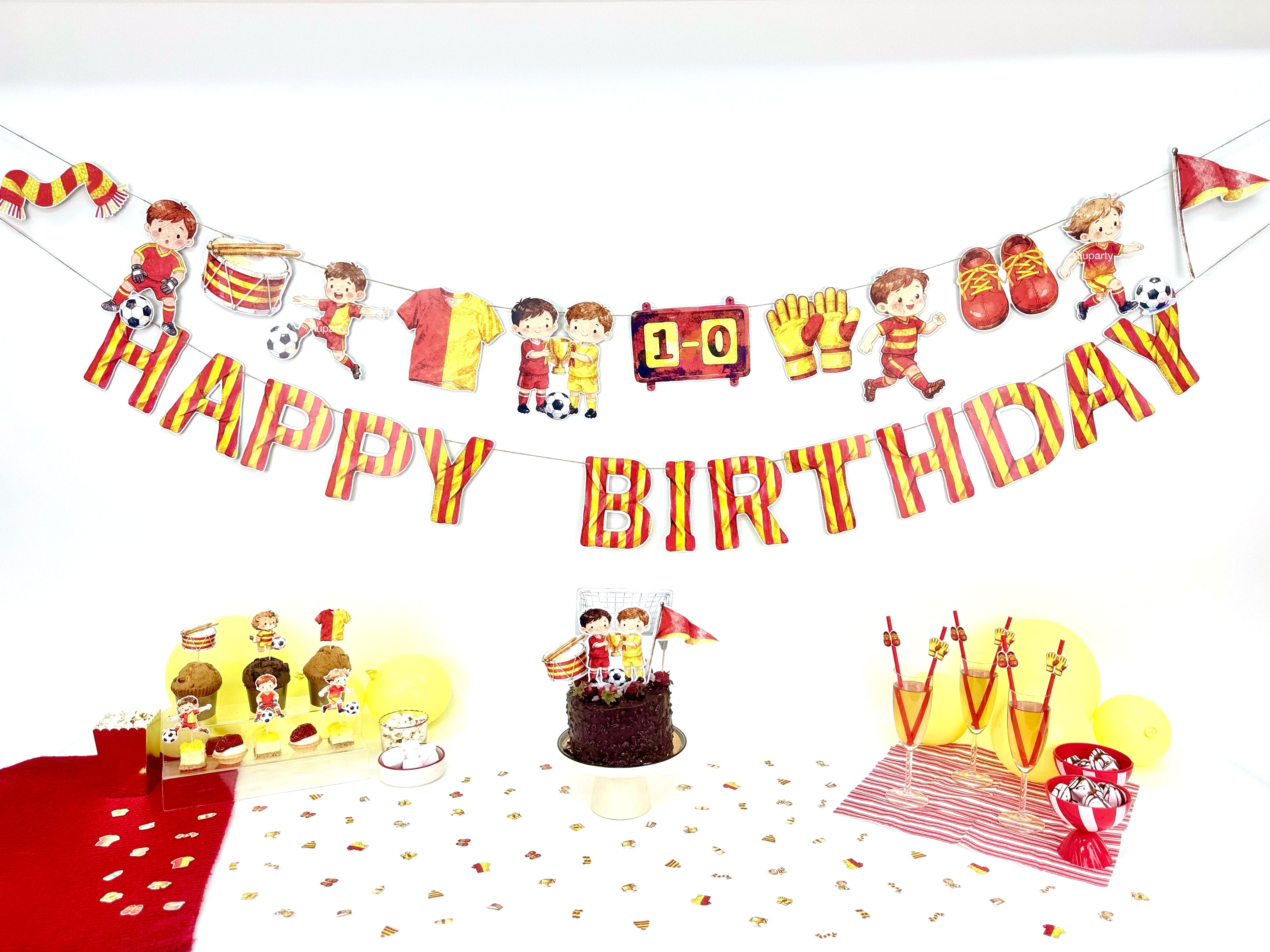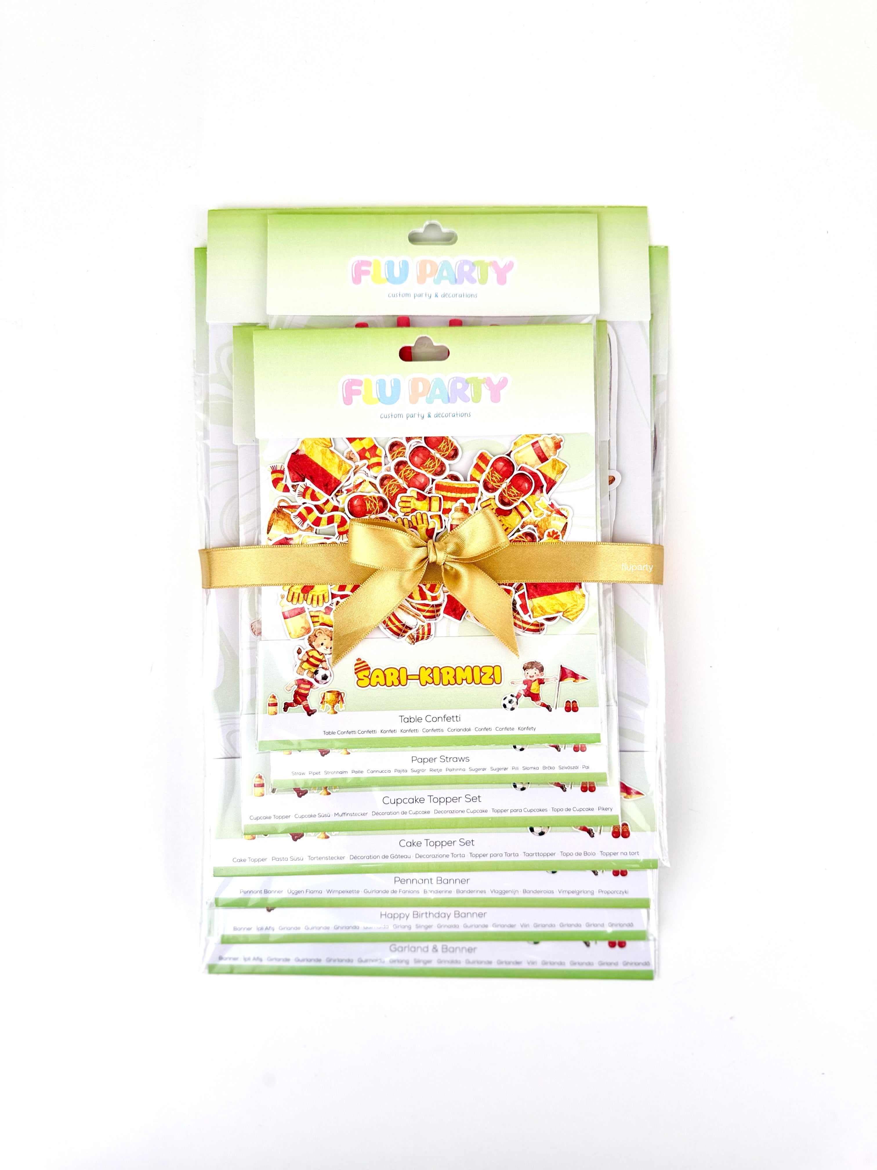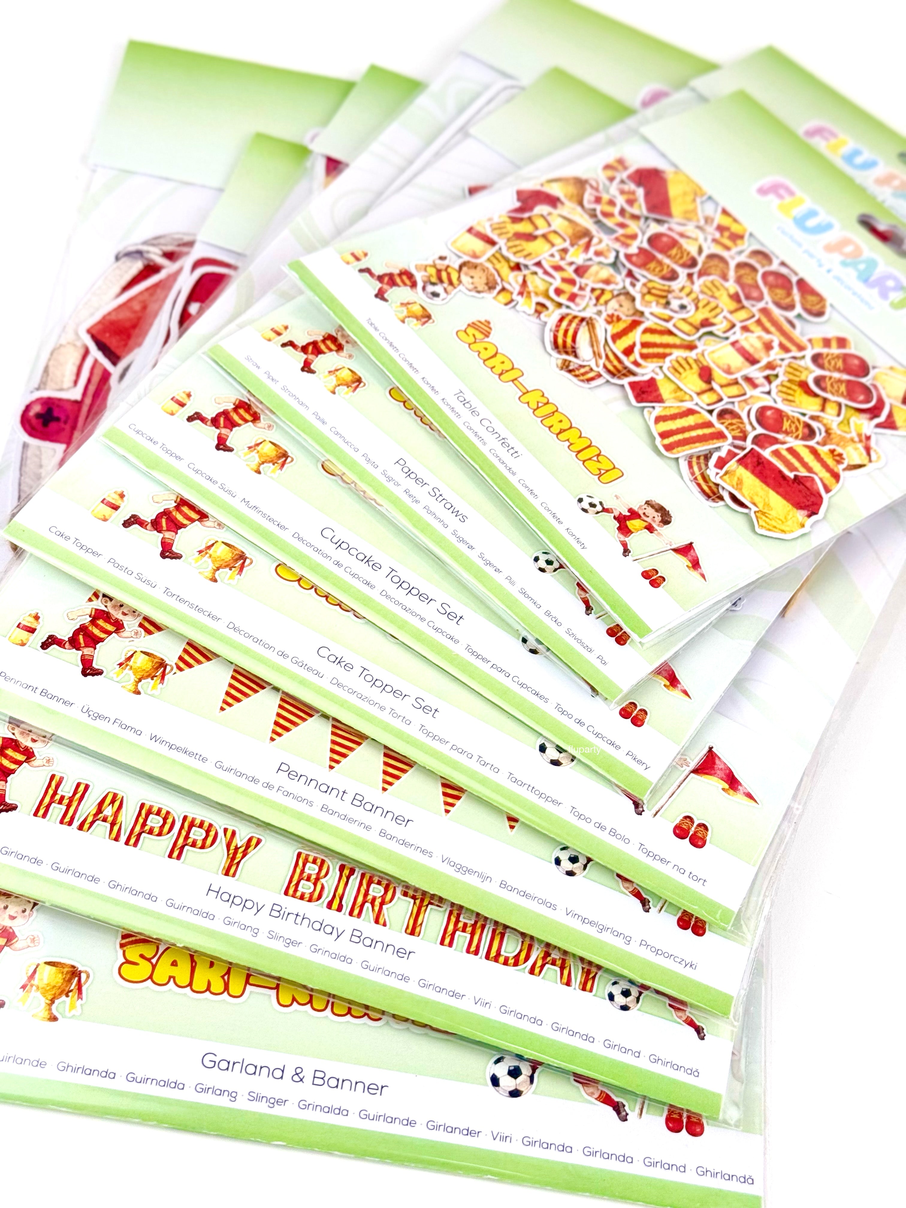 Sarı - Kırmızı futbol temalı parti seti, stadyum coşkusunu kutlama alanına taşır. Futbol detaylarıyla parti dekorunu tek pakette uyumlu ve enerjik bir şekilde tamamlar.