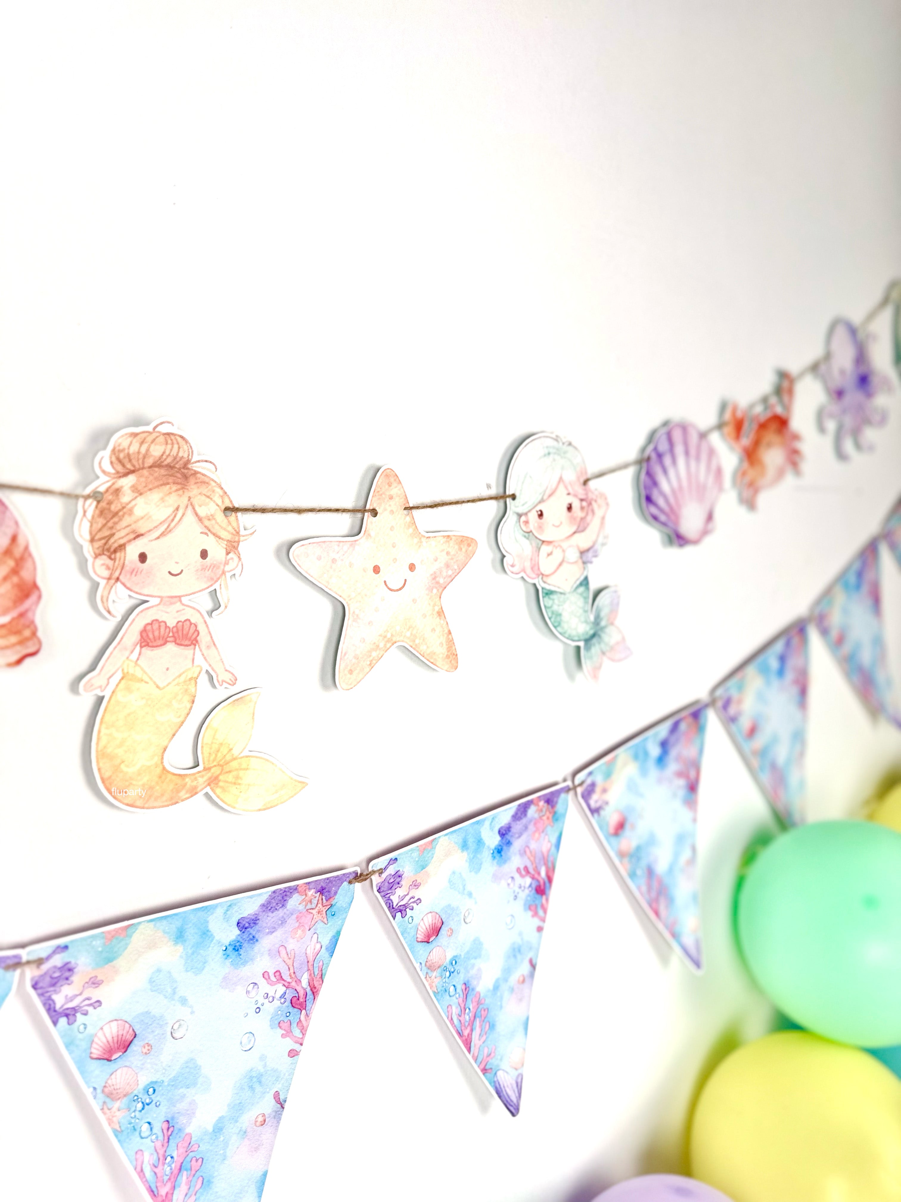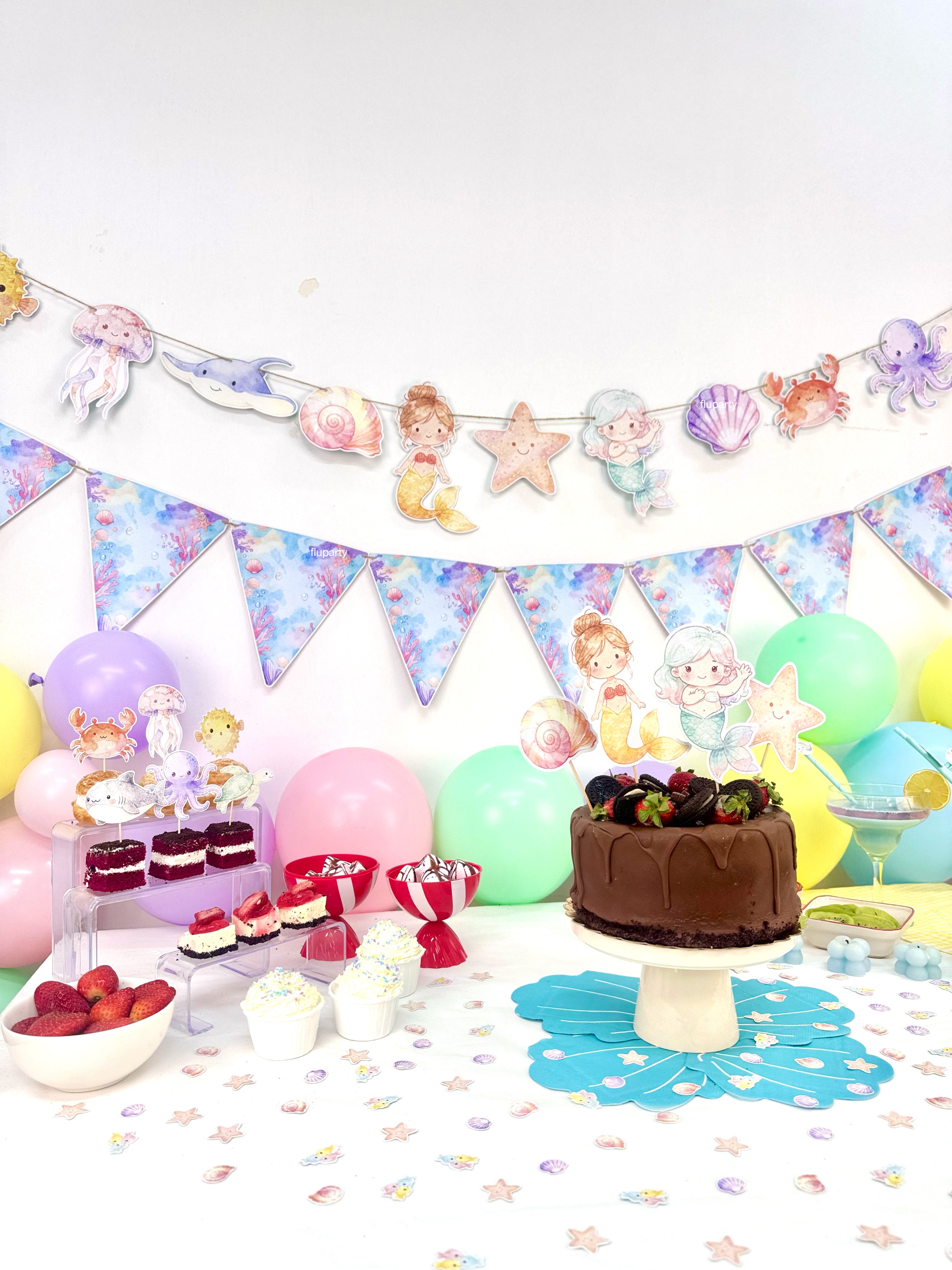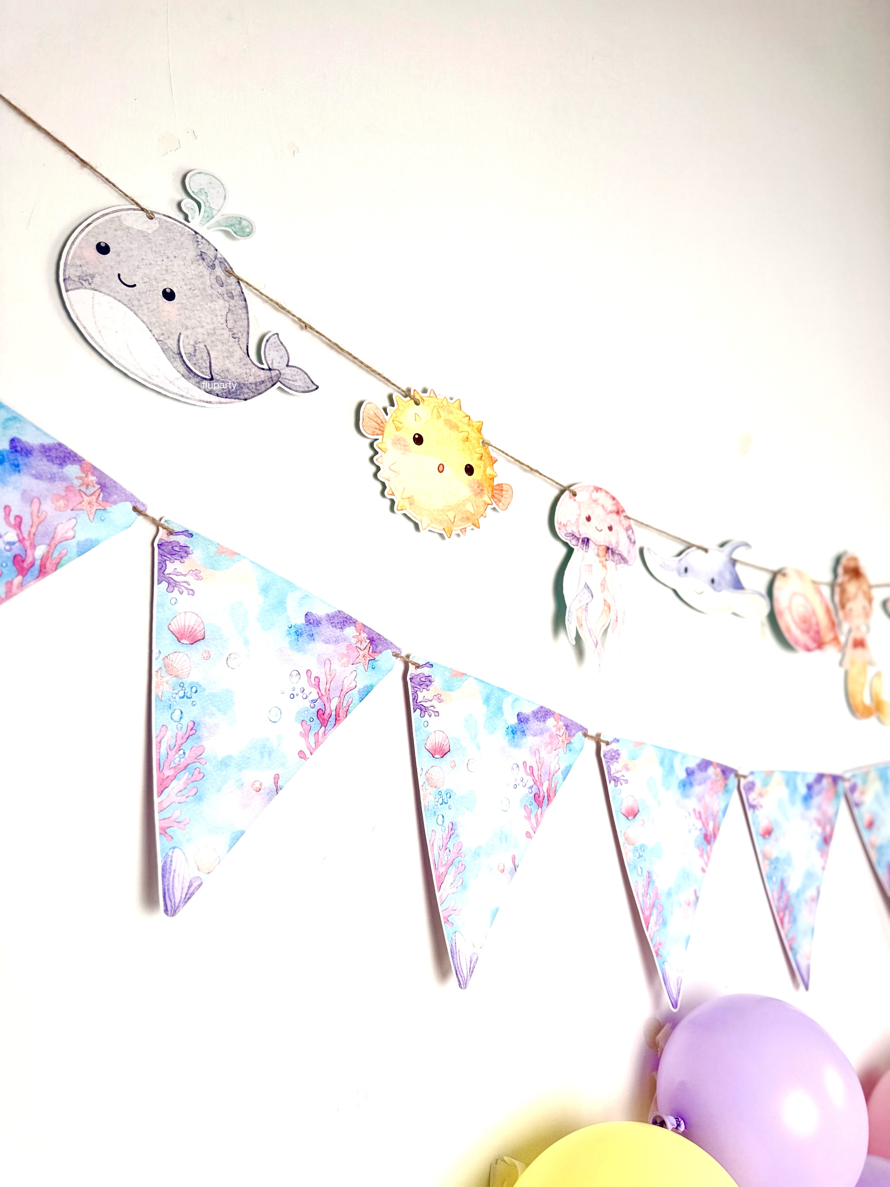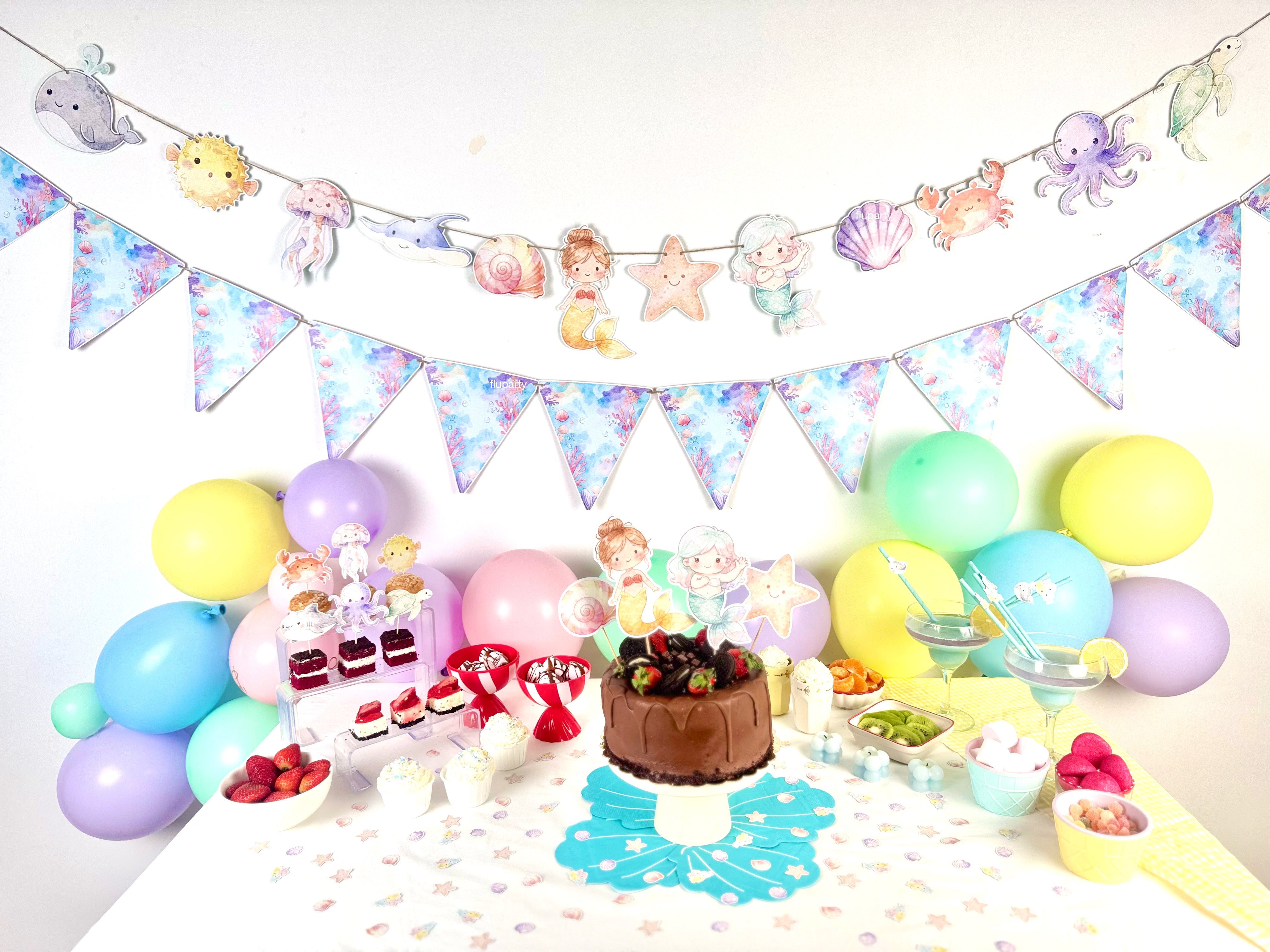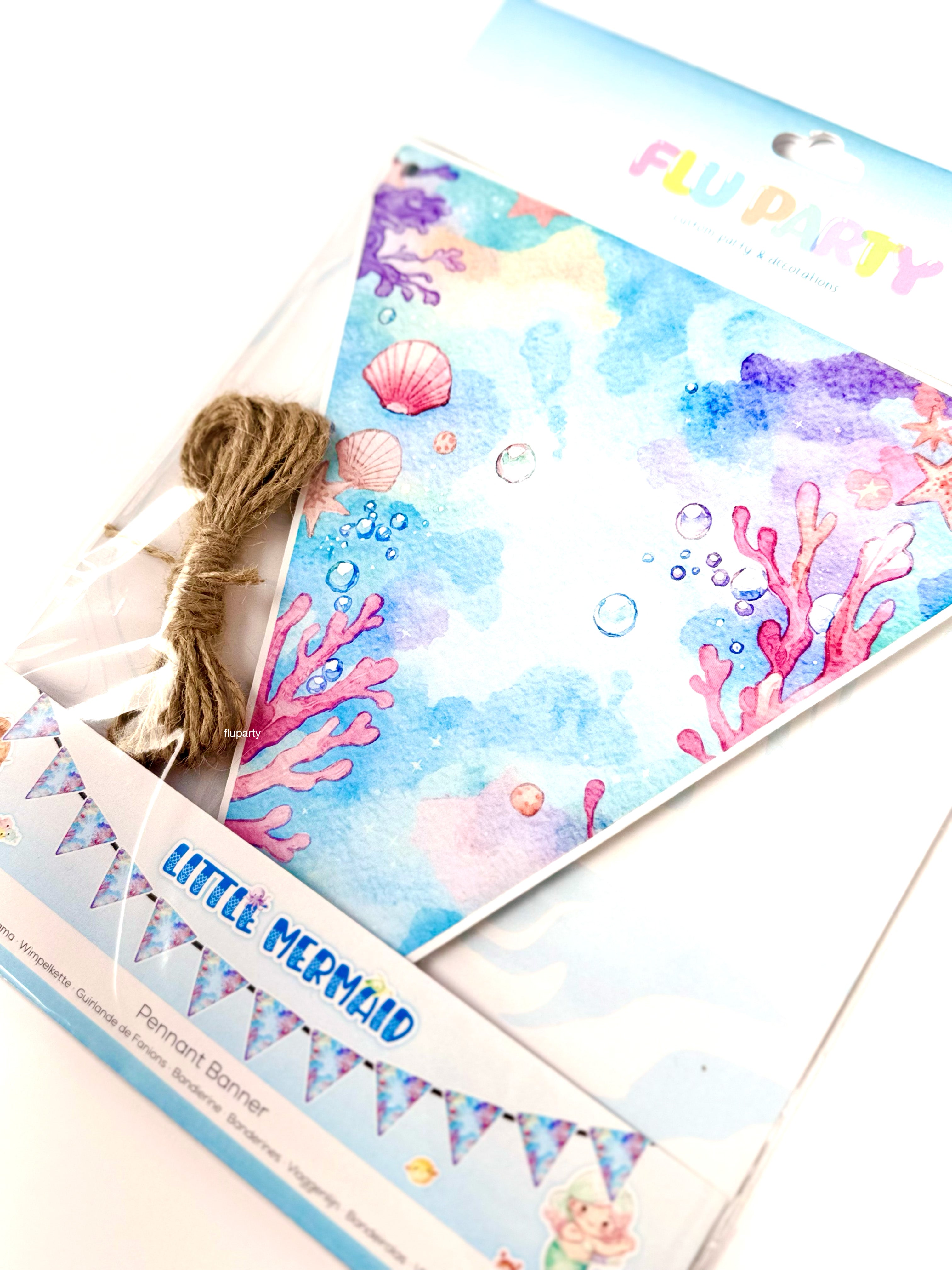 Parti alanına deniz esintisi katan bu üçgen flama banner, minik denizkızı temasının renkli ve büyülü dünyasını yansıtır. Deniz altı detaylarıyla konsept atmosferini güçlendirir.