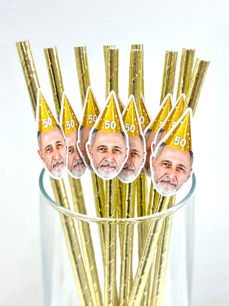 Sarı yıldızlı şapka temalı yüz baskılı cake topper, 50. yaş doğum günü kutlamalarını parlatır. Yüksek baskı kalitesi ve canlı renklerle hazırlanır.