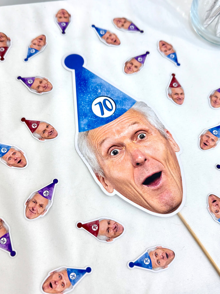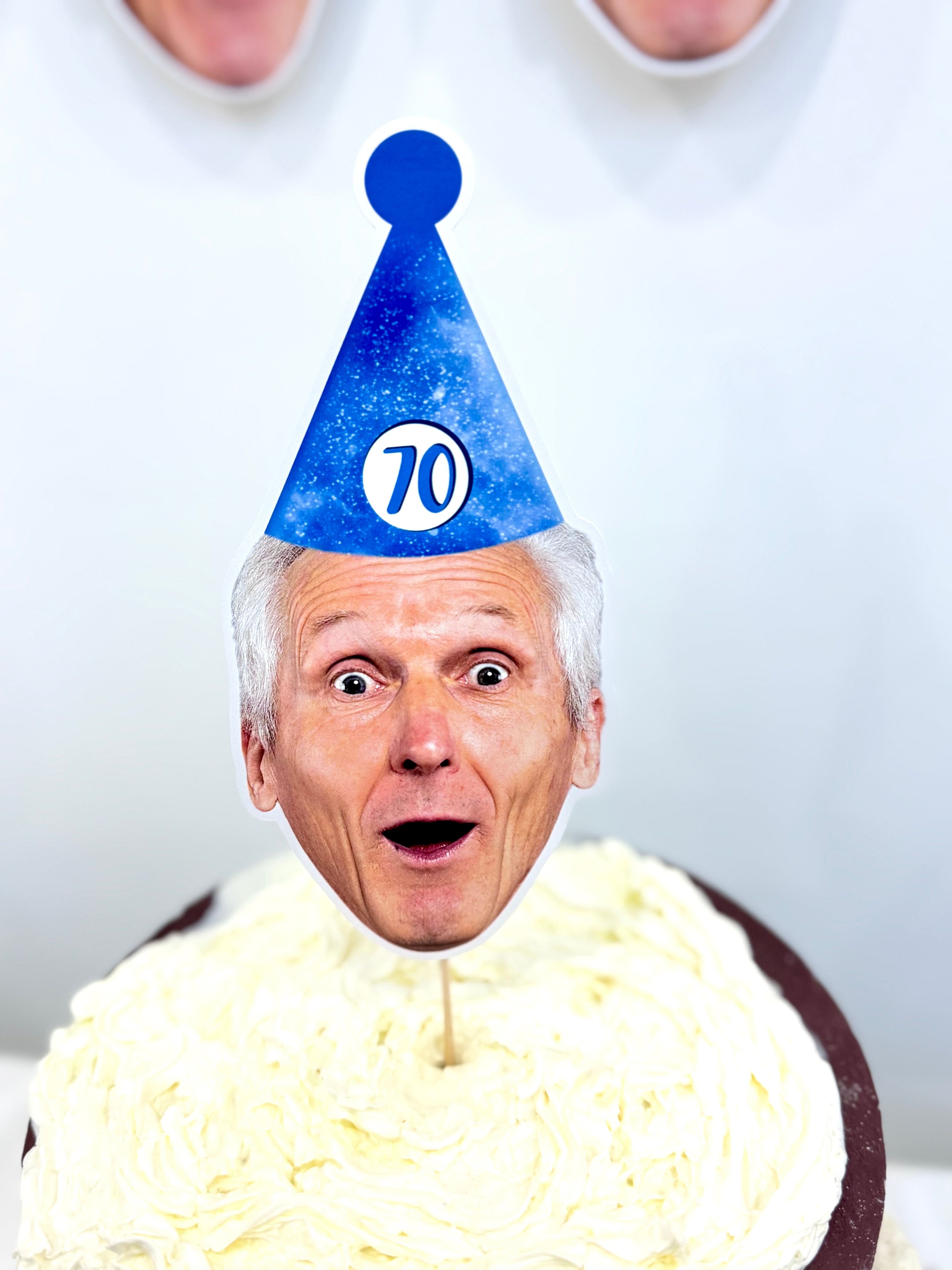 Farklı şapka seçenekleri ile 70. yaş doğum günü pastalarına canlı bir hava katar. Kişisel fotoğrafla üretilen topper’lar profesyonel baskı kalitesiyle hazırlanır.