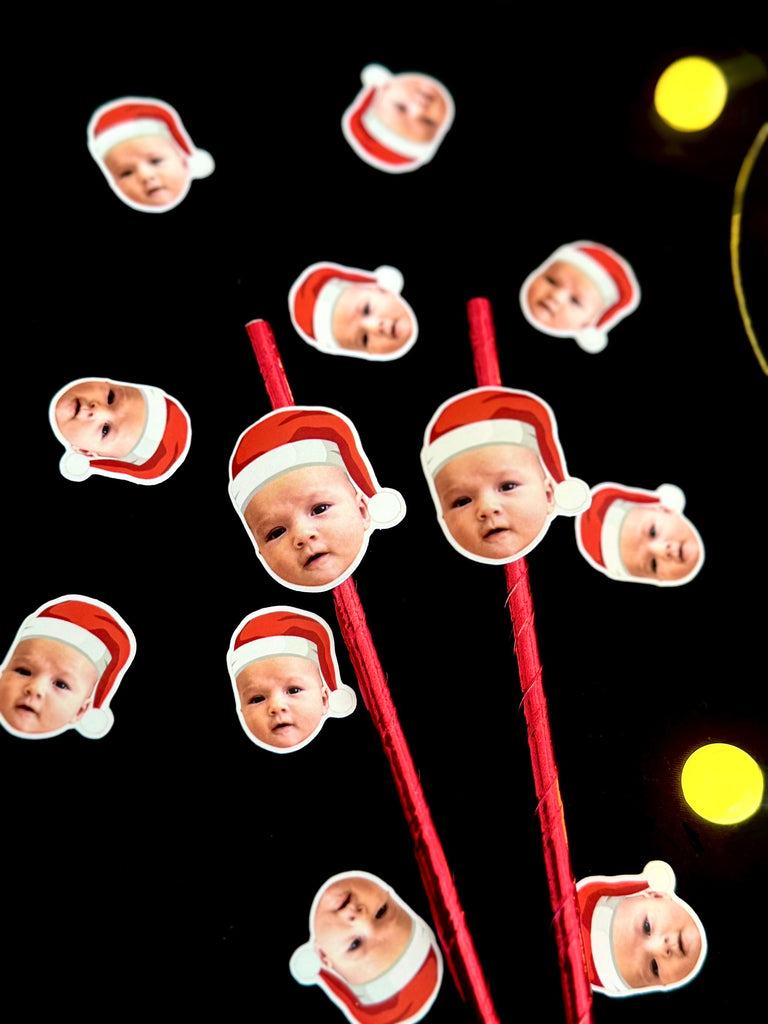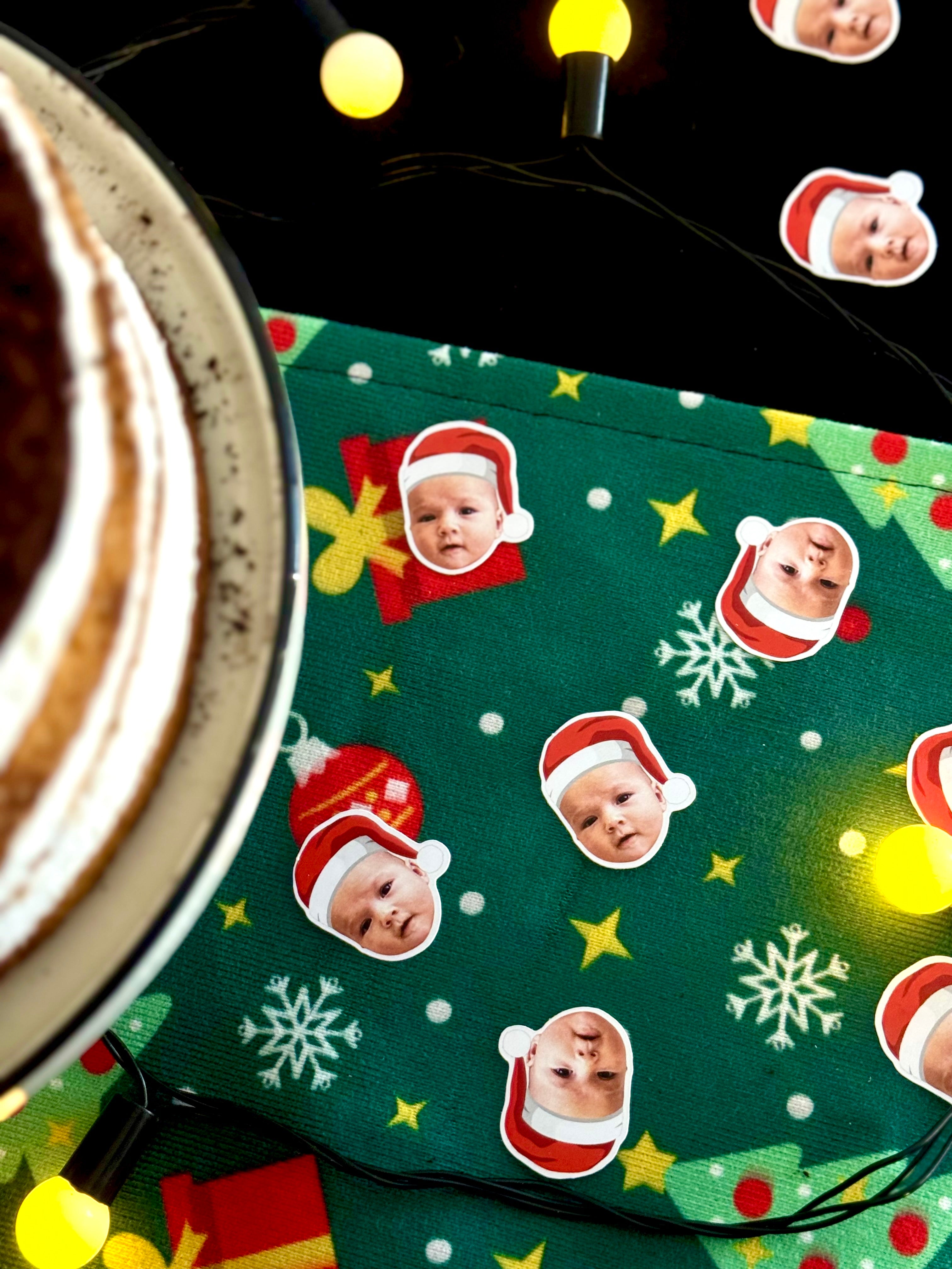 Bebeğinizin fotoğrafı Santa şapkasıyla birleşiyor, yılbaşı sofranıza zarif bir ışıltı katıyor. Her biri kalın parlak kâğıda basılır, özenle kesilir ve masanızı unutulmaz bir yılbaşı sahnesine dönüştürür. Sofistike, duygusal ve tamamen size özel.