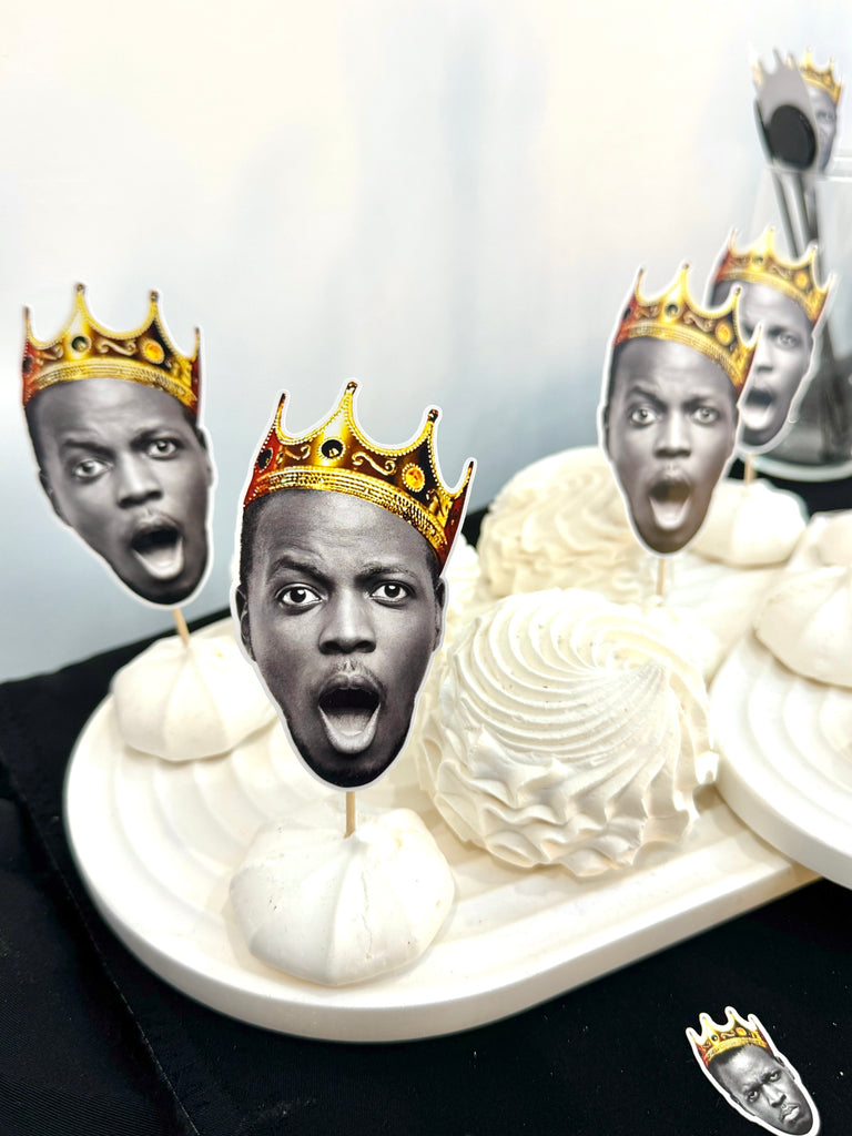 Altın kral tacı tasarımıyla hazırlanan kişiye özel cupcake süsleri, parti masasında şık ve eğlenceli bir görünüm oluşturur.