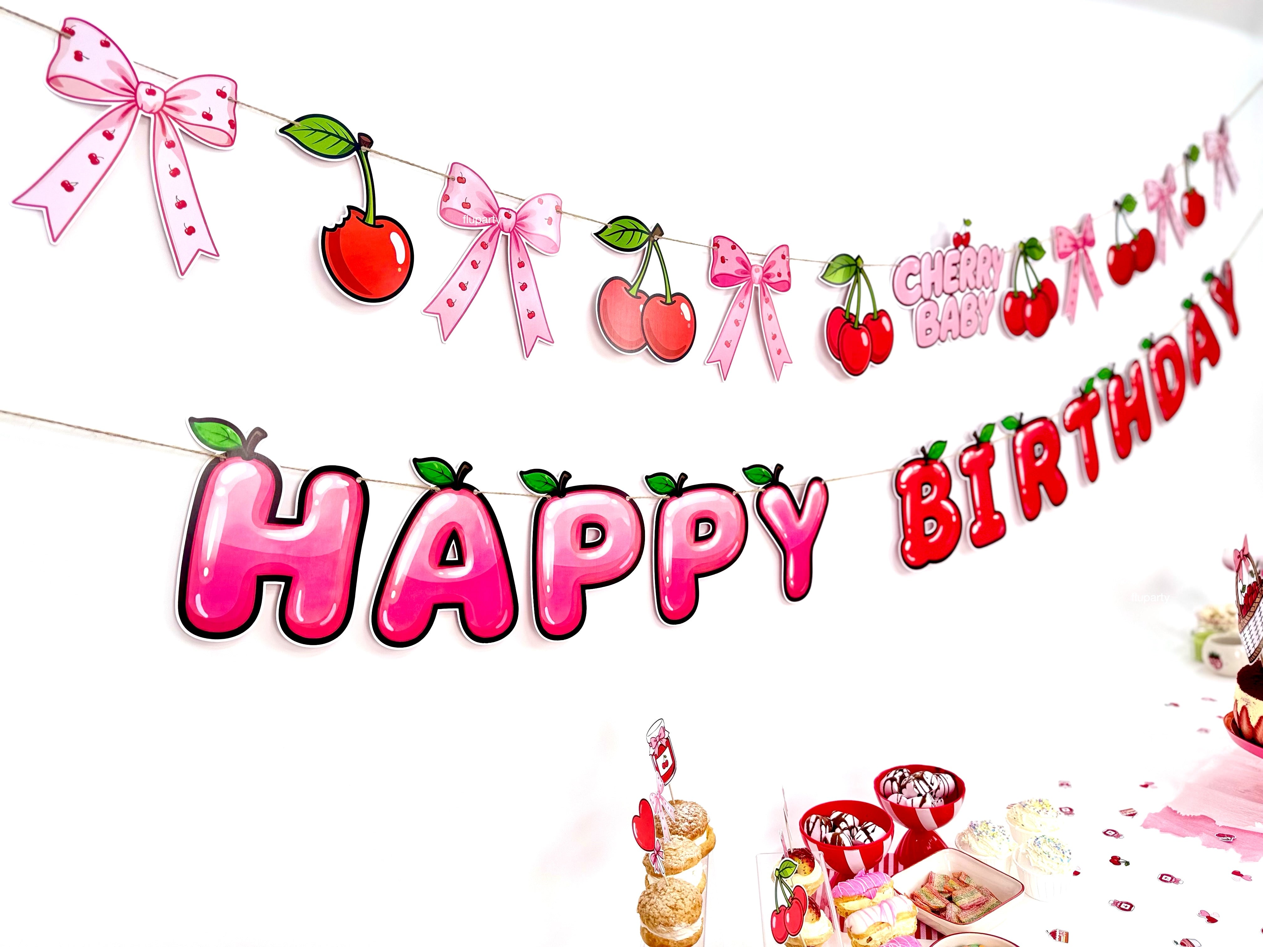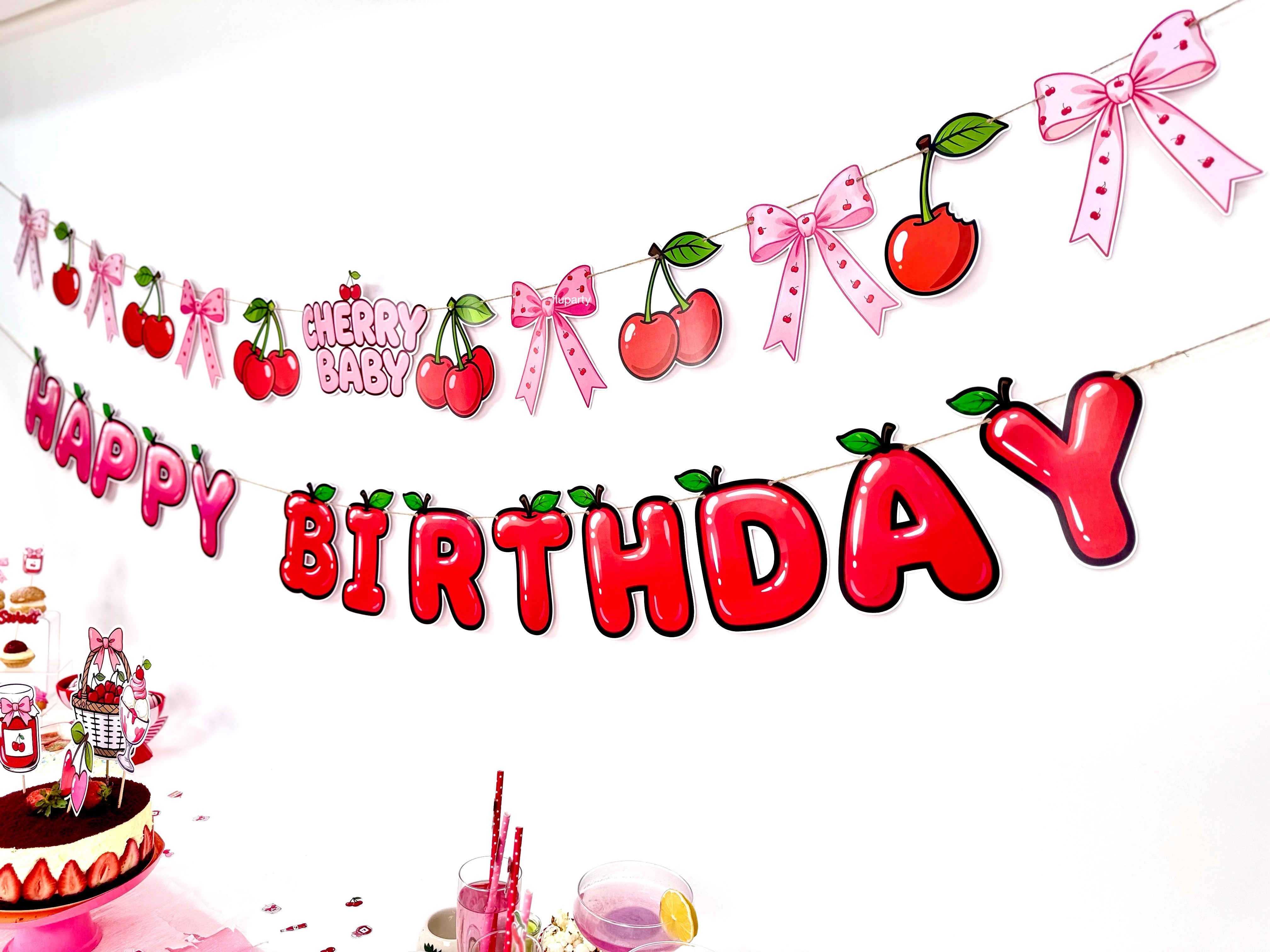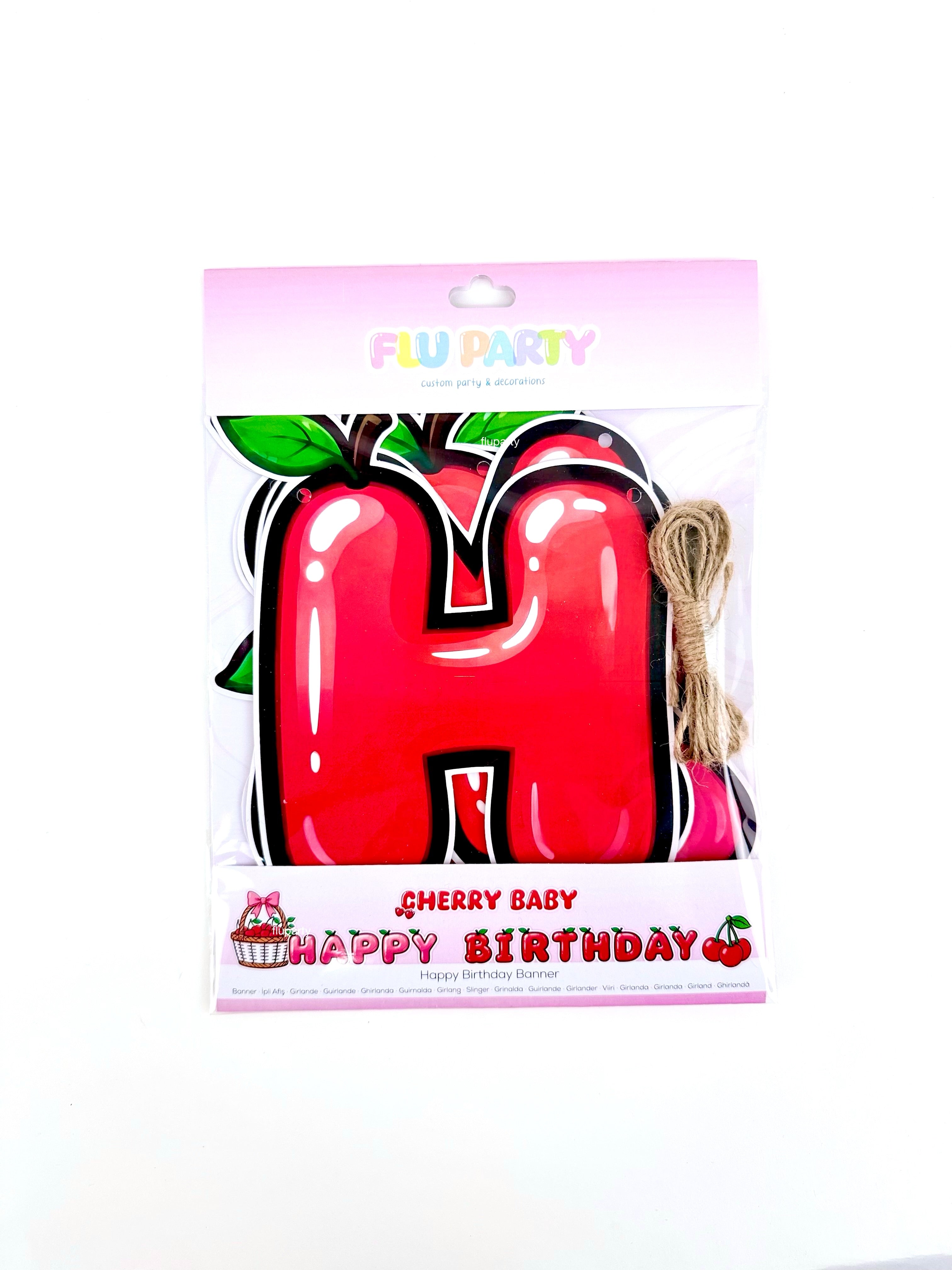 Cherry Baby Happy Birthday banner, kiraz temalı renkli harf tasarımıyla doğum günü dekorasyonuna enerjik ve eğlenceli bir görünüm kazandırır. İpli yapısı sayesinde duvar, masa arkası veya parti alanlarında kolayca asılabilir. Kiraz temalı doğum günleri ve çocuk partileriyle uyumlu olarak tasarlanan bu banner, diğer parti süsleri ile birlikte kullanıldığında dekorasyonu tamamlar.