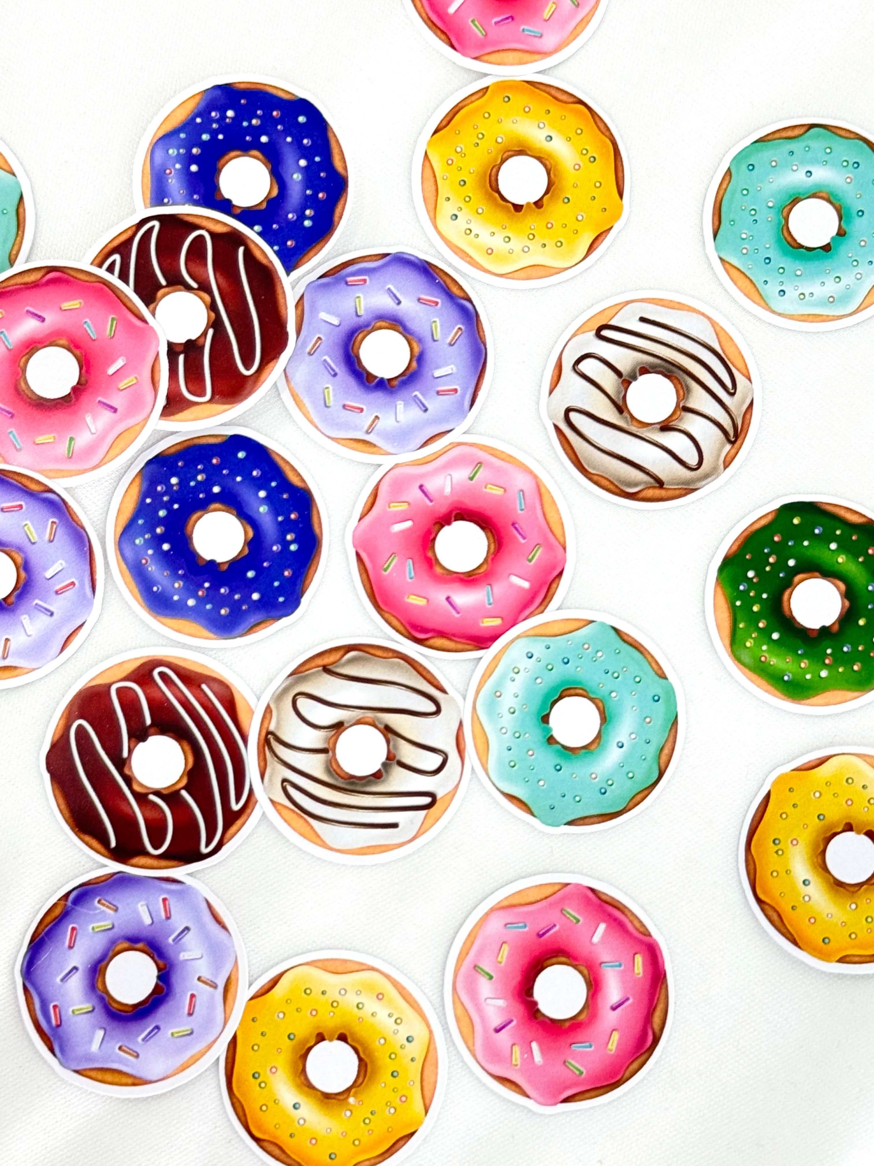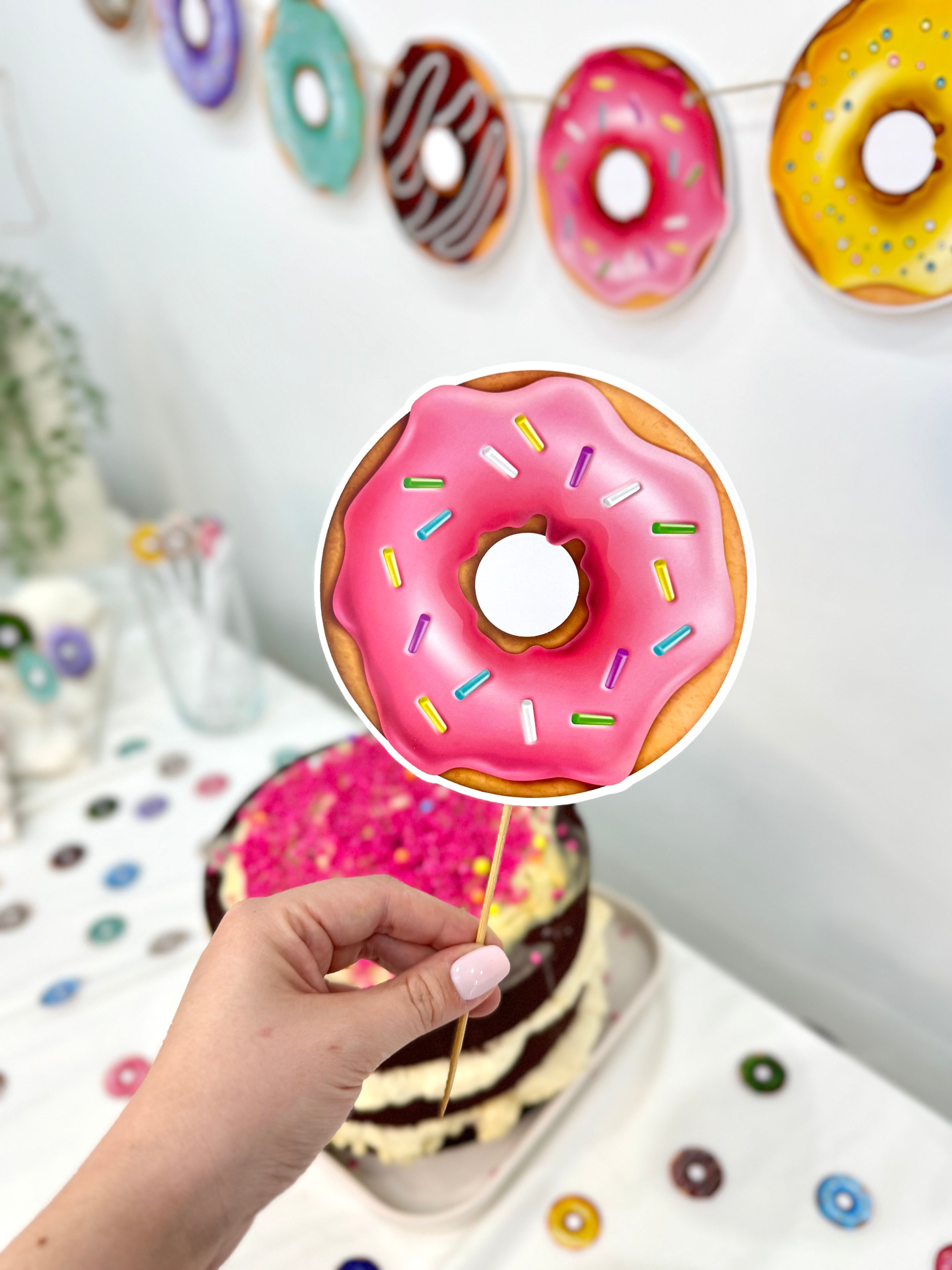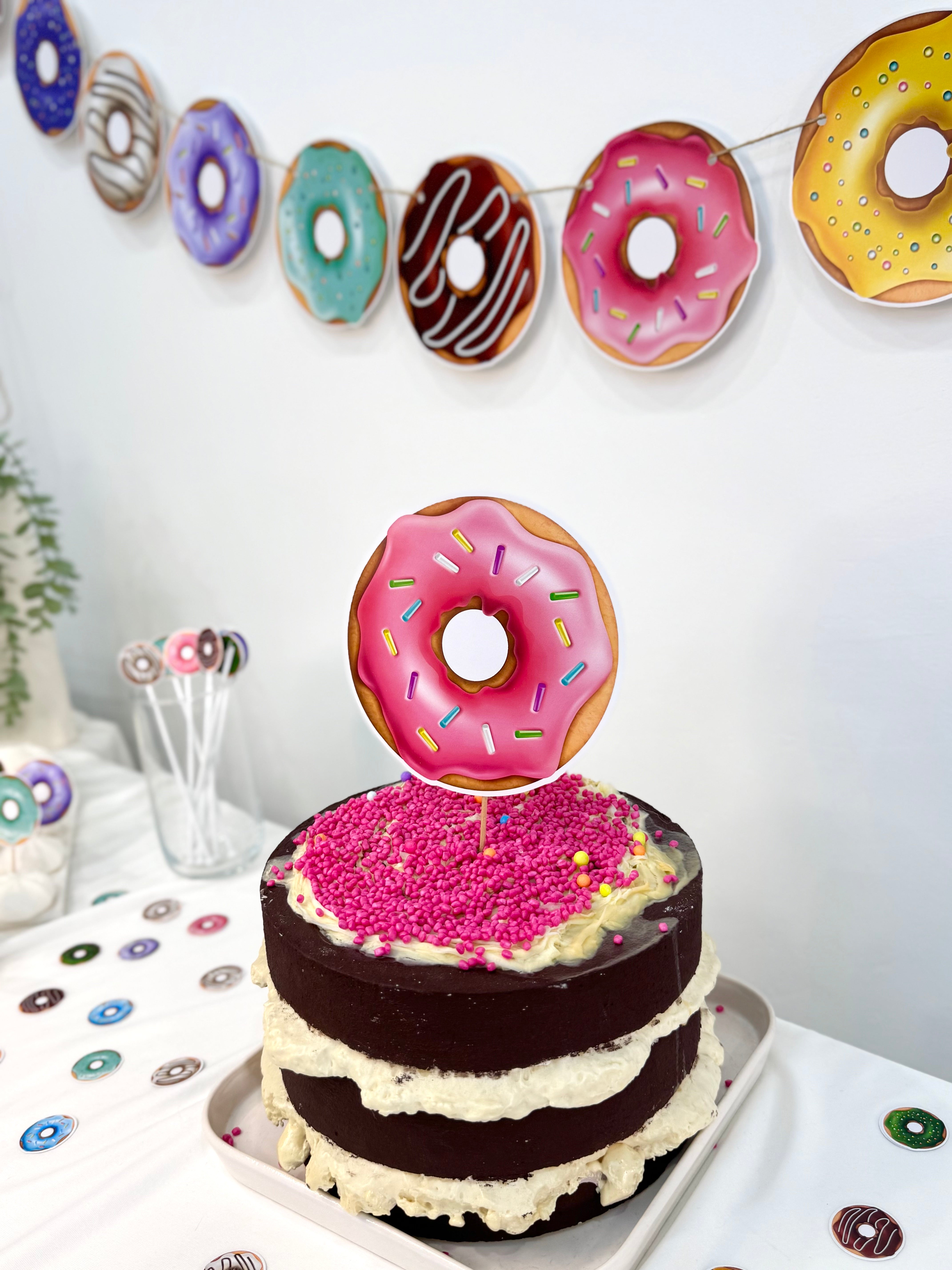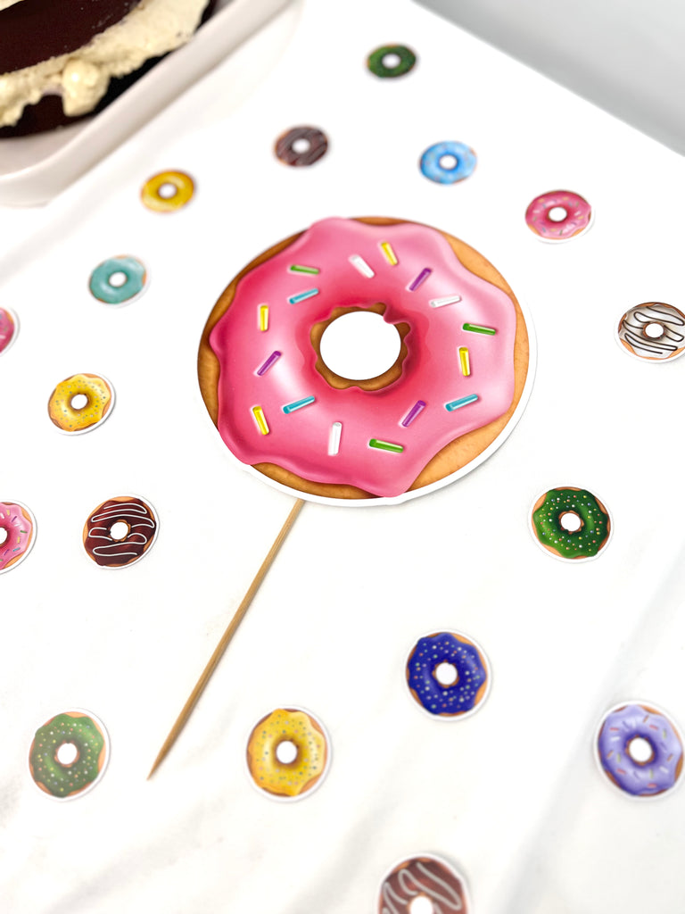 Canlı renkli donut baskılı bu pasta üstü süs, doğum günü ve tatlı temalı partilere eğlenceli bir dokunuş katar. Dayanıklı kağıt malzeme, parlak baskı ve kolay kullanım.