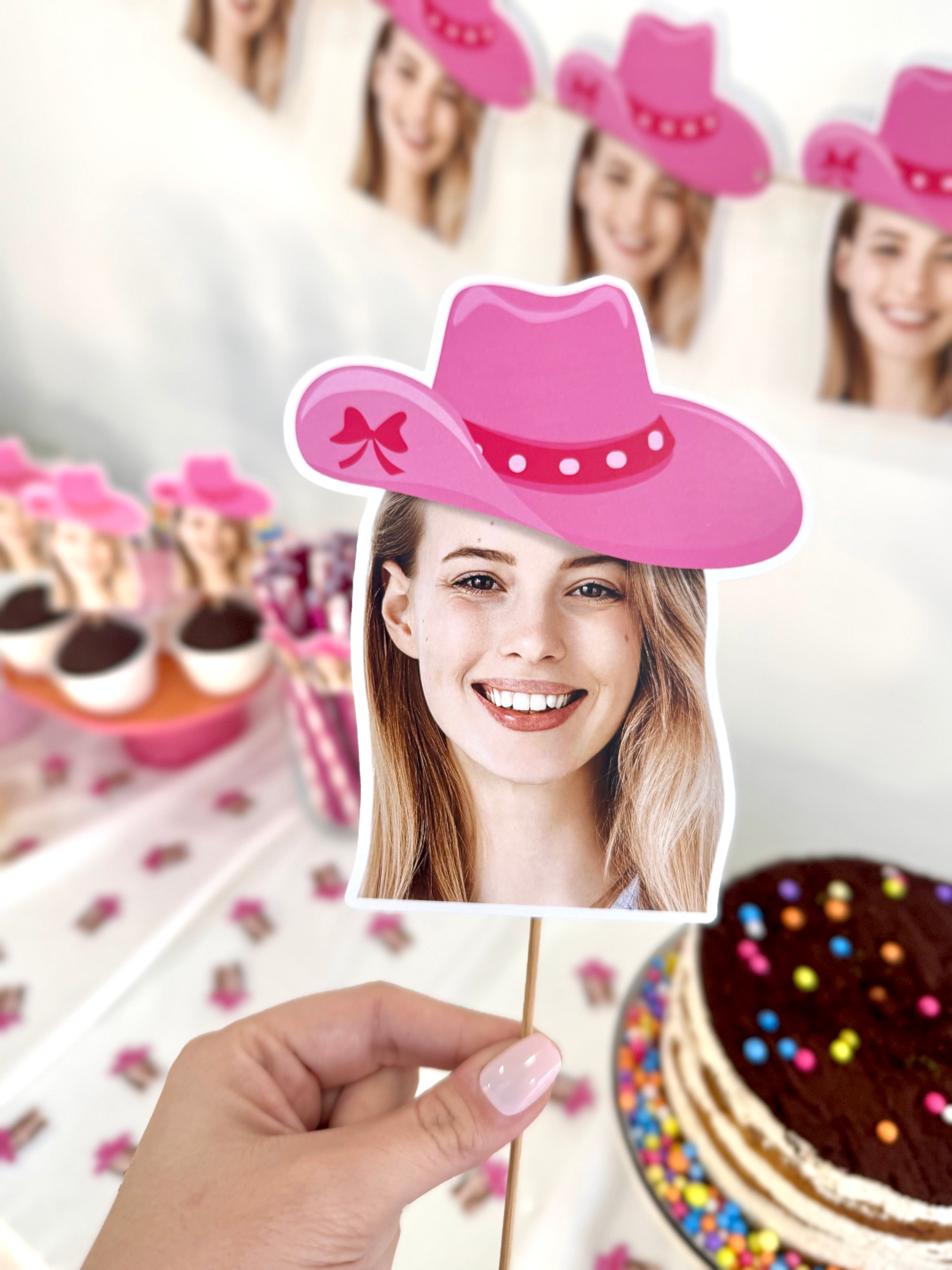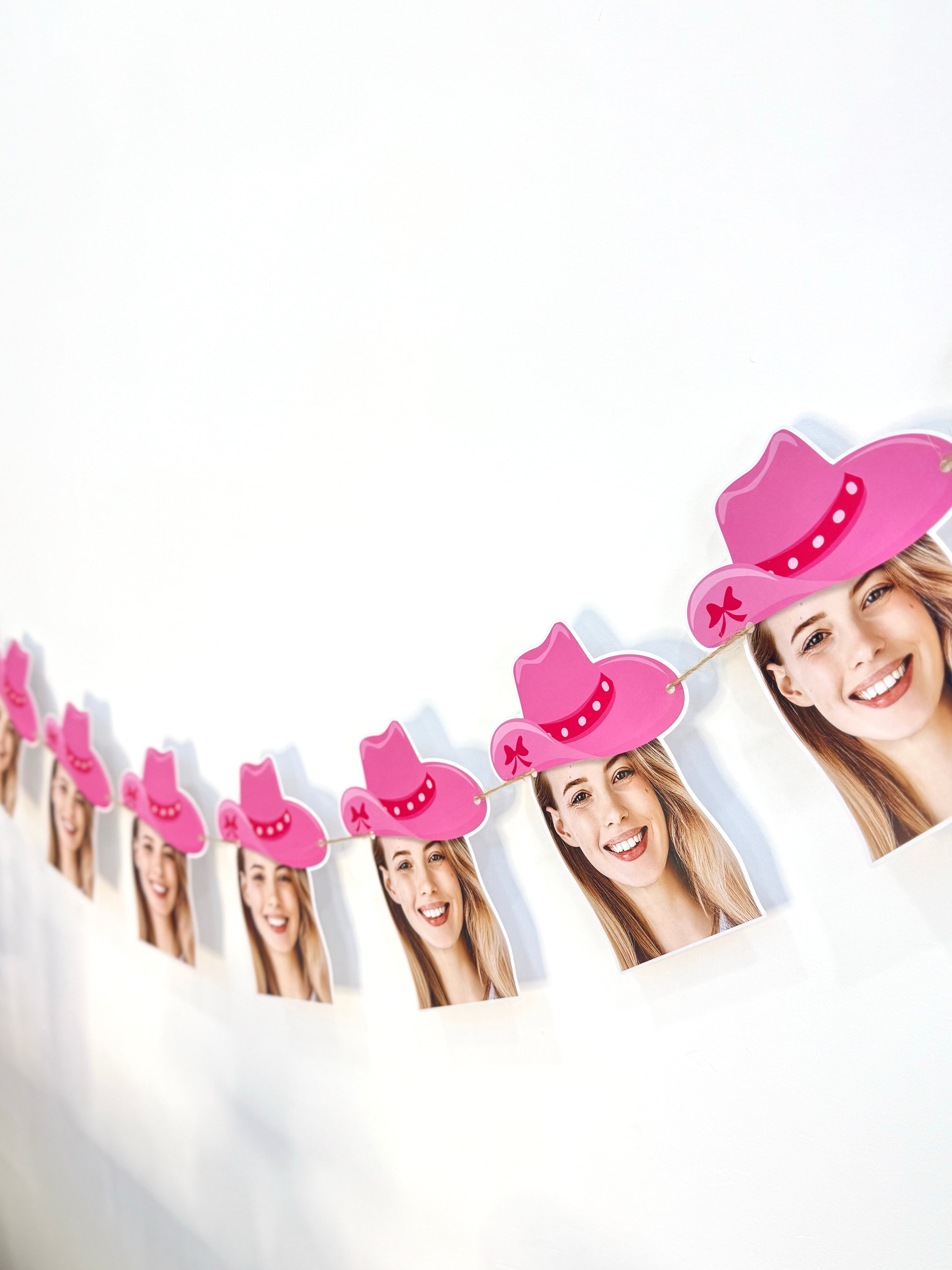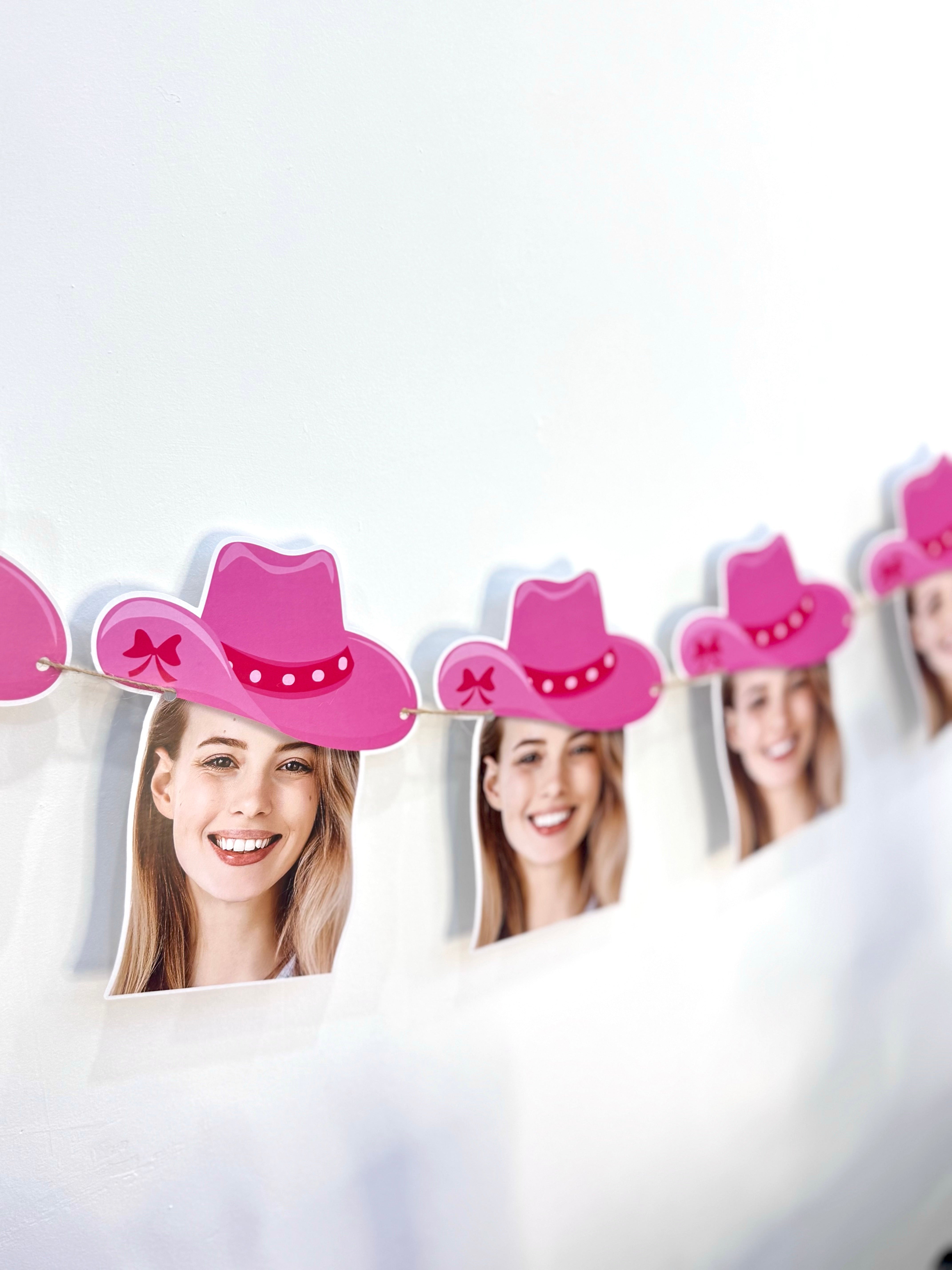 Kişiye özel fotoğrafla hazırlanan pembe kovboy şapkalı banner, bekarlığa veda partinize eğlenceli ve unutulmaz bir dokunuş katar.