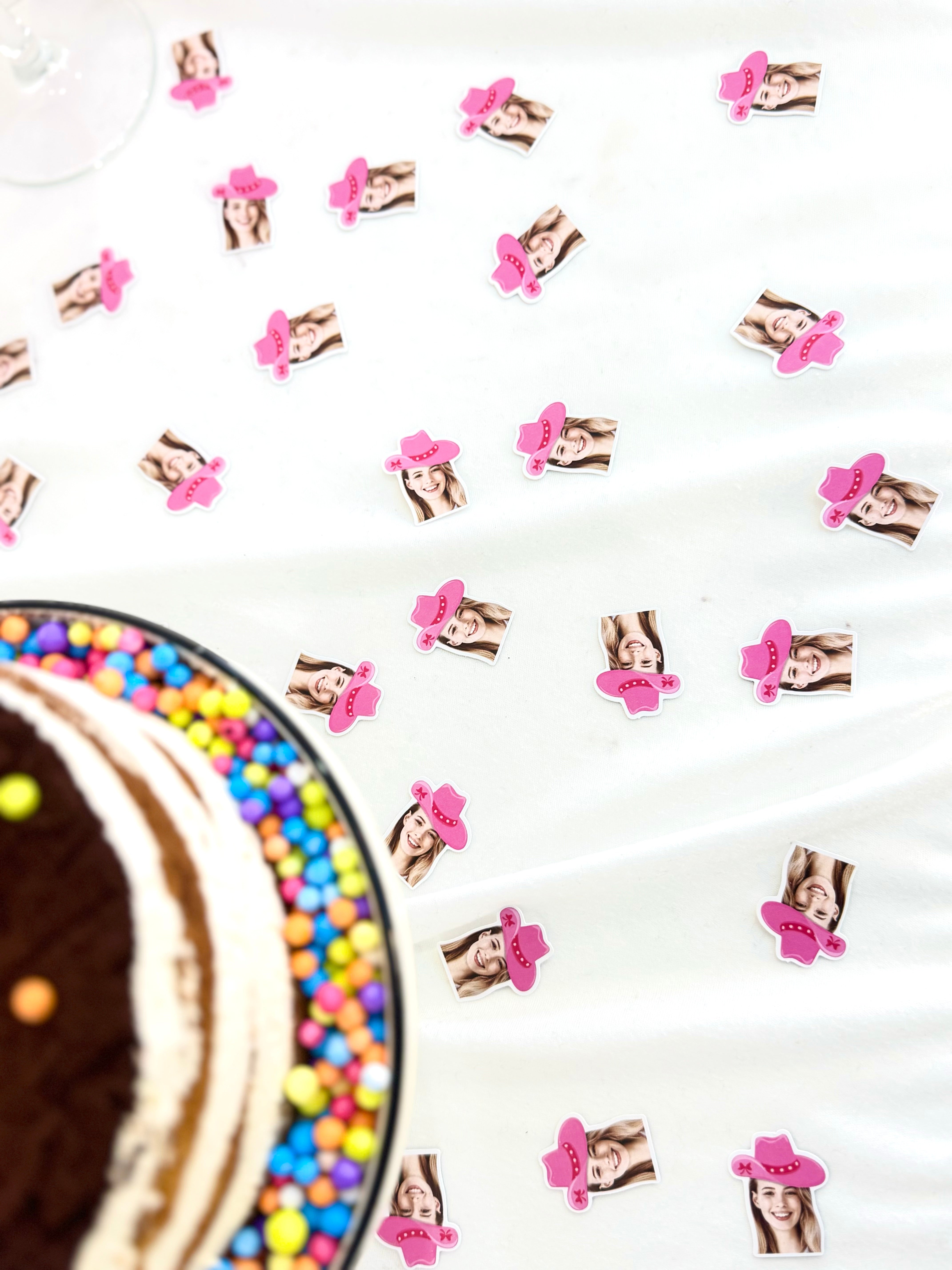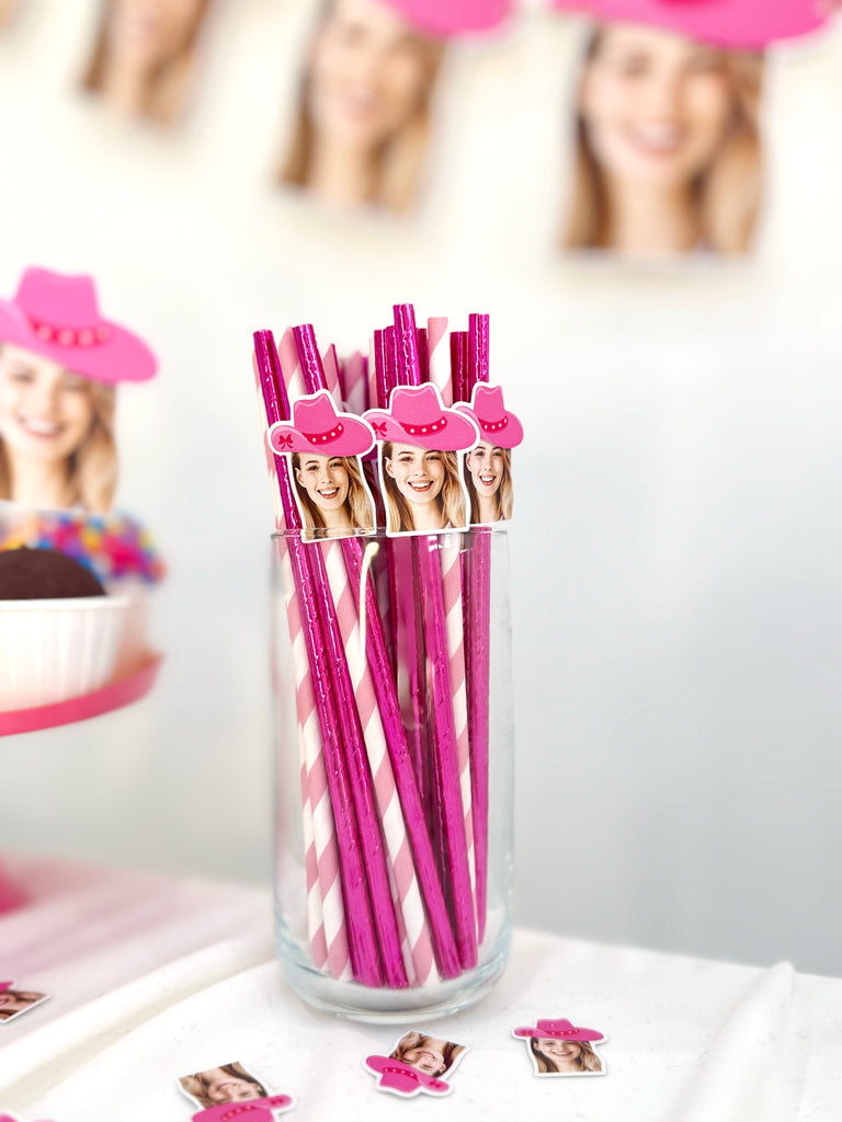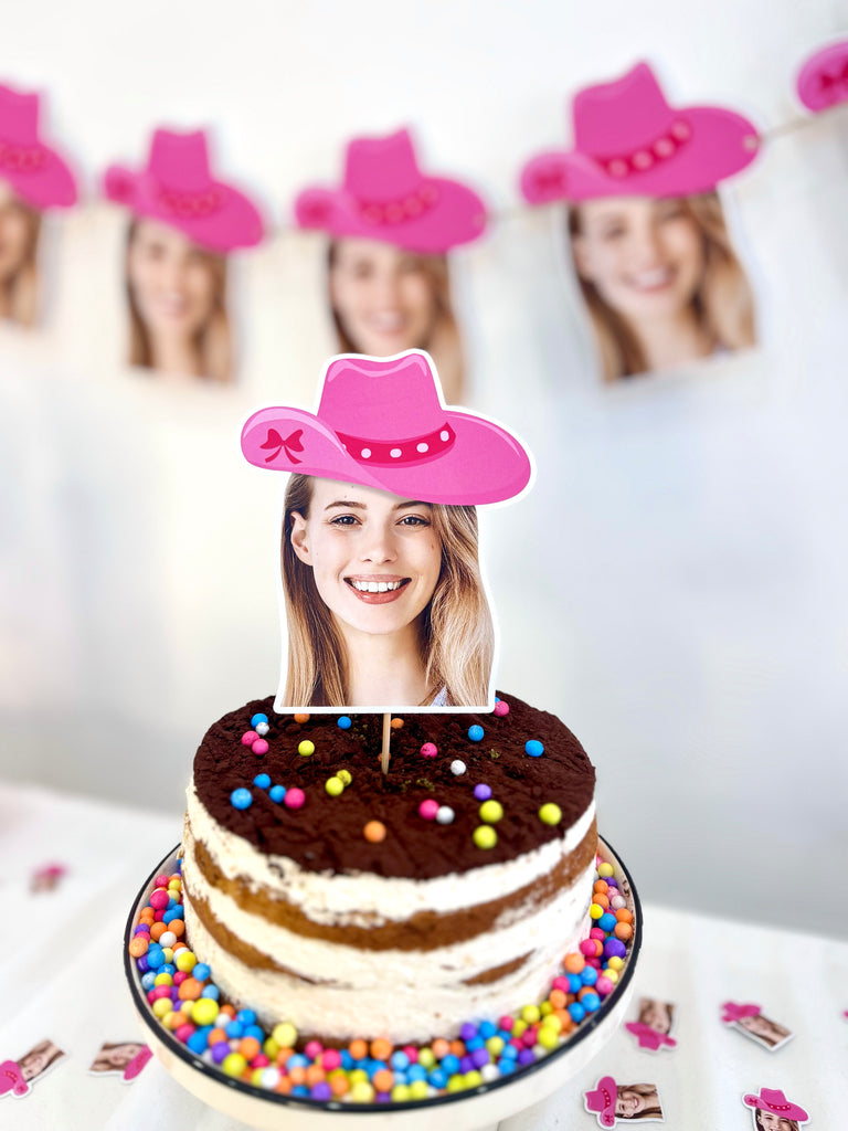 Kişiye özel fotoğrafla hazırlanan pembe kovboy şapkalı banner, bekarlığa veda partinize eğlenceli ve unutulmaz bir dokunuş katar.