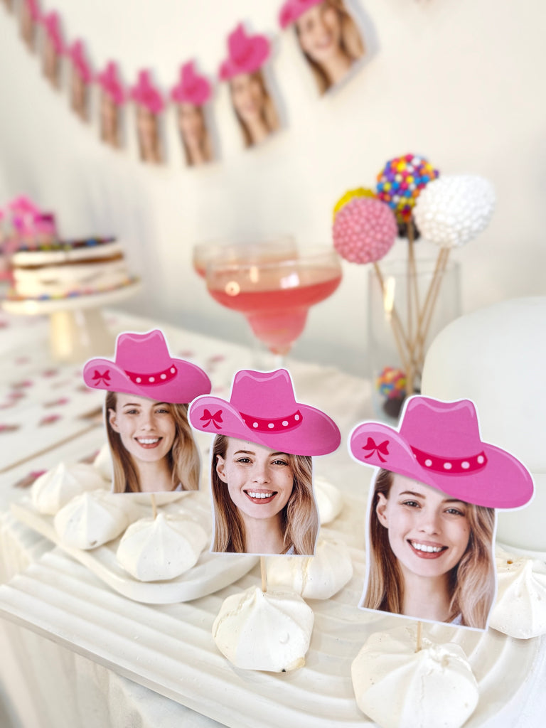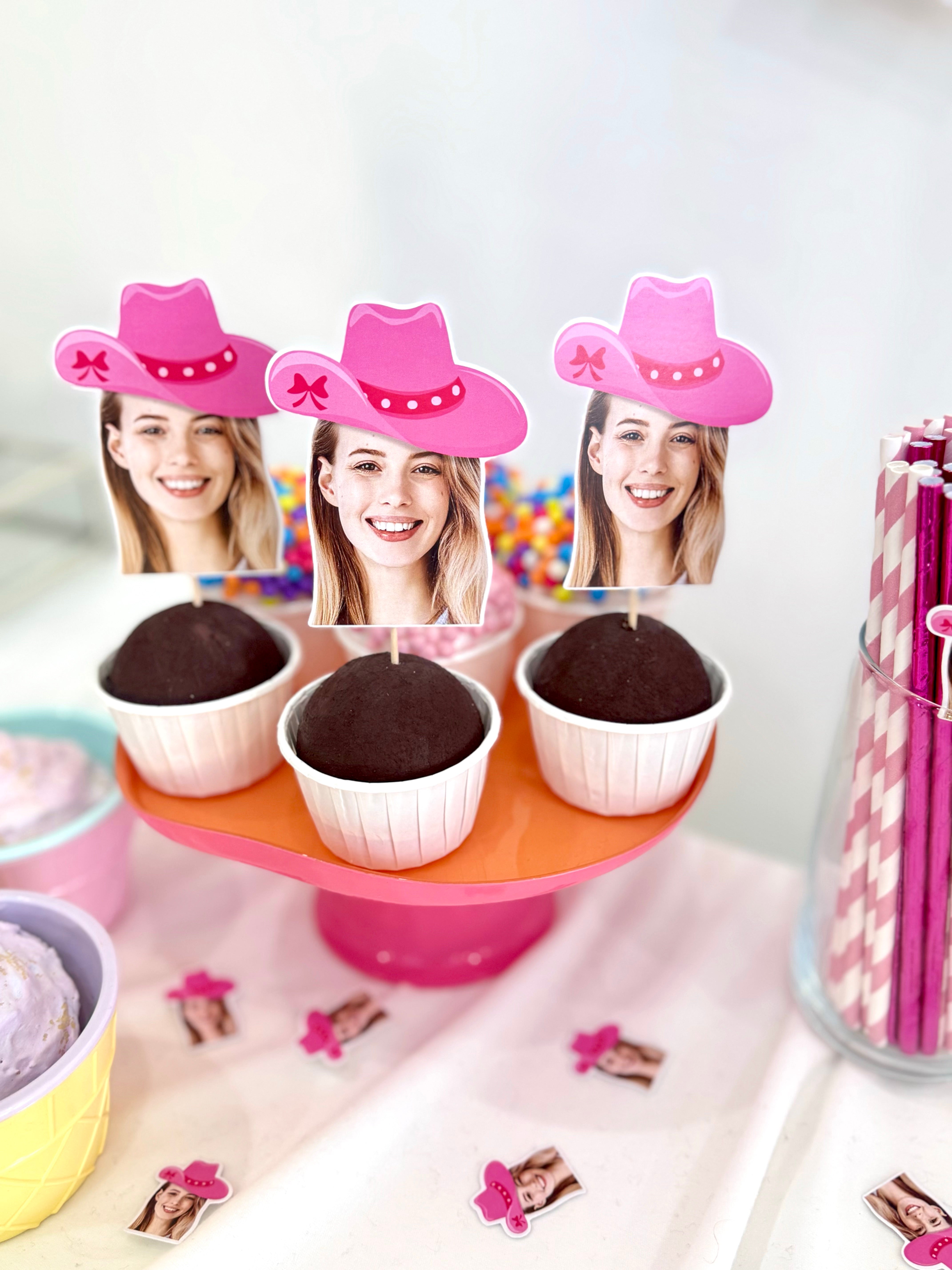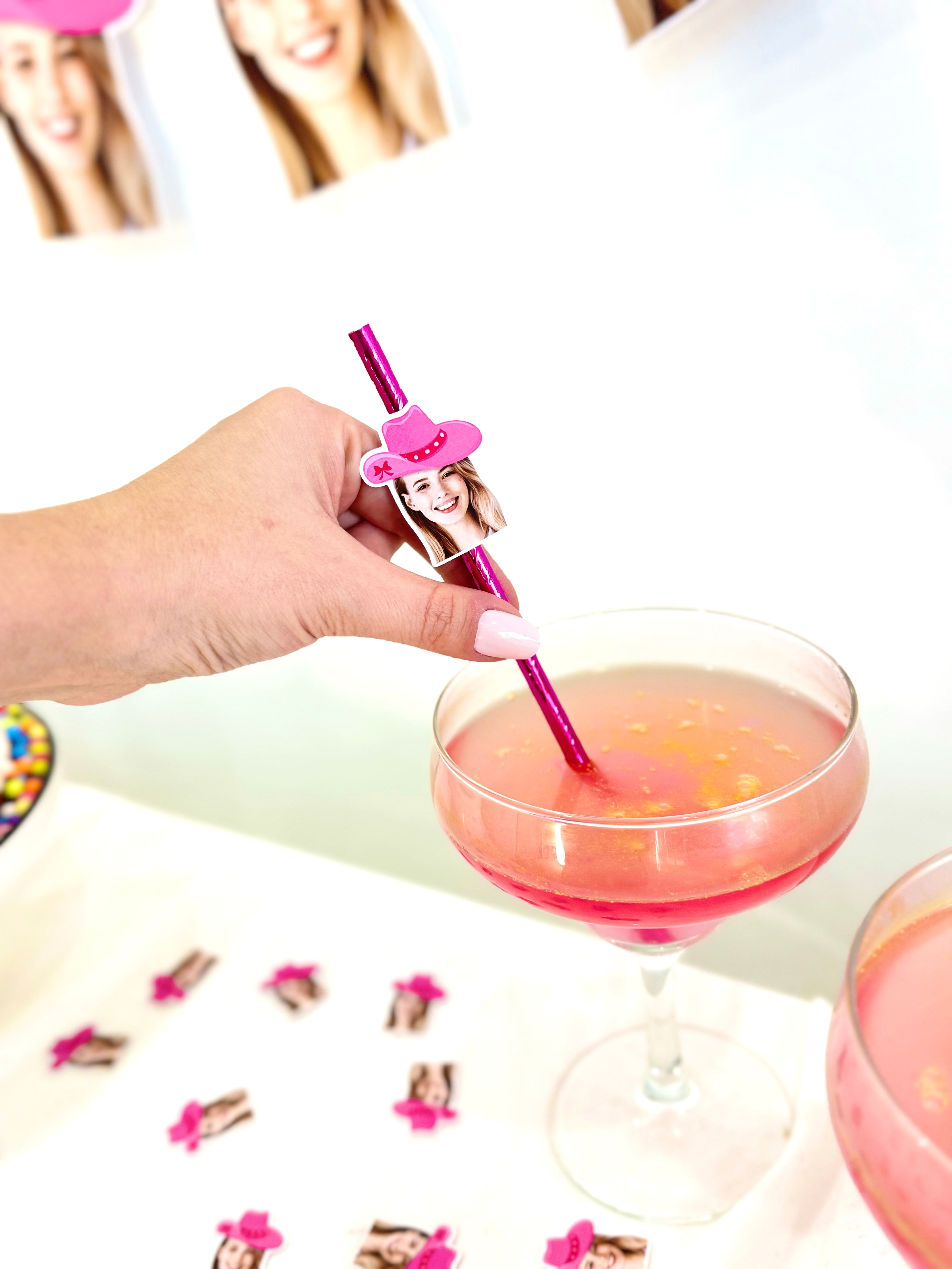 Pembe kovboy şapkalı ve kişiye özel pipet süsleriyle içecek sunumlarınız parti ruhunu tamamlar.
