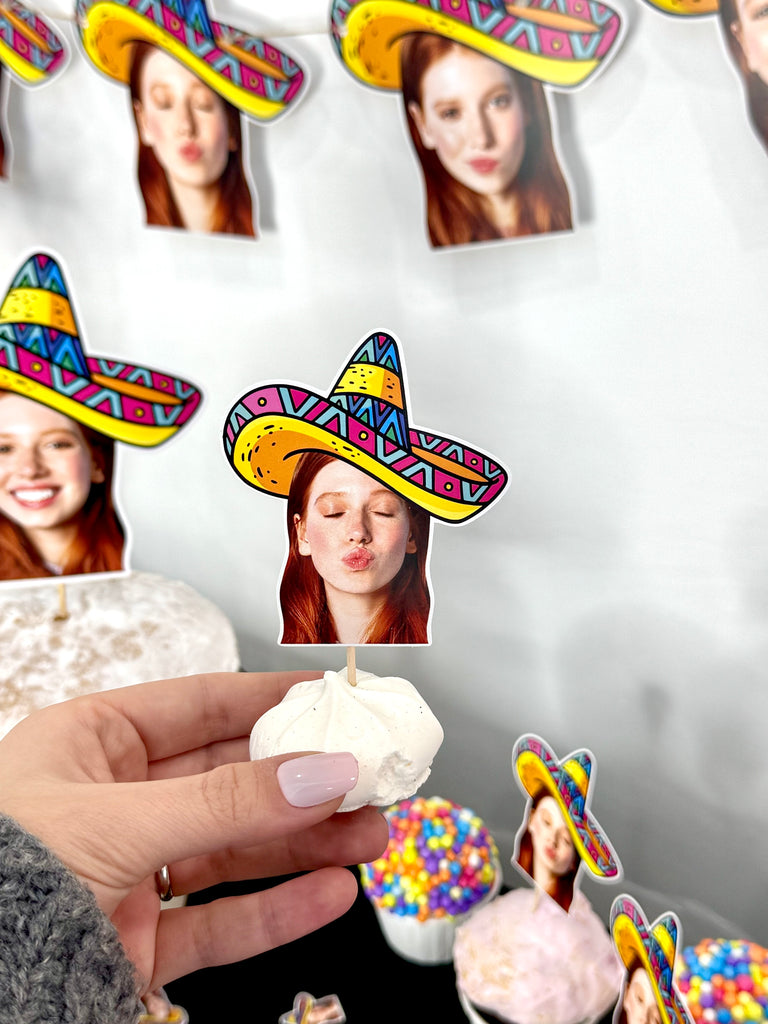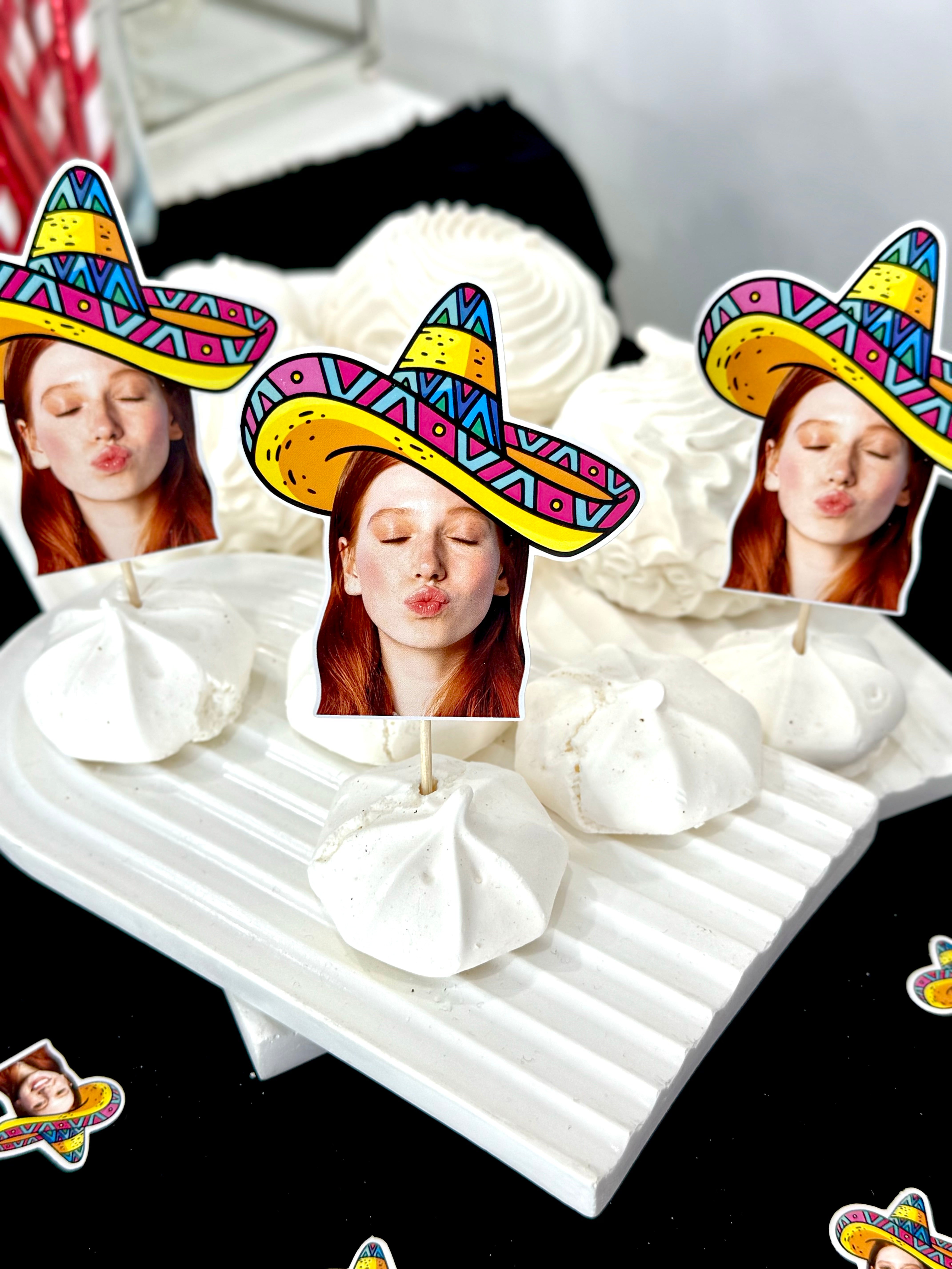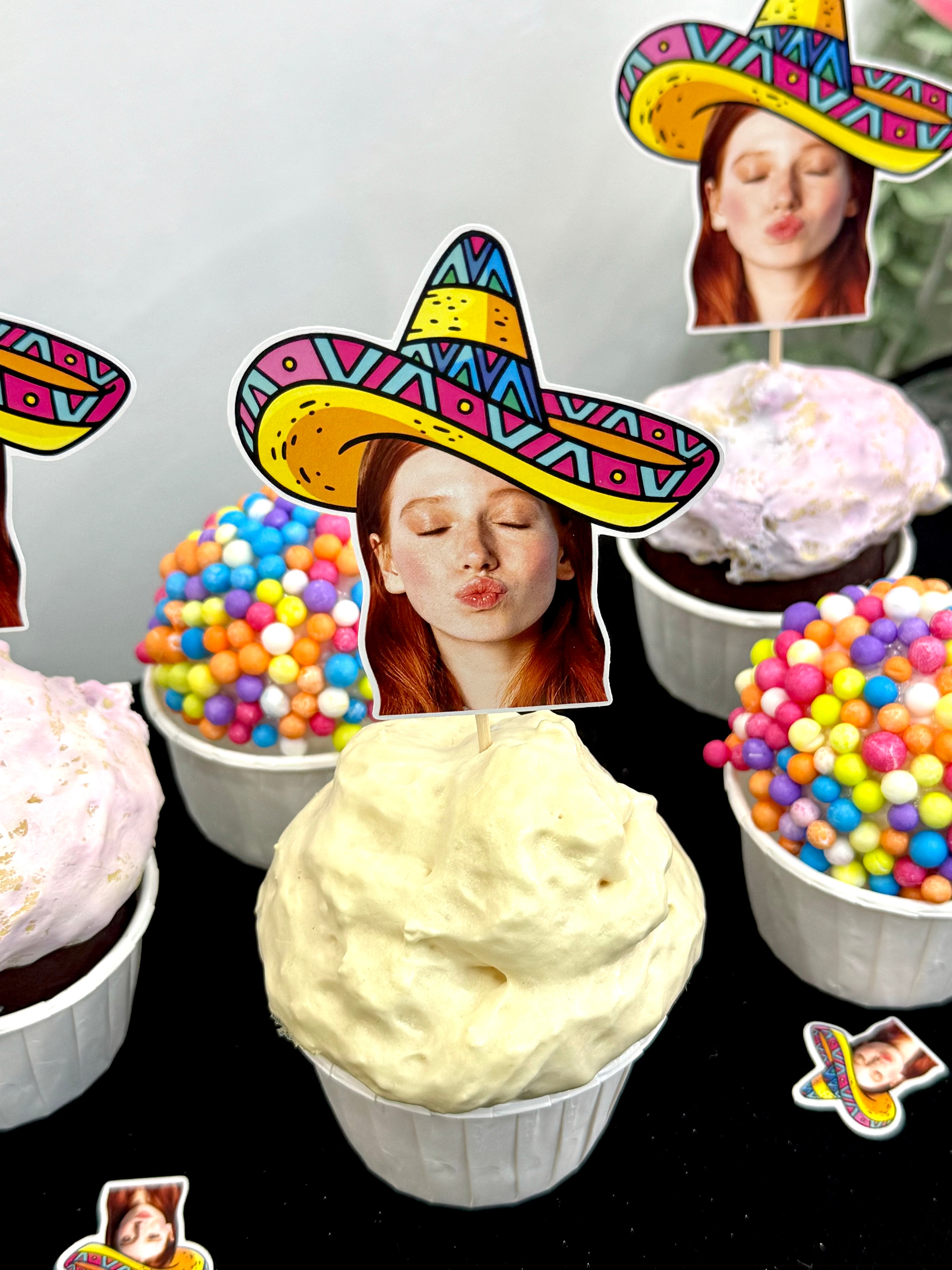 Kişiye özel fotoğrafla hazırlanan sombrero şapkalı cupcake süsleri, parti masanıza renk, enerji ve bol kahkaha getirir.