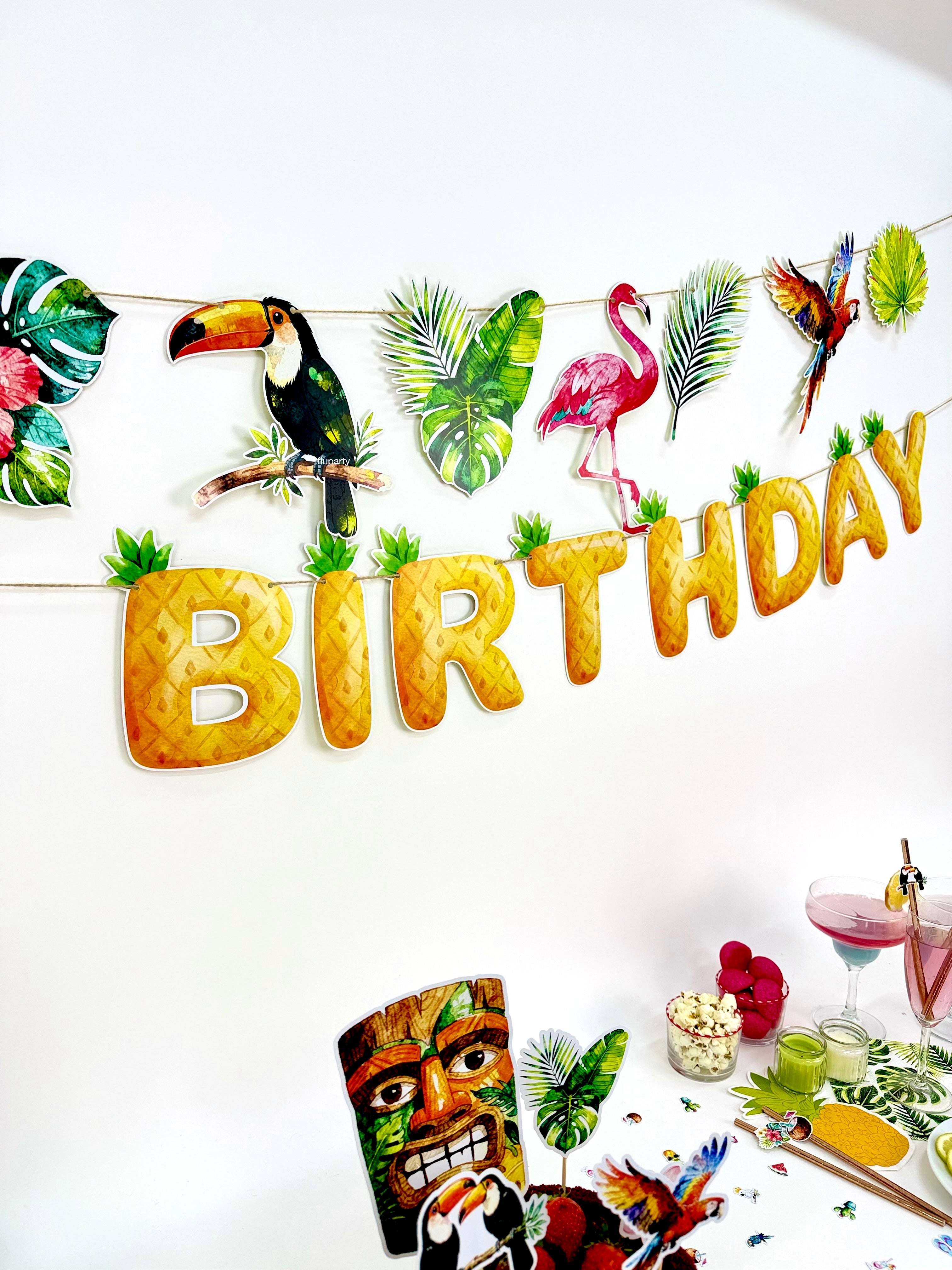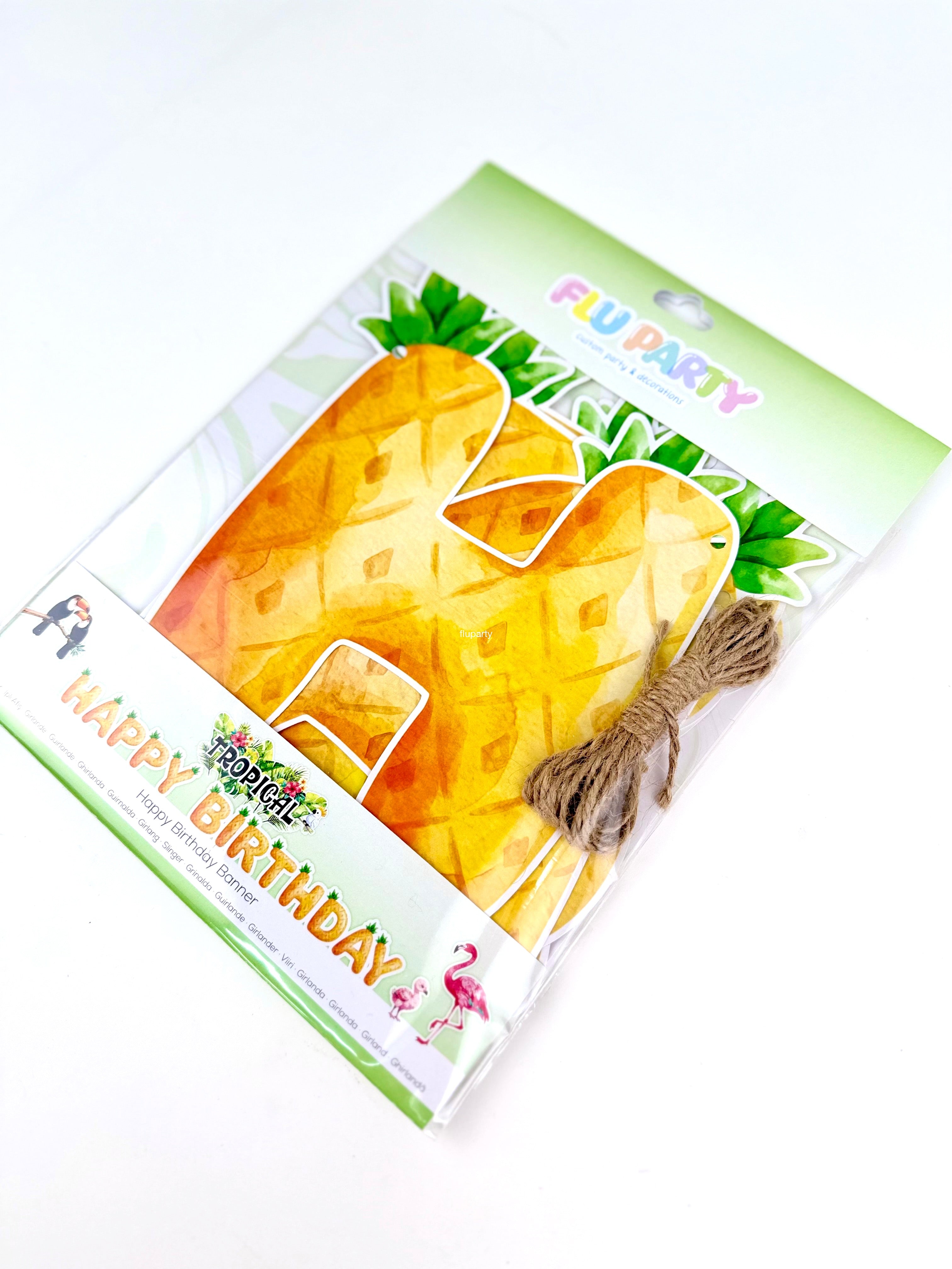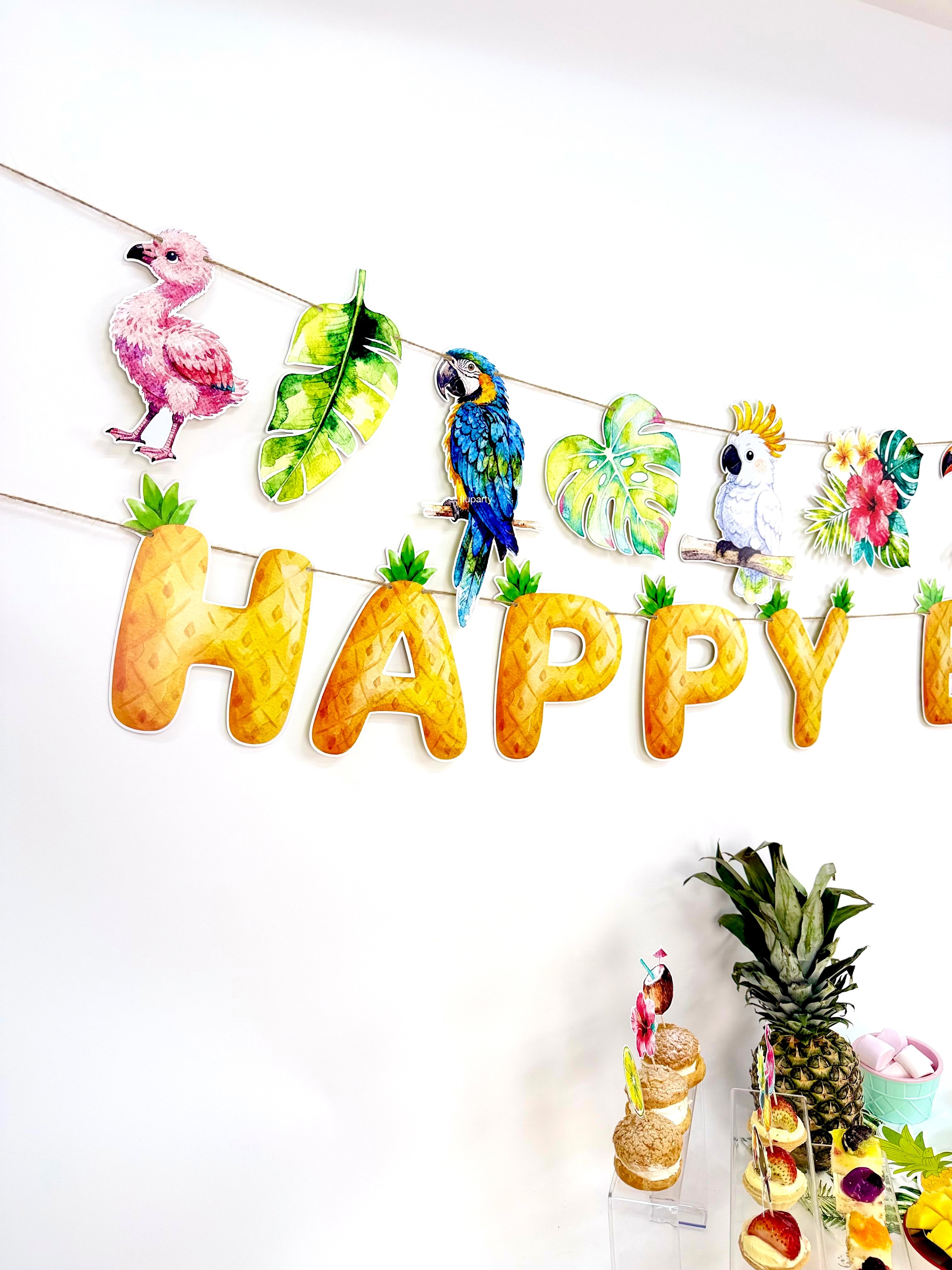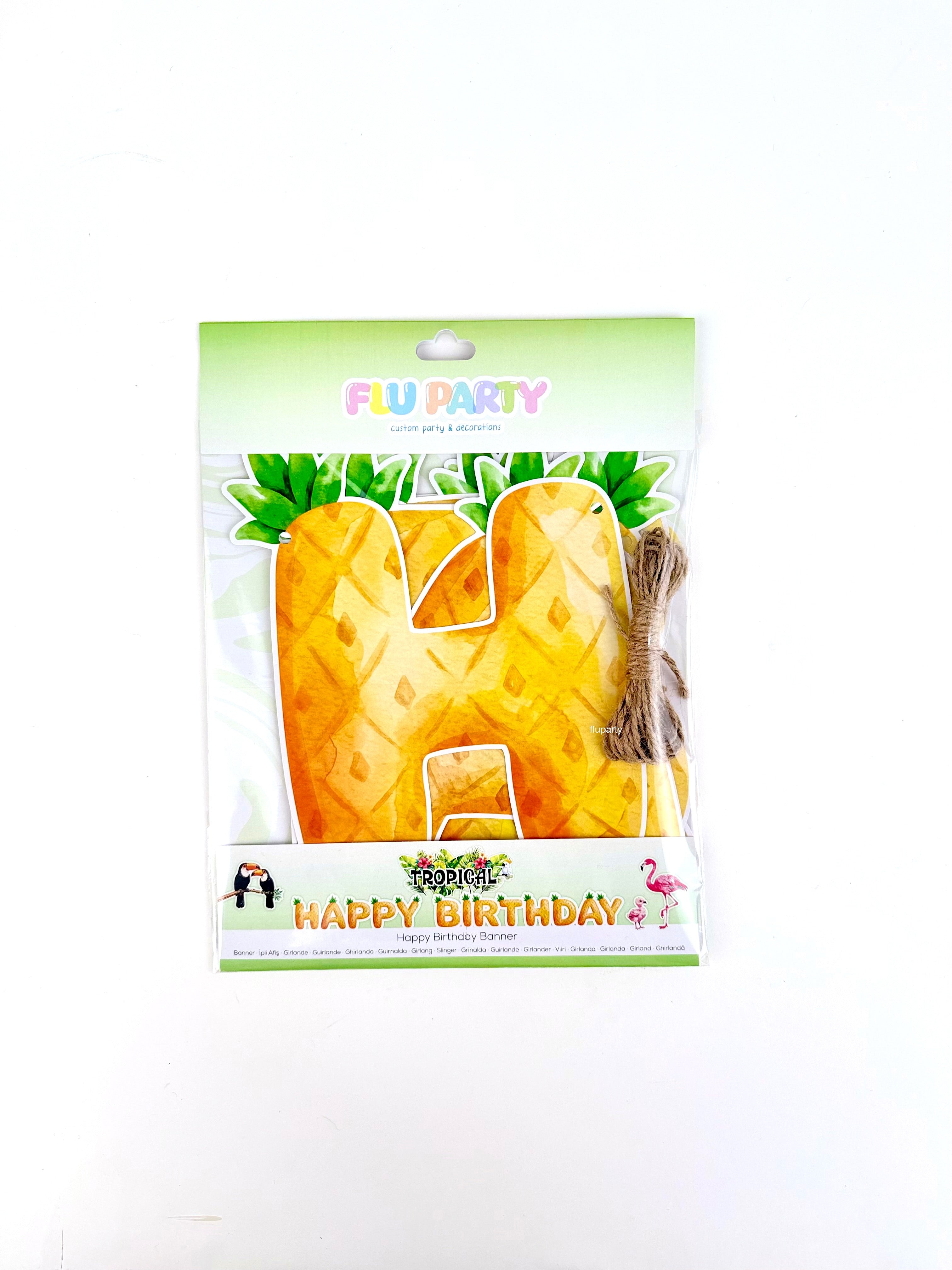 Tropical temalı bu Happy Birthday banner, ananas dokulu harf tasarımı ve tropikal detaylarıyla fotoğraflarda mesajı net şekilde öne çıkarır.; Duvara, masa arkasına veya arka fon alanına kolayca asılabilir; tropikal konsepti tek başına bile güçlü gösterir. Diğer tropical süslerle birlikte kullanıldığında dekorasyonu bütünler.